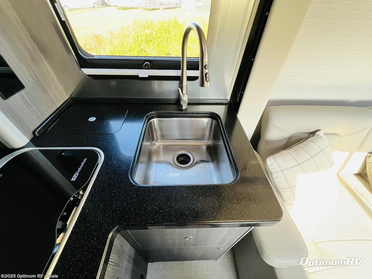 Get ready to explore, unwind and "glamp" where ever you decide! This coach brings you everything you will need, plus much much more! The power slide offers a Murphy suite that retracts and fits seamlessly with the luxury automotive body style. With a touch of a button on the multiplex control panel, you will have more floor space to relax on the reclining sofa that includes two seatbelts or pull down the Murphy bed at night. There is more seating on the captain's chairs that swivel around to face the interior, and there are two tables that adjust to different heights for your needs. The kitchen provides a two-burner gas stove and large stainless steel Kohler sink and faucet, and there is a convection microwave, a slide-out pantry and a refrigerator with freezer a few steps away.
