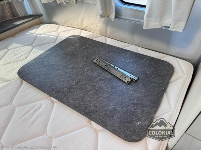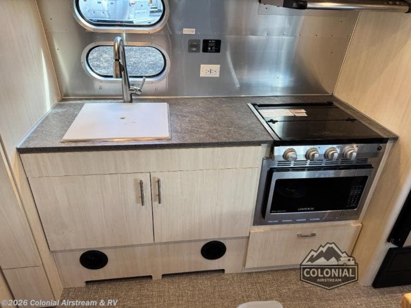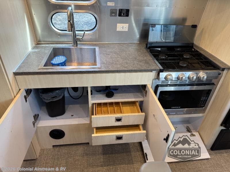 With each Flying Cloud travel trailer by Airstream, there are two axles, and each is built for ease of towing, plus there is a rear-view camera to make reversing and parking easier, and stainless steel front stone guards to protect the lower segments from road debris. The iconic Airstream design is created outside and inside by the semi-monocoque aluminum superstructure, the temperature reducing one-piece white aluminum roof, the panoramic front windows, and the stylish aluminum wheels. And almost every interior wall surface is covered in aluminum, giving the living space a clean and sophisticated appearance, even the appliances and sinks are stainless.