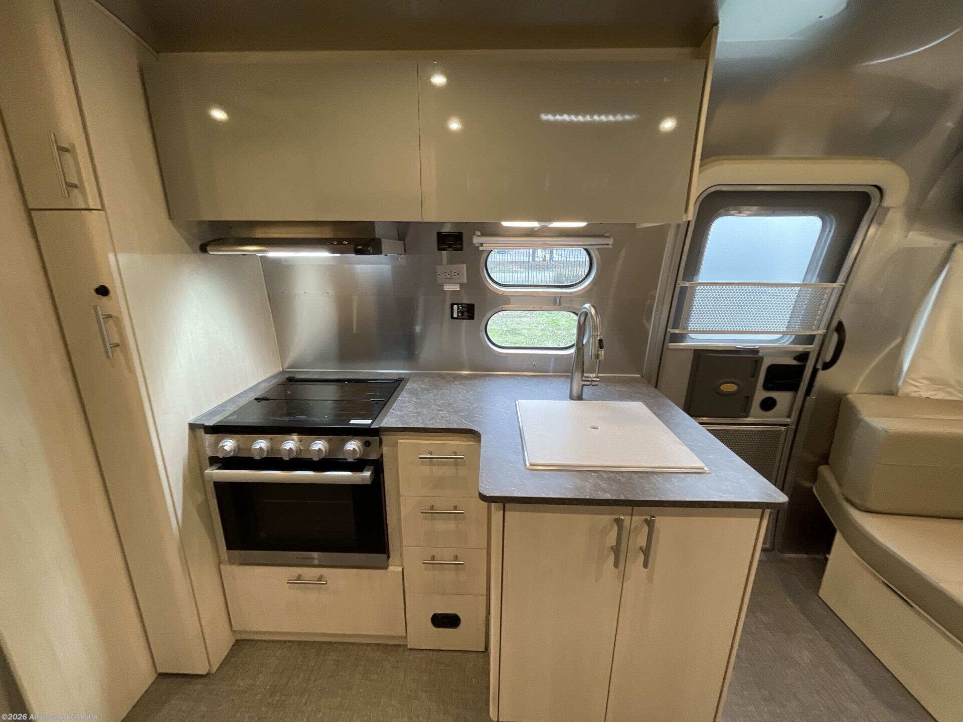 With each Flying Cloud travel trailer by Airstream, there are two axles, and each is built for ease of towing, plus there is a rear-view camera to make reversing and parking easier, and stainless steel front stone guards to protect the lower segments from road debris. The iconic Airstream design is created outside and inside by the semi-monocoque aluminum superstructure, the temperature reducing one-piece white aluminum roof, the panoramic front windows, and the stylish aluminum wheels. And almost every interior wall surface is covered in aluminum, giving the living space a clean and sophisticated appearance, even the appliances and sinks are stainless.