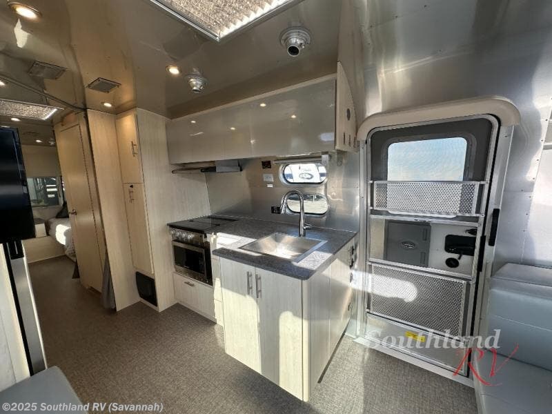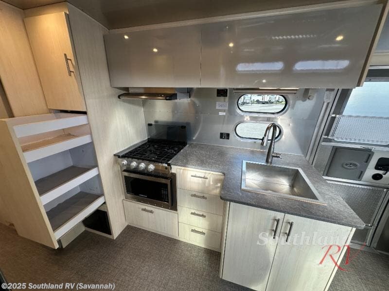 With each Flying Cloud travel trailer by Airstream, there are two axles, and each is built for ease of towing, plus there is a rear-view camera to make reversing and parking easier, and stainless steel front stone guards to protect the lower segments from road debris. The iconic Airstream design is created outside and inside by the semi-monocoque aluminum superstructure, the temperature reducing one-piece white aluminum roof, the panoramic front windows, and the stylish aluminum wheels. And almost every interior wall surface is covered in aluminum, giving the living space a clean and sophisticated appearance, even the appliances and sinks are stainless.