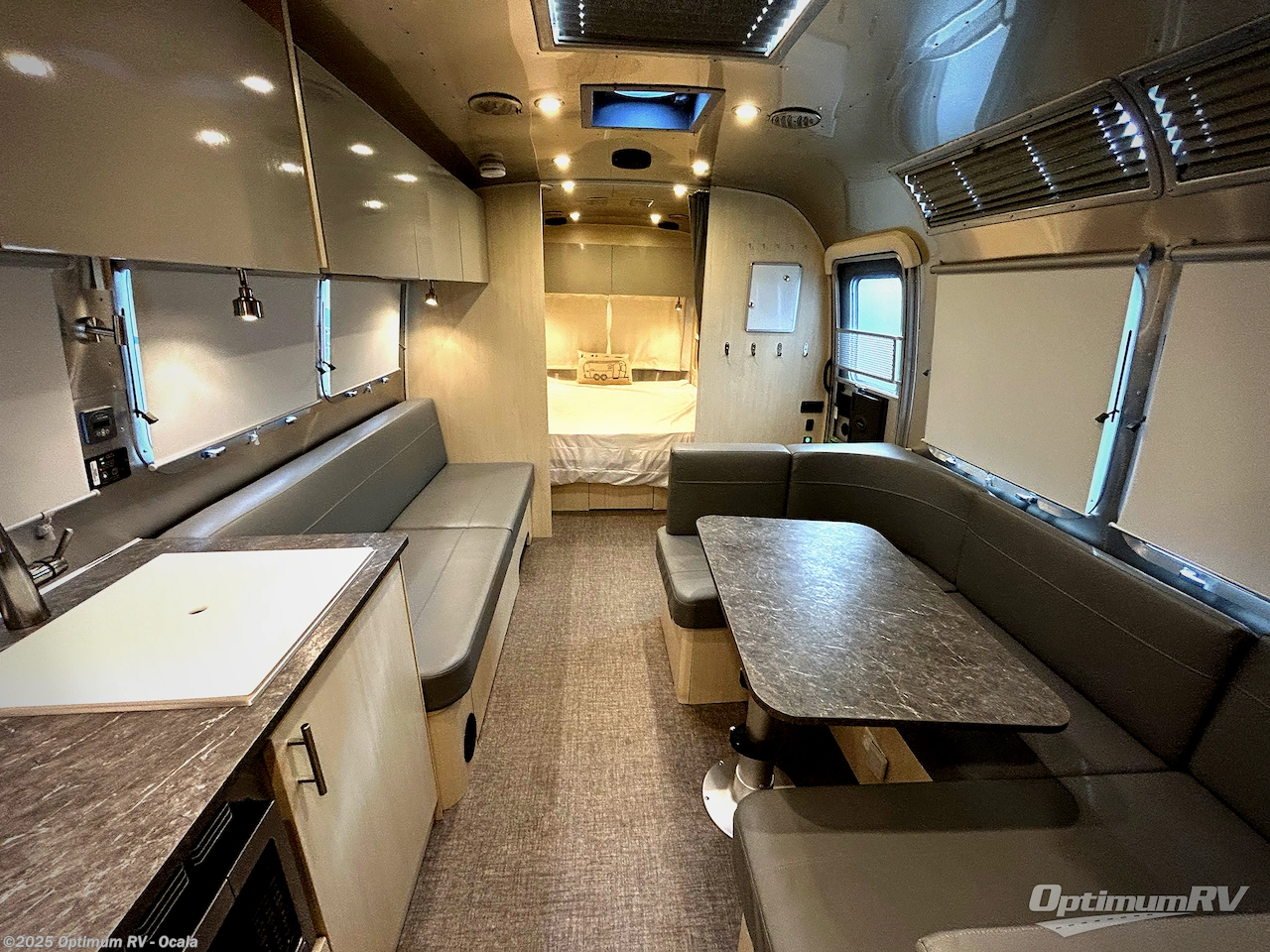 Looking for maximum interior space, a place for eight to sleep at night, plus plenty of storage for your big group? This trailer offers all of that plus so much more! The front private bedroom offers a queen bed with storage on each side and above the head of the bed to keep your clothing wrinkle free, and extra blankets and stuff nearby. The main living and kitchen area offers a U-shaped dinette for total comfort when dining, playing games and visiting with everyone. And the sofa offers more relaxation seating, while both furnishings provide extra sleeping space. The rear corner bunks offer a twin above a queen mattress that are designed to fit the curves of the Airstream perfectly. And the full bathroom will keep you refreshed, and the kitchen is loaded with everything you need to feed the group.