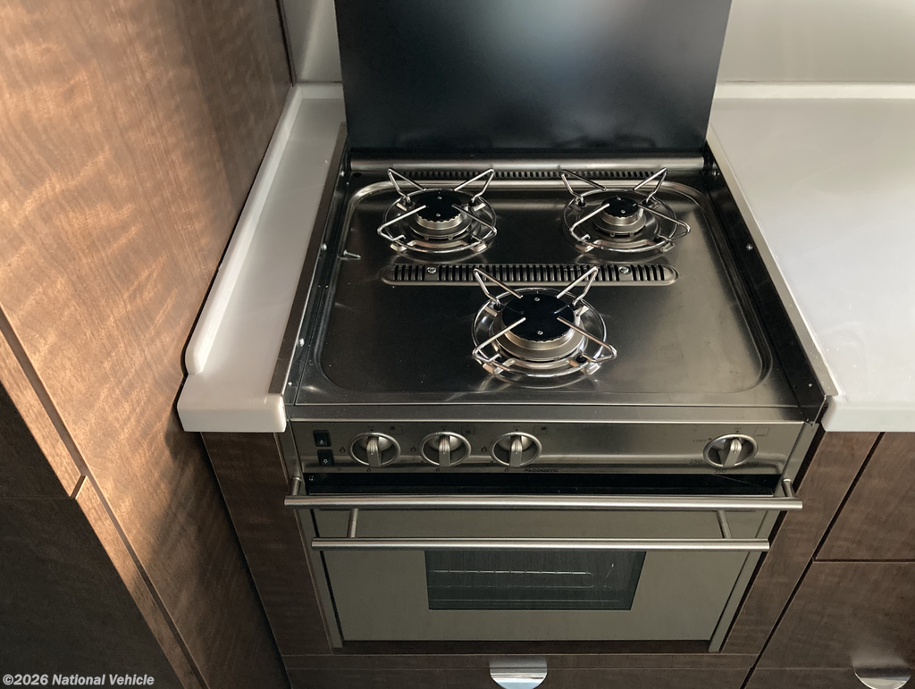 The mid-coach lounge and dinette area transforms easily into an additional sleeping space and serves as a comfortable retreat for dining or entertaining. The well-appointed galley kitchen includes solid-surface countertops, a three-burner gas stove, microwave, stainless-steel sink, and a large refrigerator, providing all the amenities of home in a compact, beautifully designed space.