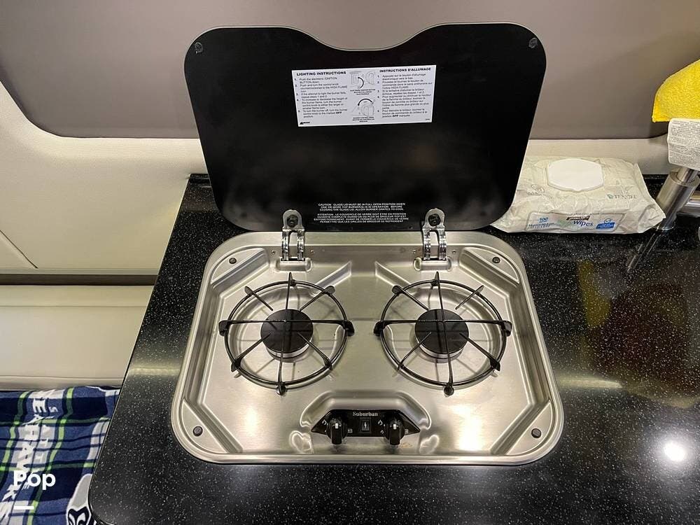 The kitchen packs a two-burner cooktop, microwave, sink, and a 5 cu. ft. fridge. A counter makes meal prep easy.