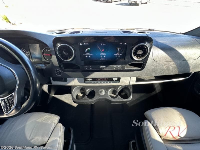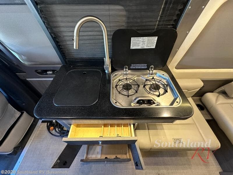 Your adventures are made complete in this nineteen foot coach that can sleep two comfortably. The improved Mercedes-Benz dashboard allows you to maneuver the road like a pro with user-friendly features and safety features. When you arrive at the campground, you can prepare lunch on the two burner gas cooktop, or use the convection microwave. There is also a slide out pantry and a 3.2 cu. ft. 12V refrigerator and freezer for your food storage. The rear sofa/bed and side seats convert to a lay-flat bed, giving you the largest best in its class, plus there is a convenient wet bath on board to stay clean throughout your trip.