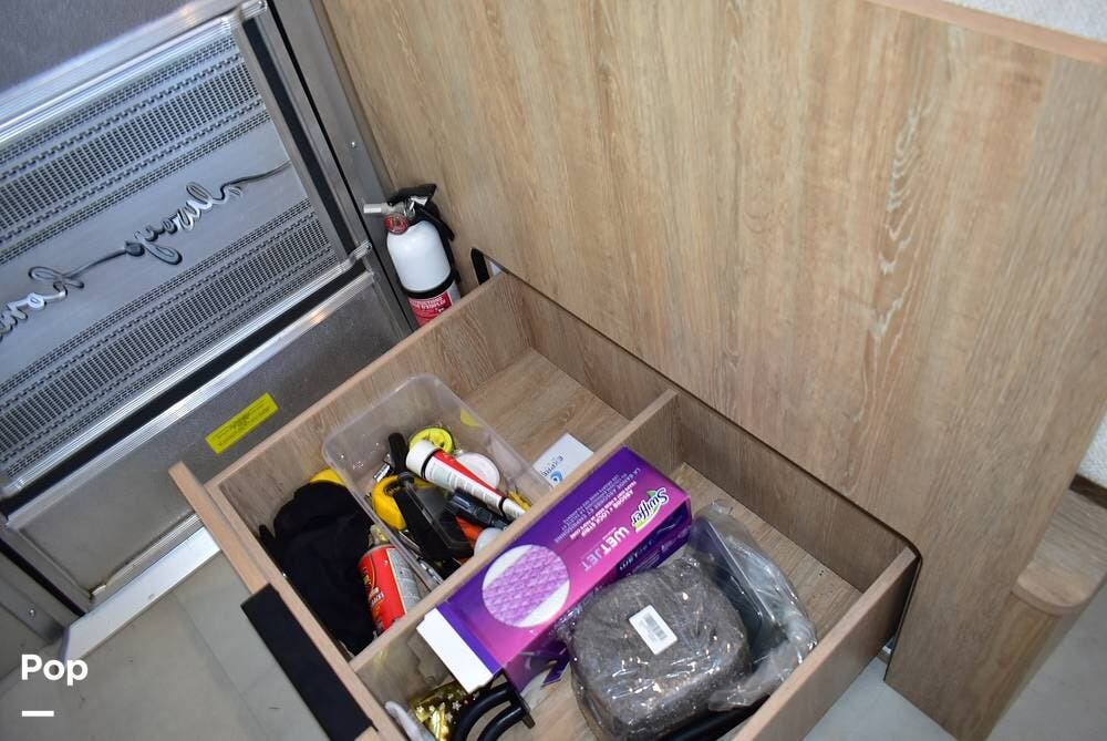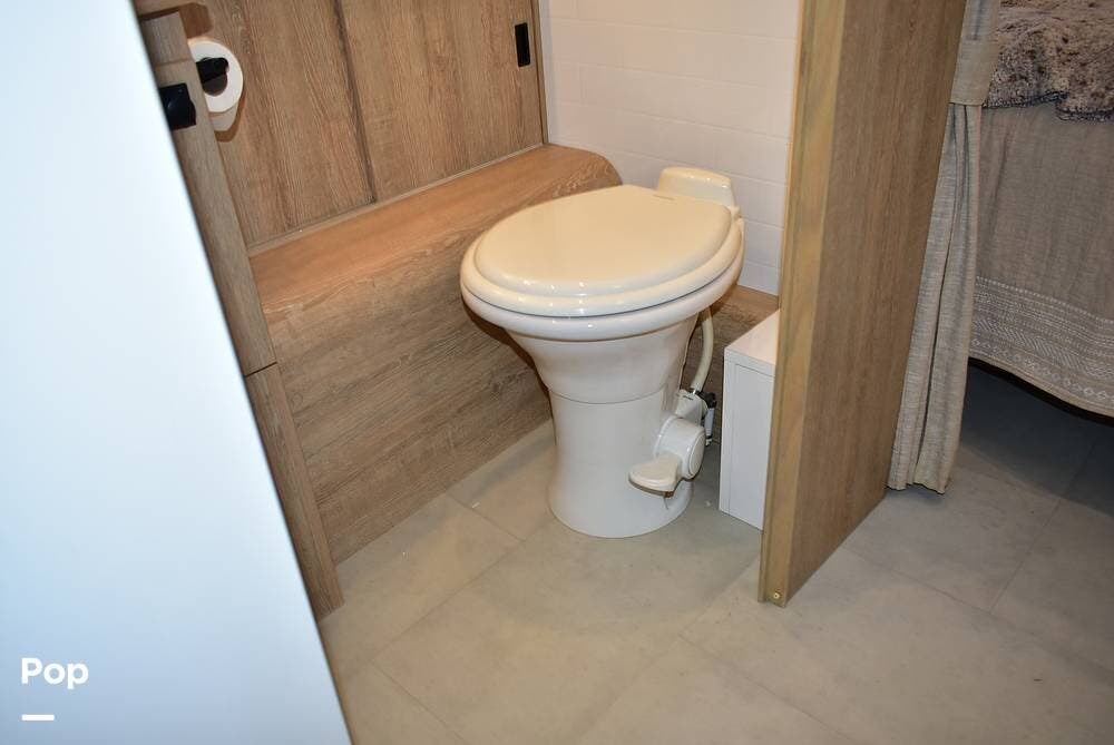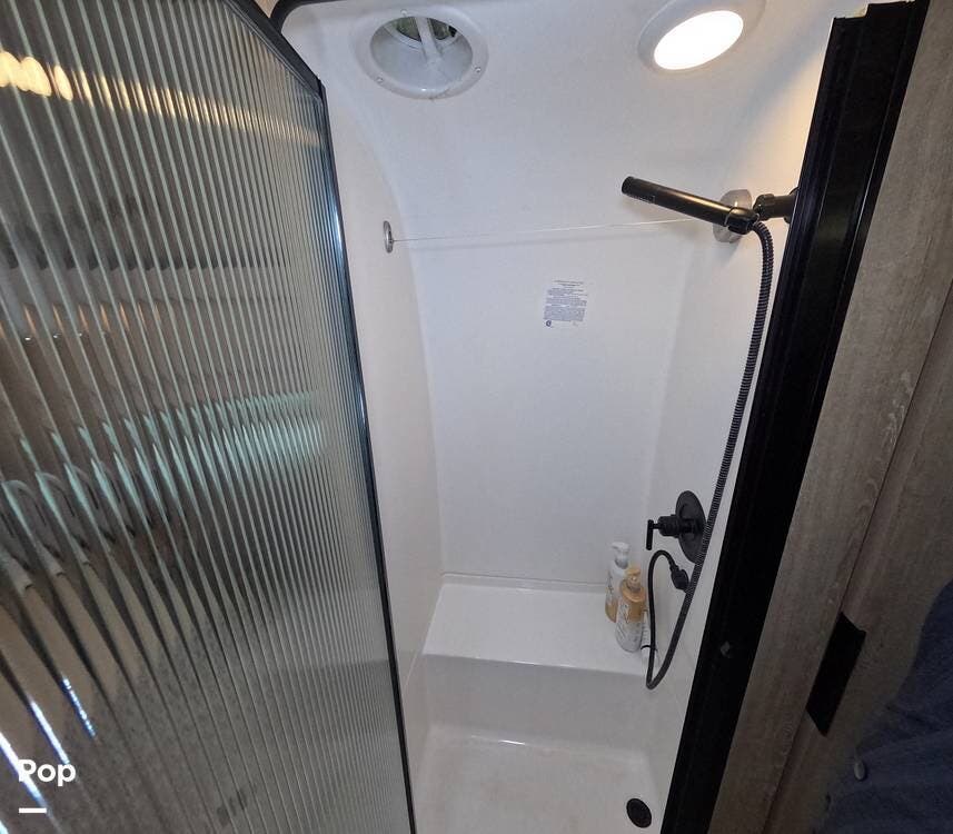 Enjoy upgraded Comfort White cabinetry, premium stainless steel appliances, a stylish farmhouse sink, and a well-appointed bath with a glass shower enclosure. The onboard technology package includes a solar charging system, power awning, smart thermostat, and backup camera for convenience and ease on the road.