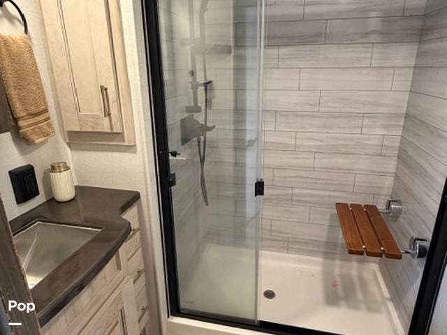 Up front, you'll find a private master bedroom with a king-size bed, good closet space, a washer, and a dryer. The bathroom has a roomy shower, sink, vanity, and additional storage space.