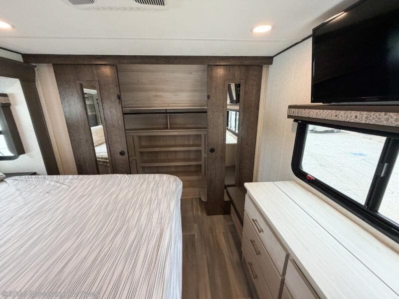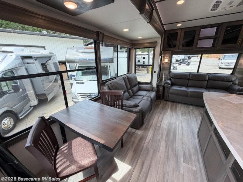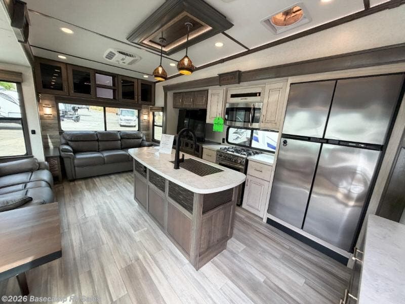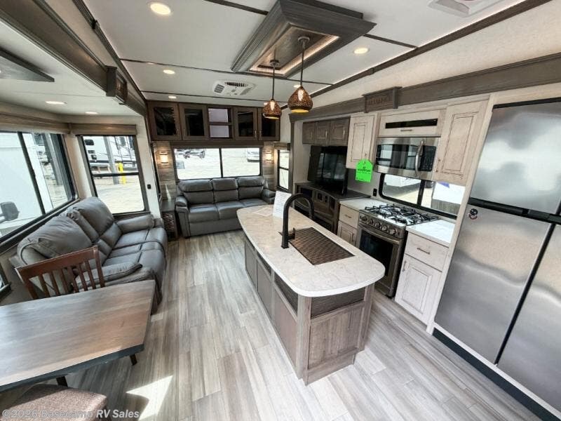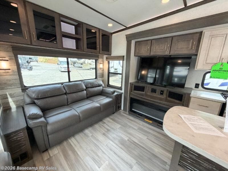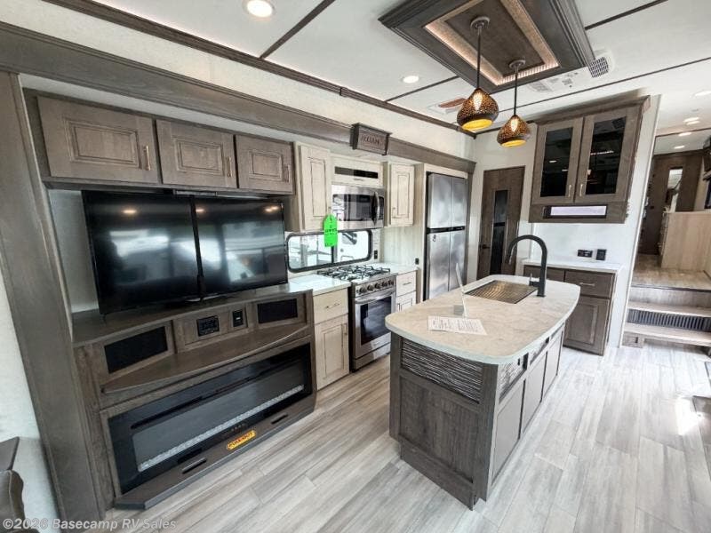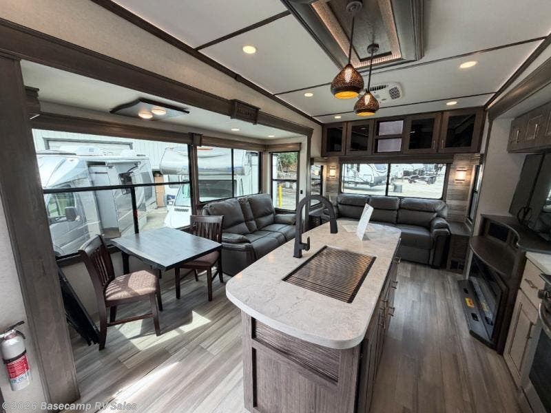 Search for the best views, the nicest RV park or a place you haven't seen for years with this Paradigm in tow! From the king bed slide in the master bedroom, the Smart TV, the dresser with flip-up hidden storage and the front wardrobe to the rear living area with a sleeper sofa near the pull-out fireplace with storage, you might decide to live in this fifth wheel. The full bathroom offers a large residential shower, a porcelain toilet with soft close seat, and storage for your linens, while the kitchen gives you two pantries, an island with a stainless steel farm sink and a space prepped for a dishwasher option, plus a residential microwave, range and oven to make meals. And you will love the dual recliner love seat and the floating dinette table. There are so many more features included, take this fifth wheel home today!