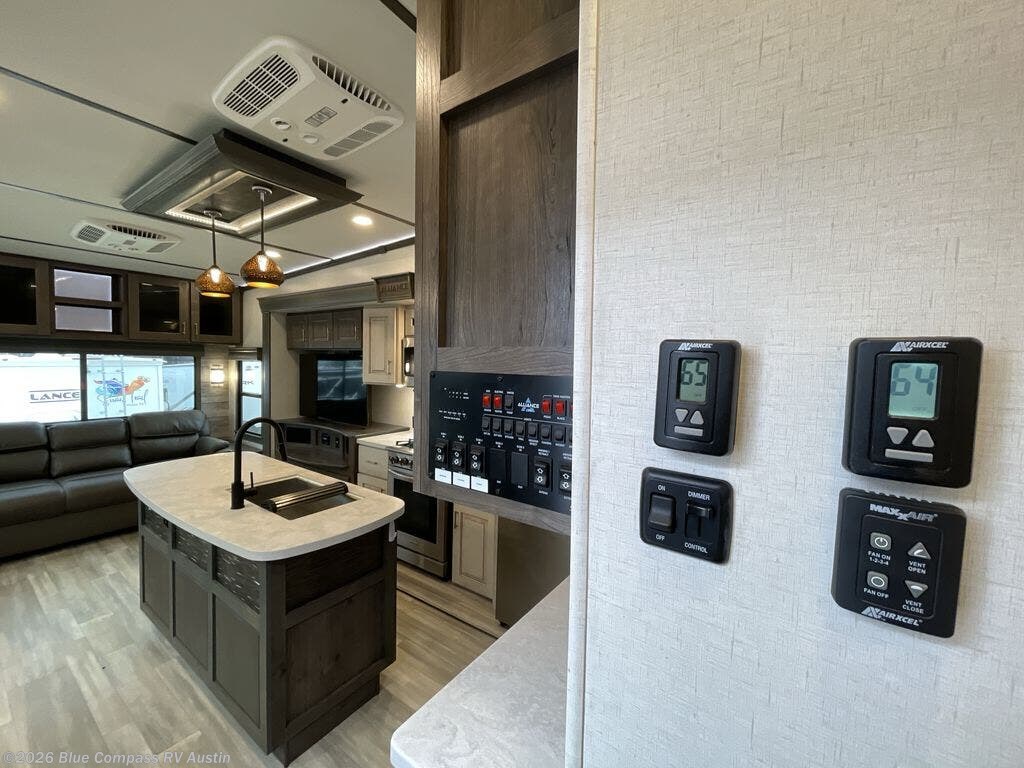 With any Paradigm fifth wheel by Alliance RV, you will experience the next generation advanced frame technology with heavy duty performance running gear. The Benchmark chassis features solid steel 10" l-beam main rails with a 2" torsion tube welded where the running gear attaches, drop frame storage area, flush upper deck design, reinforced goose neck area and a Rota-Flex pin box. The six-point hydraulic auto leveling is faster, stronger and quieter allowing you to enjoy more time away, and the PVC roof is more puncture resistant, ultra bright white and more solar reflective to help keep your fifth wheel cool. The triple 13,500 BTU A/Cs are ultra quiet, independently controlled direct flow A/C units that maximize cooling capacity, plus the 40,000 BTU furnace has flex ducts connected to formed ducts in the floor, and there are dedicated heat vents into the basement and underbelly to keep the tanks and your gear cozy warm during the cooler seasons. Choose luxury, choose convenience, choose to own the best, a Paradigm!