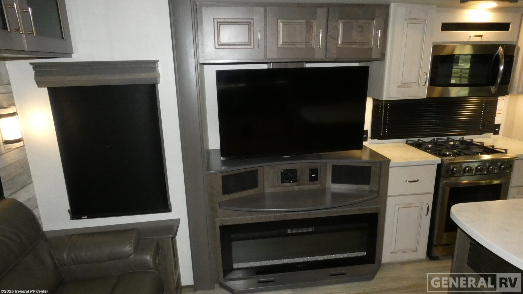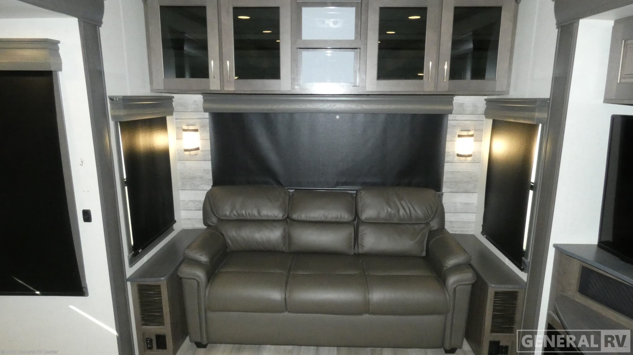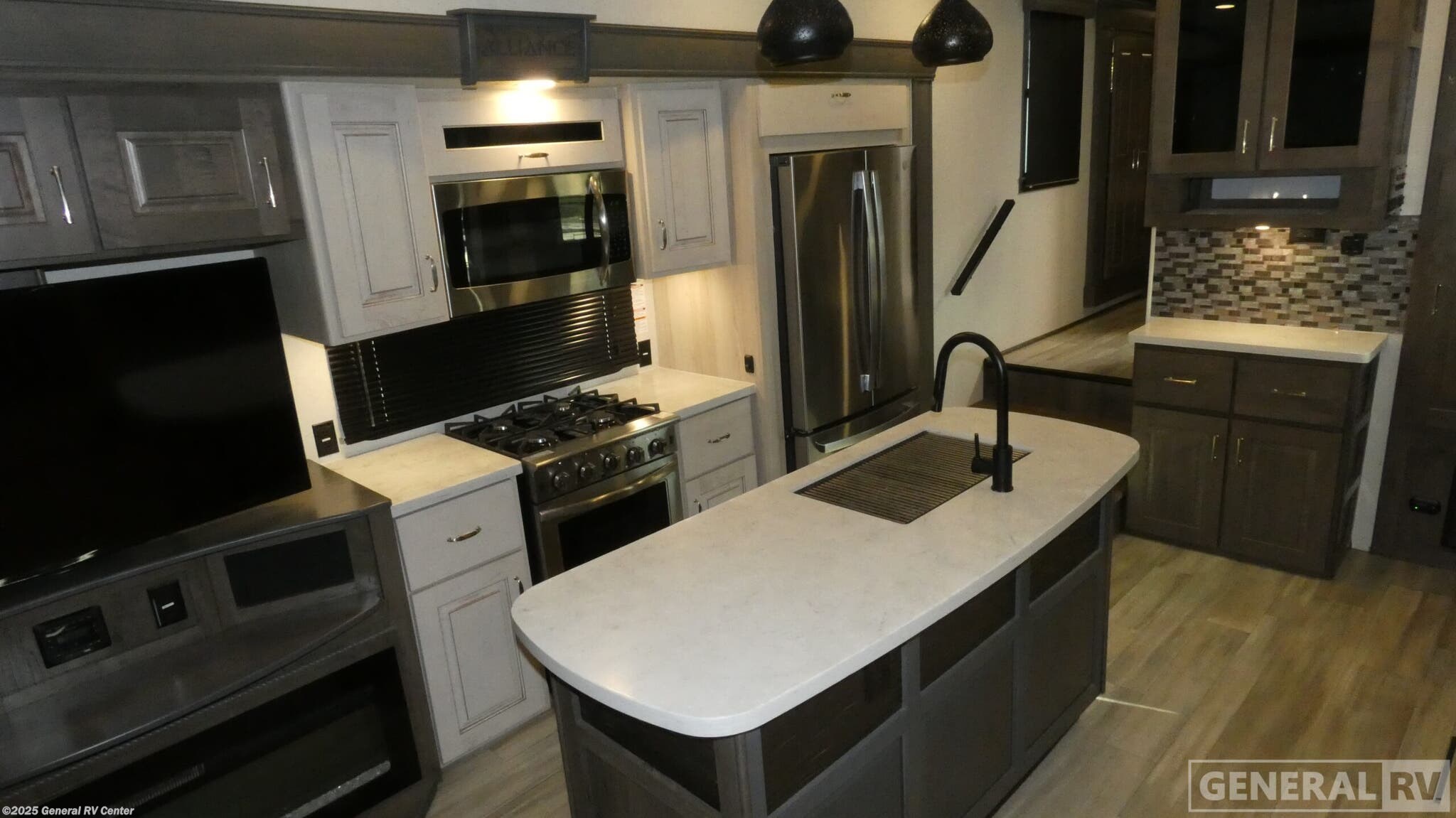 Alliance RV Paradigm fifth wheel 340RL highlights: Entry Closet Pantry/Hutch Flush-Floor Kitchen Slide Floating Dinette Table Two Bedroom Seats 50" Smart TV Travel to see family and friends while living in this RV or while on vacation with beautiful views out of the many atrium windows once at your destination. You will love the spacious rear living area thanks to the dual opposing slides which include the kitchen amenities and the 50" Smart TV with pull-out fireplace including storage below, plus the dual recliner love seat which is super comfortable and the floating dinette table with four chairs. The kitchen island includes a stainless steel farm sink and counter space to utilize many ways, plus you can add a dishwasher option if you like. The full bathroom is up the steps towards the front bedroom and includes a 61" x 30" shower. You even have more floor space in the hallway thanks to the slide out which includes shelf storage, plus more shelves and a king bed in the bedroom. You will find lots of useful storage in the bedroom as well. And don't forget about all the exterior features, take a look! With any Paradigm fifth wheel by Alliance RV, you will experience the next generation advanced frame technology with heavy duty performance running gear. The Benchmark chassis features solid steel 10" l-beam main rails with a 2" torsion tube welded where the running gear attaches, drop frame storage area, flush upper deck design, reinforced goose neck area and a Rota-Flex pin box. The six-point hydraulic auto leveling is faster, stronger and quieter allowing you to enjoy more time away, and the PVC roof is more puncture resistant, ultra bright white and more solar reflective to help keep your fifth wheel cool. The triple 13,500 BTU A/Cs are ultra quiet, independently controlled direct flow A/C units that maximize cooling capacity, plus the 40,000 BTU furnace has flex ducts connected to formed ducts in the floor, and there are dedicated heat vents into the basement and underbelly to keep the tanks and your gear cozy warm during the cooler seasons. Choose luxury, choose convenience, choose to own the best, a Paradigm!