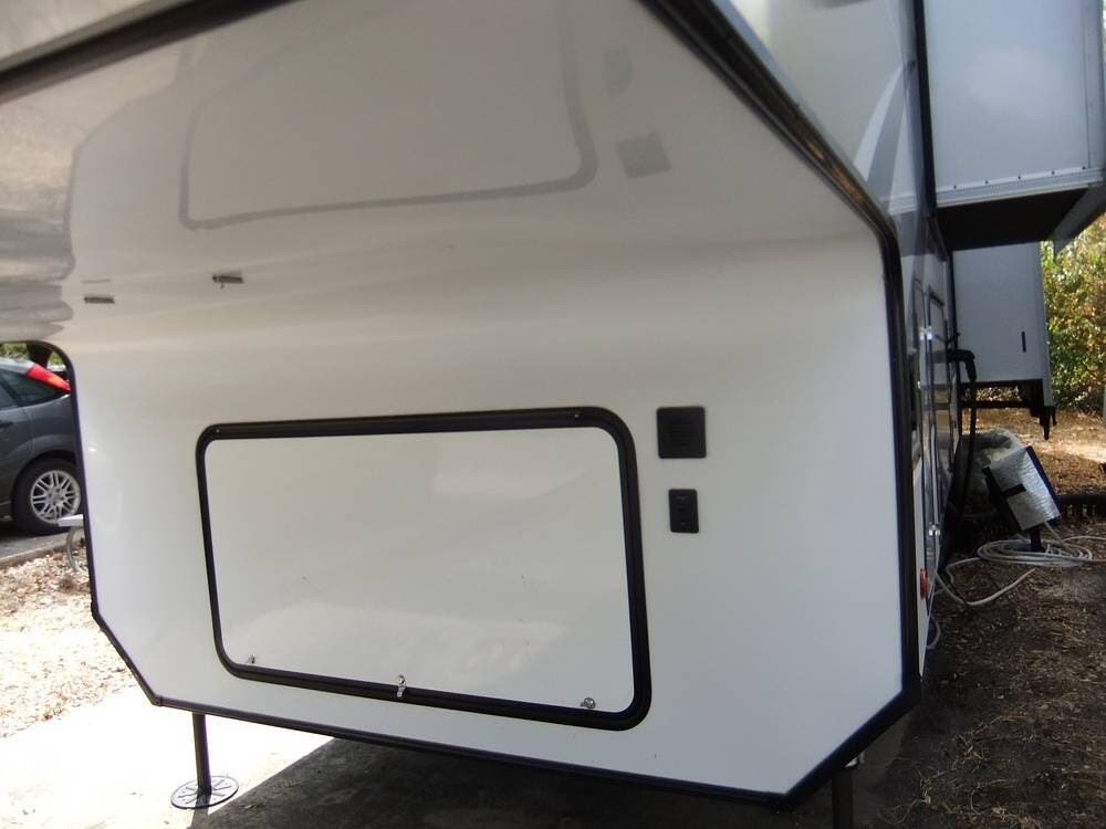 Adjacent to the bathroom is the master bedroom. The full king mattress is situated in the bedroom slide-out. There is a LED TV, a separate A/C unit with thermostat control, and an abundance of drawers and other storage places. A large barn-style sliding door separates the master bathroom from the master bedroom, and a pocket door separates the bedroom from the galley and living area.