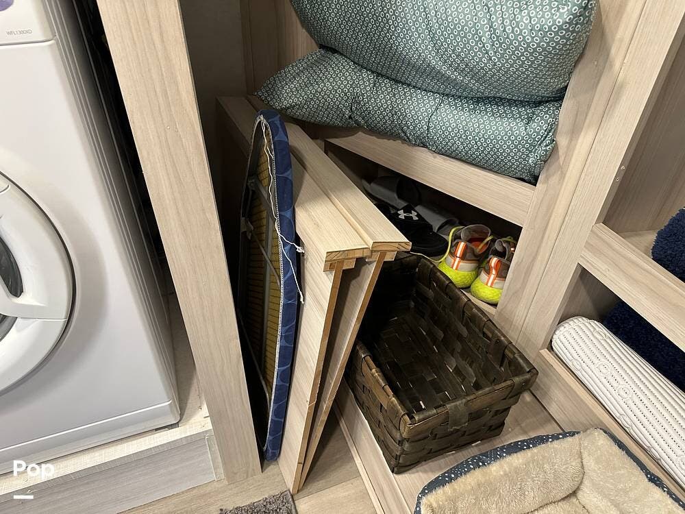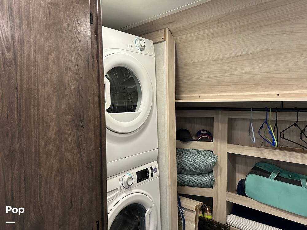 The shower has a folding chair, and in the wardrobe closet, a stackable washer and dryer with a laundry hamper.