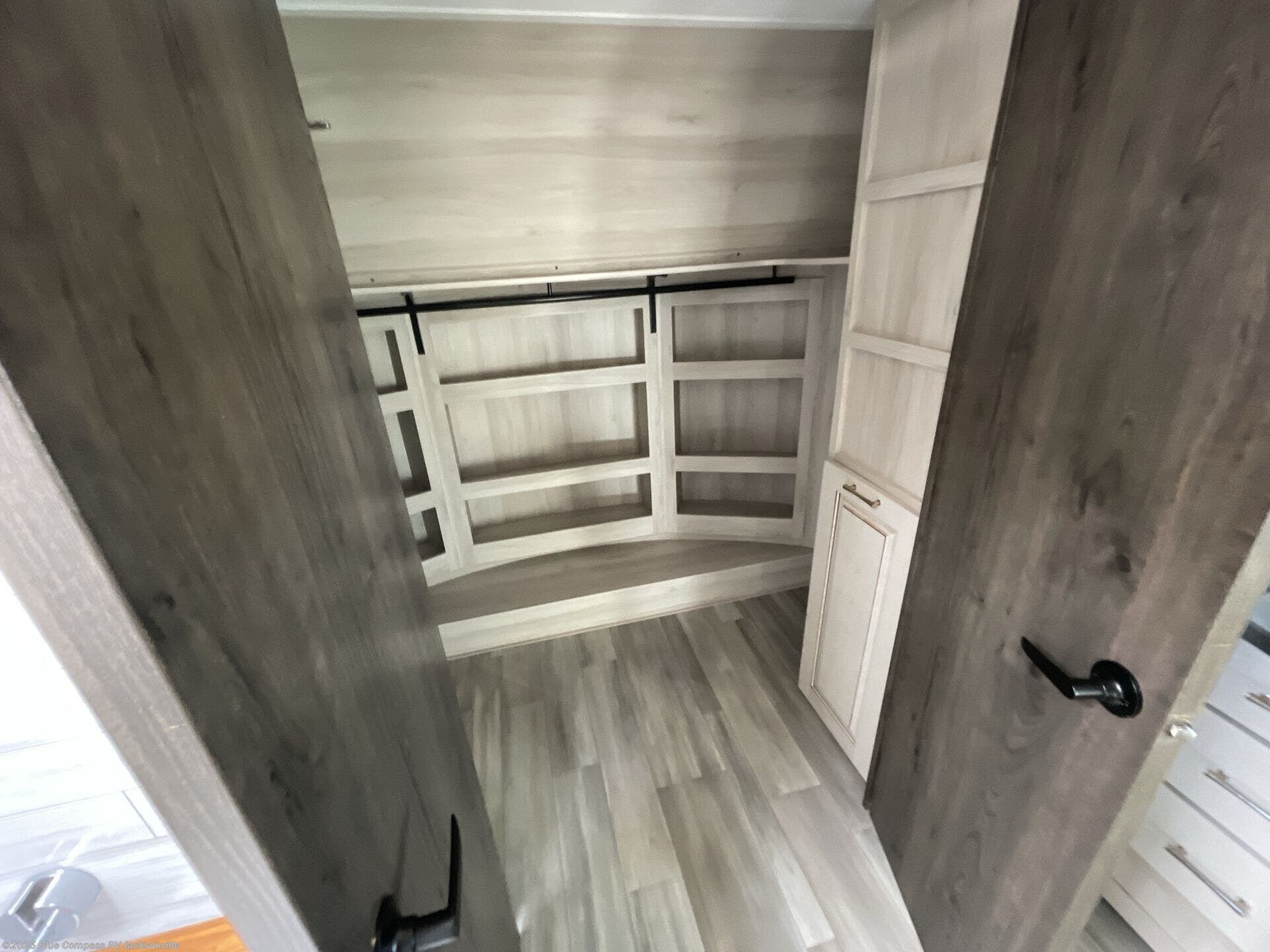 Whether you decide to be a full-timer or a long-trip traveler, this Paradigm offers so many comforts and conveniences you will love seeing nature while under the two awnings with only a few steps to get back inside to rest and relax in your own spacious fifth wheel! The large full bathroom might be the reason you decide to be a owner because you will have a large 61" x 30" shower to get cleaned up in, linen storage, and a walk-in closet with a hamper, shelves, and a space prepped for a washer/dryer option. The bedroom allows you to sleep like a king and gives you extra floor space with the two slides, and storage in the flip-top dresser and under the seat, plus you can watch the Smart TV. The space saving sliding doors offer style as well. The cook will love all the residential appliances, you can even choose the residential refrigerator option. The kitchen island gives you a stainless steel farm sink and a place to add a dishwasher option. The half bath is super convenient just like the entry sitting bench/coat rack and closet. And you can relax on the sleeper sofa or the dual recliner love seat. There is so much more to see!