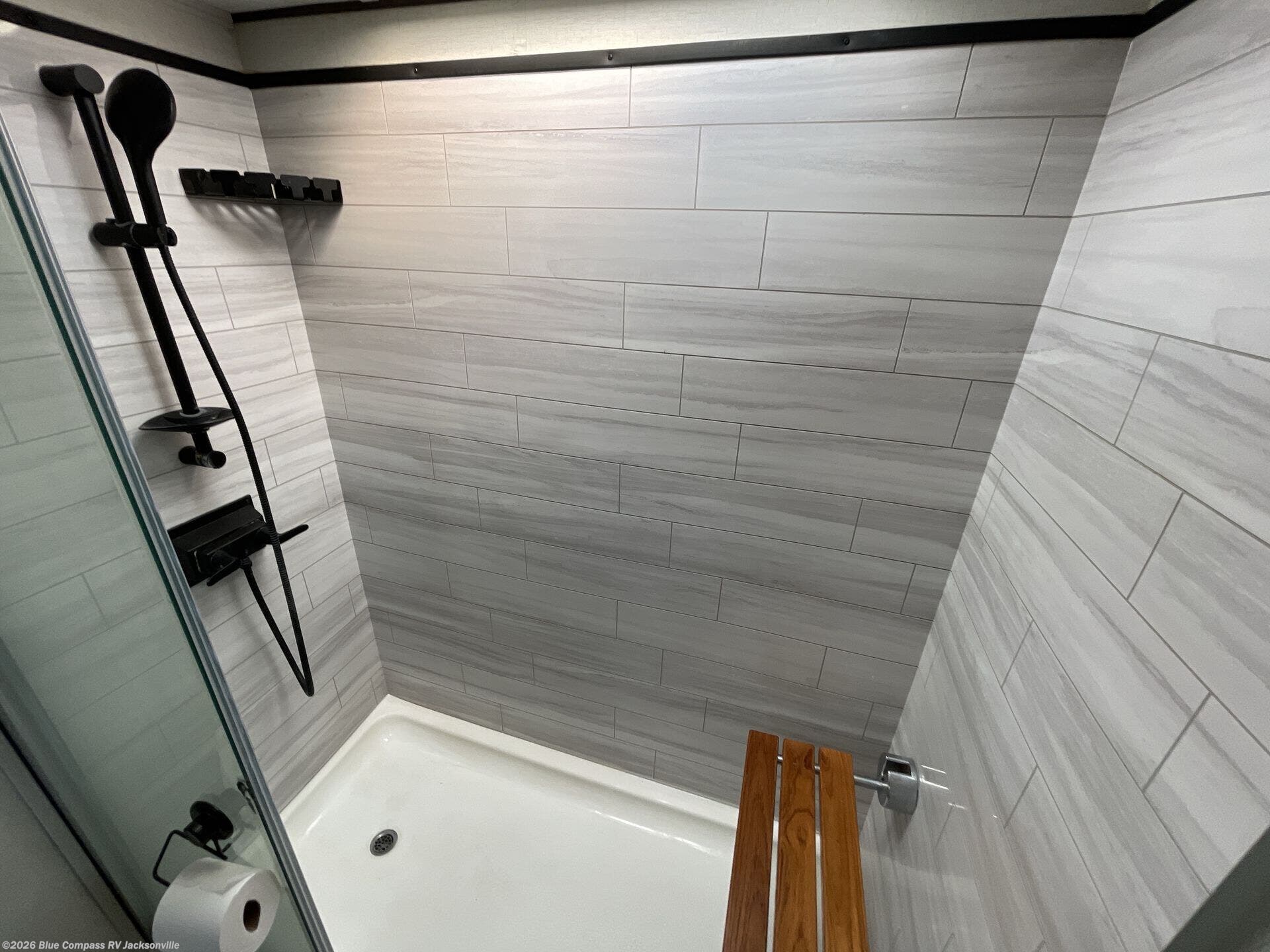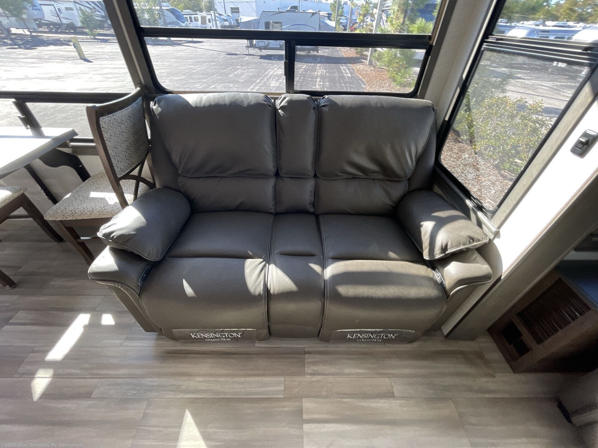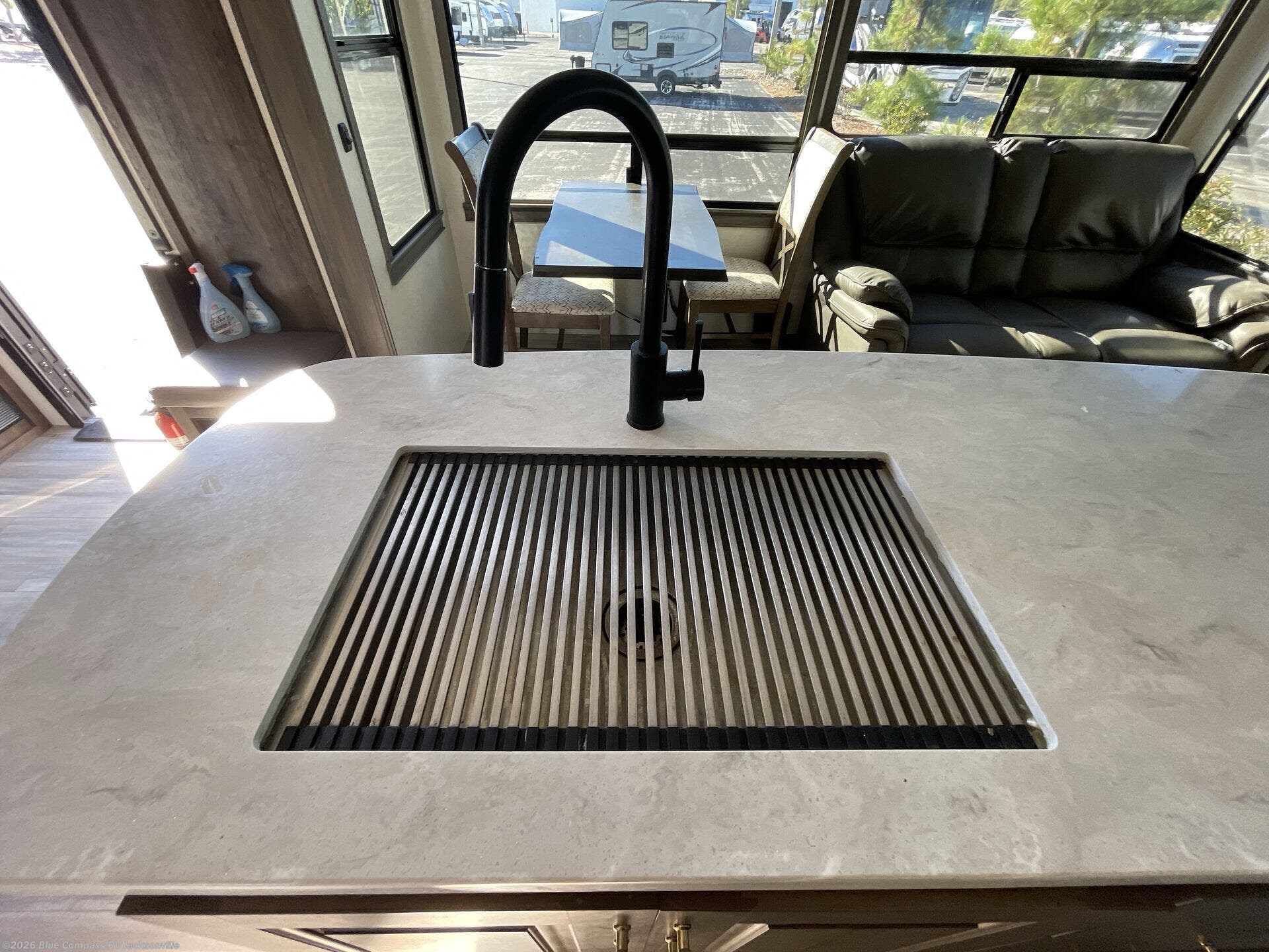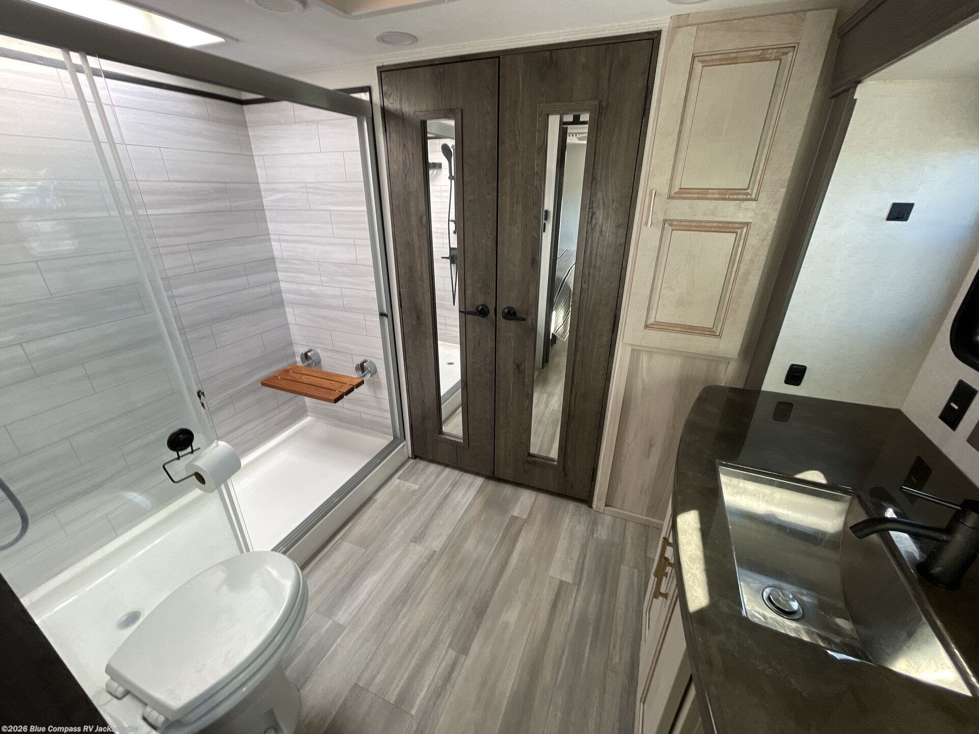 Whether you decide to be a full-timer or a long-trip traveler, this Paradigm offers so many comforts and conveniences you will love seeing nature while under the two awnings with only a few steps to get back inside to rest and relax in your own spacious fifth wheel! The large full bathroom might be the reason you decide to be a owner because you will have a large 61" x 30" shower to get cleaned up in, linen storage, and a walk-in closet with a hamper, shelves, and a space prepped for a washer/dryer option. The bedroom allows you to sleep like a king and gives you extra floor space with the two slides, and storage in the flip-top dresser and under the seat, plus you can watch the Smart TV. The space saving sliding doors offer style as well. The cook will love all the residential appliances, you can even choose the residential refrigerator option. The kitchen island gives you a stainless steel farm sink and a place to add a dishwasher option. The half bath is super convenient just like the entry sitting bench/coat rack and closet. And you can relax on the sleeper sofa or the dual recliner love seat. There is so much more to see!