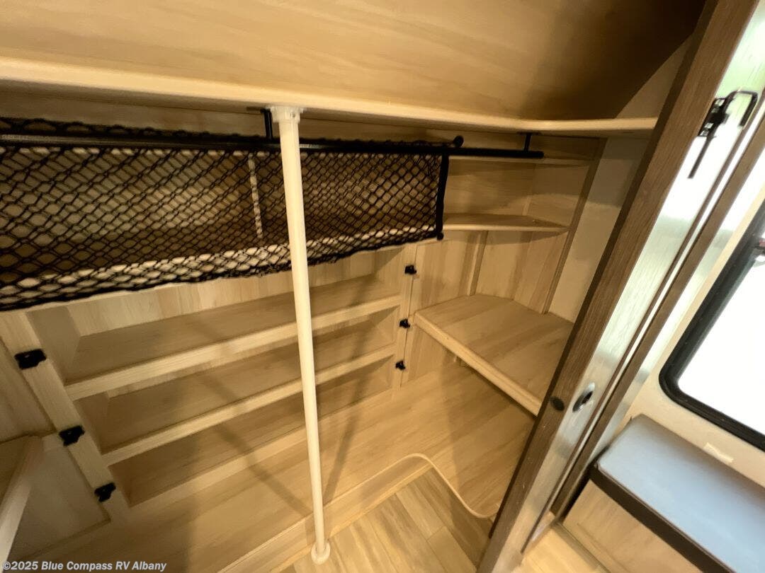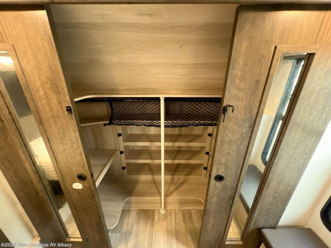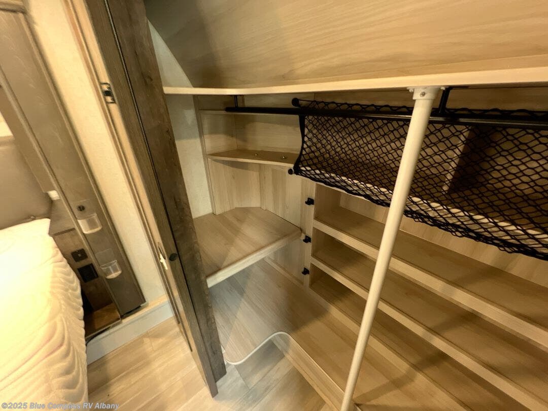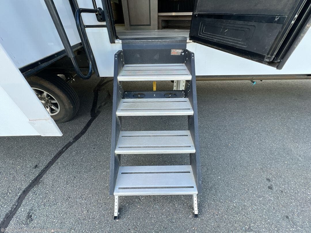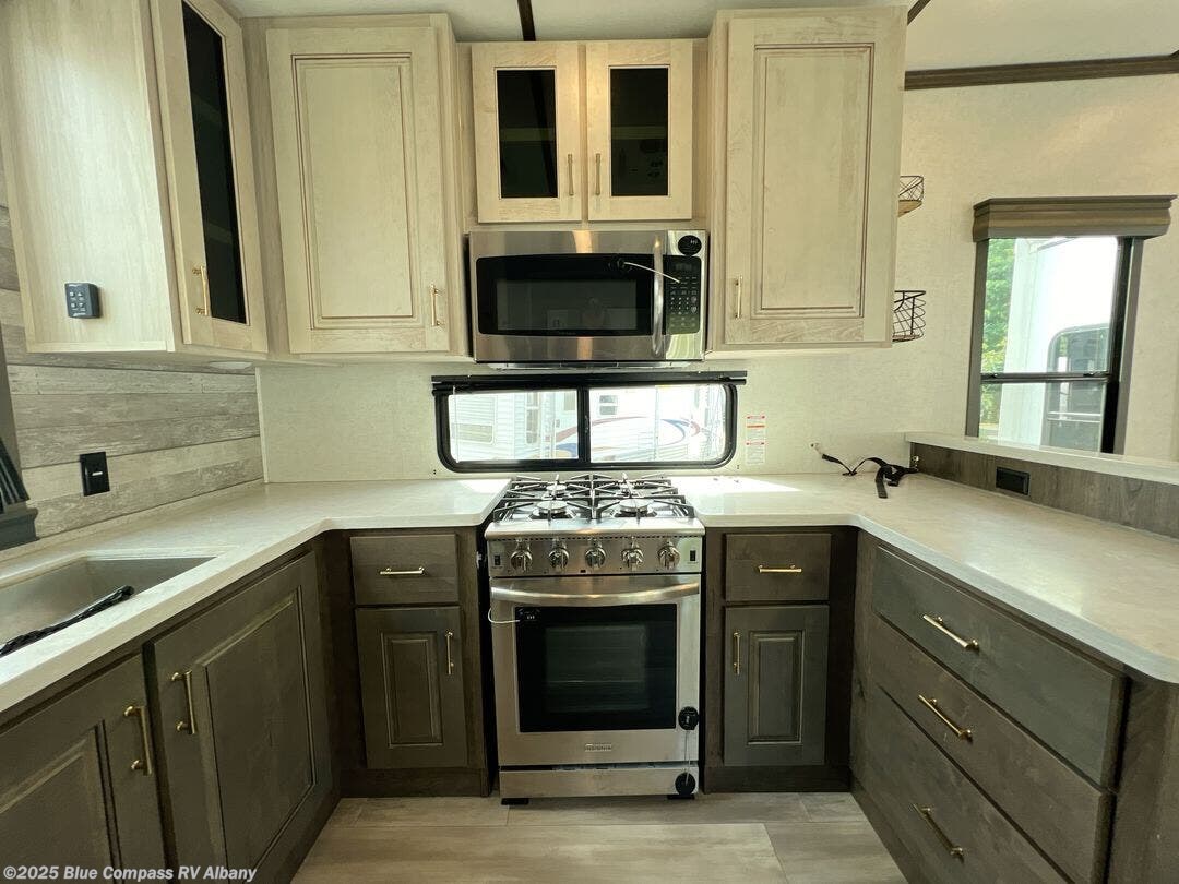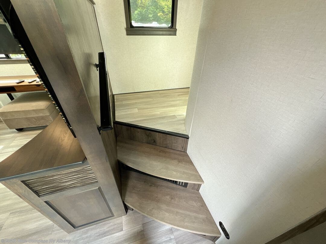If you enjoy your own space, this fifth wheel offers just that with a separate kitchen in the rear from the middle living area. The kitchen offers lots of counter space, plus residential appliances, and you can choose a residential refrigerator option, a pantry, a stainless steel farm sink and a space prepped to add a dishwasher option. Everyone can dine at the floating dinette with four chairs or while sitting in the living area on the dual recliner love seat or the two sleeper sofas that offer space for overnight guests. The welcoming entry allows you to head to the living area or up the stairs to the front spacious bedroom and hallway thanks to the slide out with storage in the hallway, and shelves plus a king bed in the bedroom. You will find more places for your clothing and things in the front wardrobe, the flip-top dresser and under the two seats. There are more features to see that bring you comfort and convenience, and the style you want. And you can add a few options such as a washer/dryer, an LED motion light strip in the pantry, and/or dual pane windows.