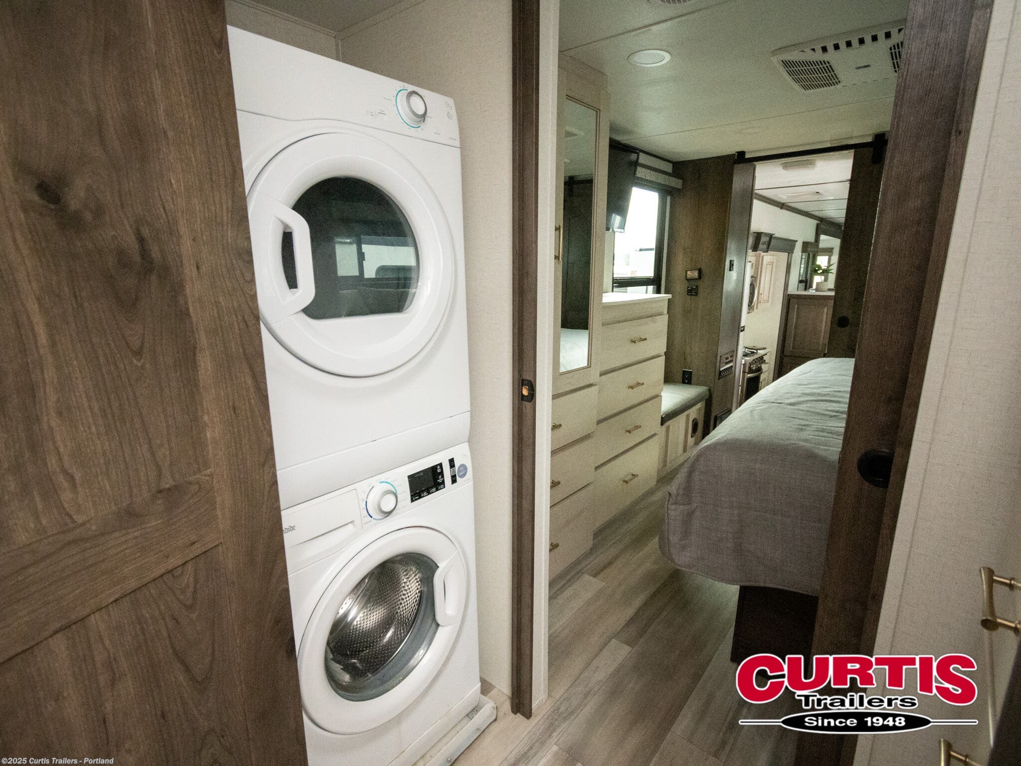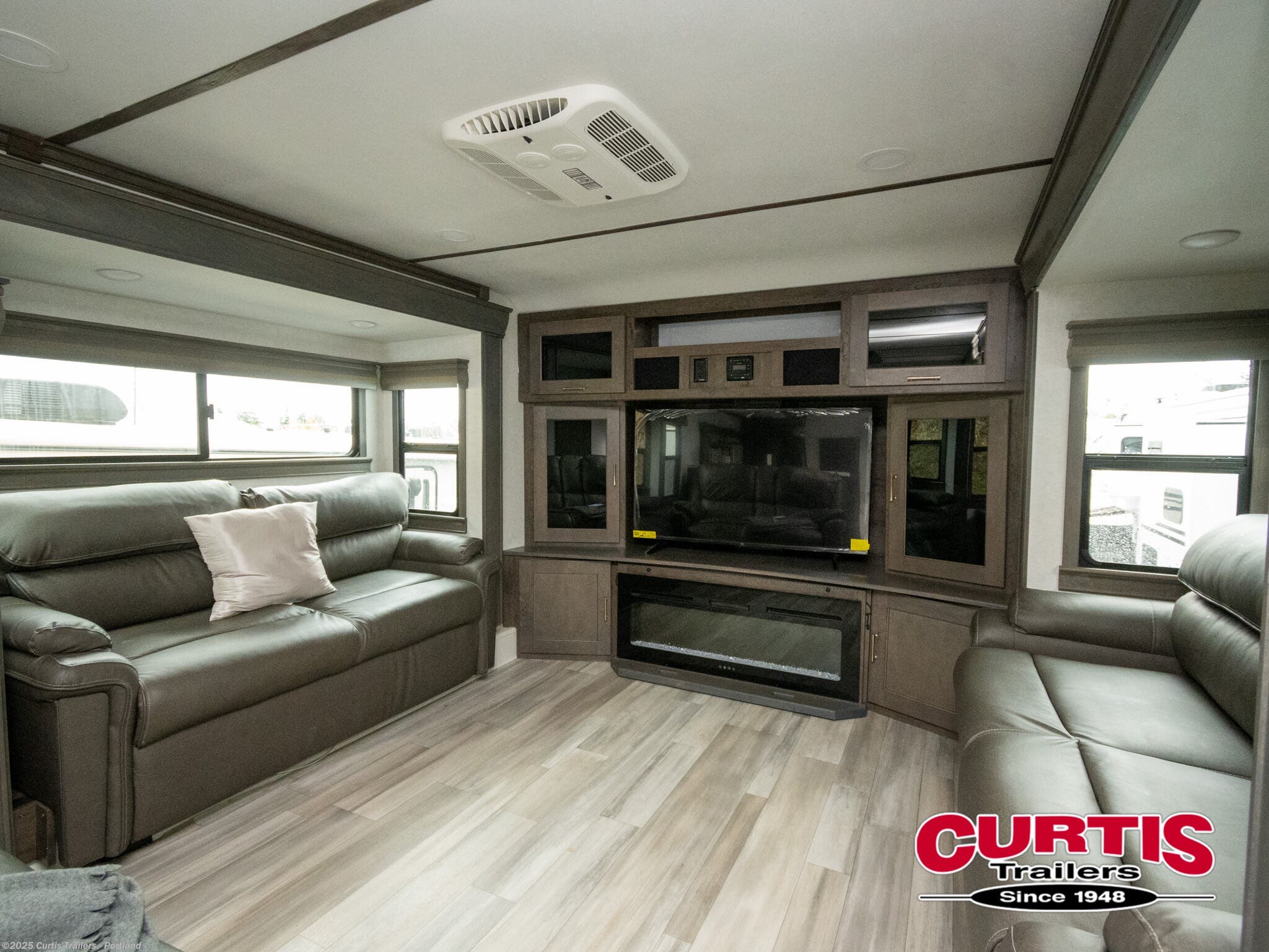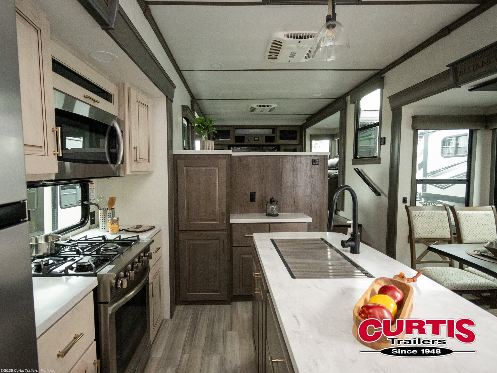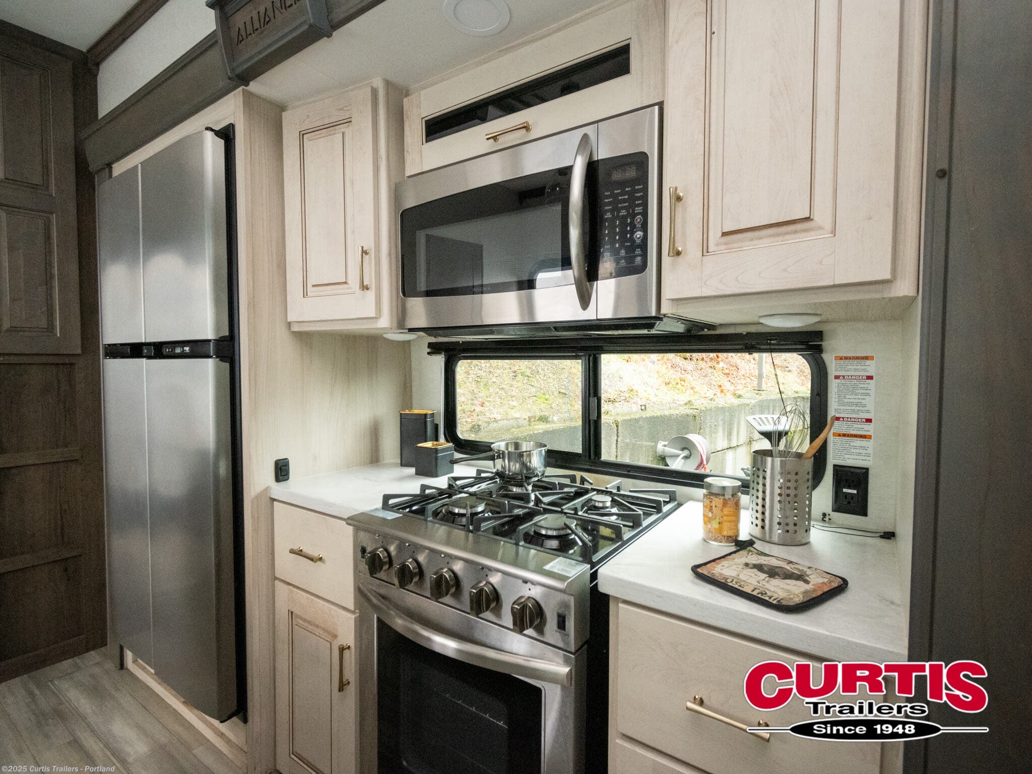 Hit the road in style with this 2022 Alliance RV Paradigm 385FL?a top-tier fifth wheel built for comfort, convenience, and full-time living. This front-living model features a spacious, modern interior with high-end finishes, large panoramic windows, and an open floorplan perfect for relaxing or entertaining. The chef?s kitchen includes premium appliances, solid-surface countertops, a stainless residential-size refrigerator and plenty of storage?making meal prep a breeze. Enjoy movie nights in the front living area, complete with theater seating, tri-fold sofa, day bed and a large entertainment center with remote control fireplace. The private rear bedroom offers a King bed, television, massive wardrobe, and Splendide stackable washer/dryer, while the bathroom vanity adds a touch of spa-like luxury. Outside, you?ll find power awnings, self-leveling hydraulic jack system, and generous storage compartments, everything you need for adventure-ready living.