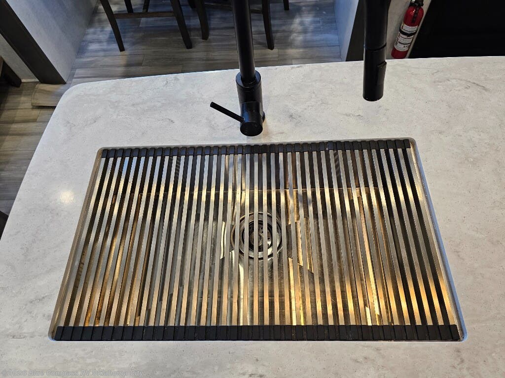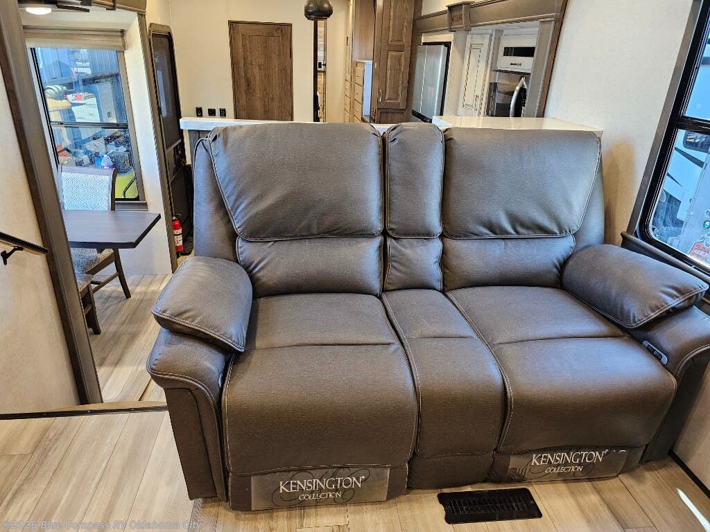 An active family will want this fifth wheel with its exterior basement pull-out tray that measures at 48" x 115" to load up your kayaks and such. Just above this area is the master suite with a rear bathroom that offers a residential shower, a porcelain toilet with soft close seat, plus a wardrobe and shelf storage. The king bed slide gives you more floor space, and you will have a seat, a flip-top dresser, and a Smart TV to watch. The half bath is next to the main entry which is super convenient, and the middle kitchen is separate from the front living area. The cook will love the residential microwave, range and oven, plus the option to add a residential refrigerator, plus the pantry, and the extra counter space on the kitchen island with a stainless steel farm sink. And the views out of the atrium windows in the slide out which includes the floating dinette table are a must see. And when you need to watch the big game, the 55" Smart TV with pull-out fireplace below are up front with the dual recliner love seat and two sleeper sofas.