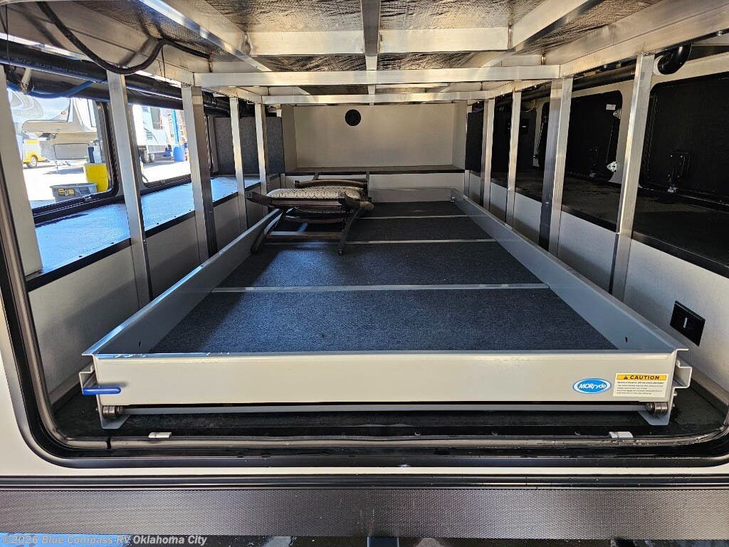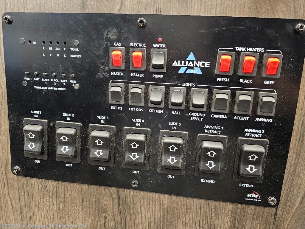 With any Paradigm fifth wheel by Alliance RV, you will experience the next generation advanced frame technology with heavy duty performance running gear. The Benchmark chassis features solid steel 10" l-beam main rails with a 2" torsion tube welded where the running gear attaches, drop frame storage area, flush upper deck design, reinforced goose neck area and a Rota-Flex pin box. The six-point hydraulic auto leveling is faster, stronger and quieter allowing you to enjoy more time away, and the PVC roof is more puncture resistant, ultra bright white and more solar reflective to help keep your fifth wheel cool. The triple 13,500 BTU A/Cs are ultra quiet, independently controlled direct flow A/C units that maximize cooling capacity, plus the 40,000 BTU furnace has flex ducts connected to formed ducts in the floor, and there are dedicated heat vents into the basement and underbelly to keep the tanks and your gear cozy warm during the cooler seasons. Choose luxury, choose convenience, choose to own the best, a Paradigm!