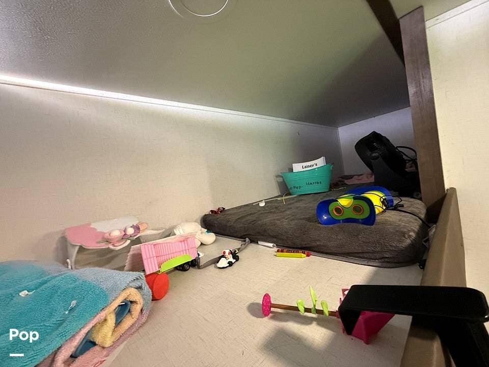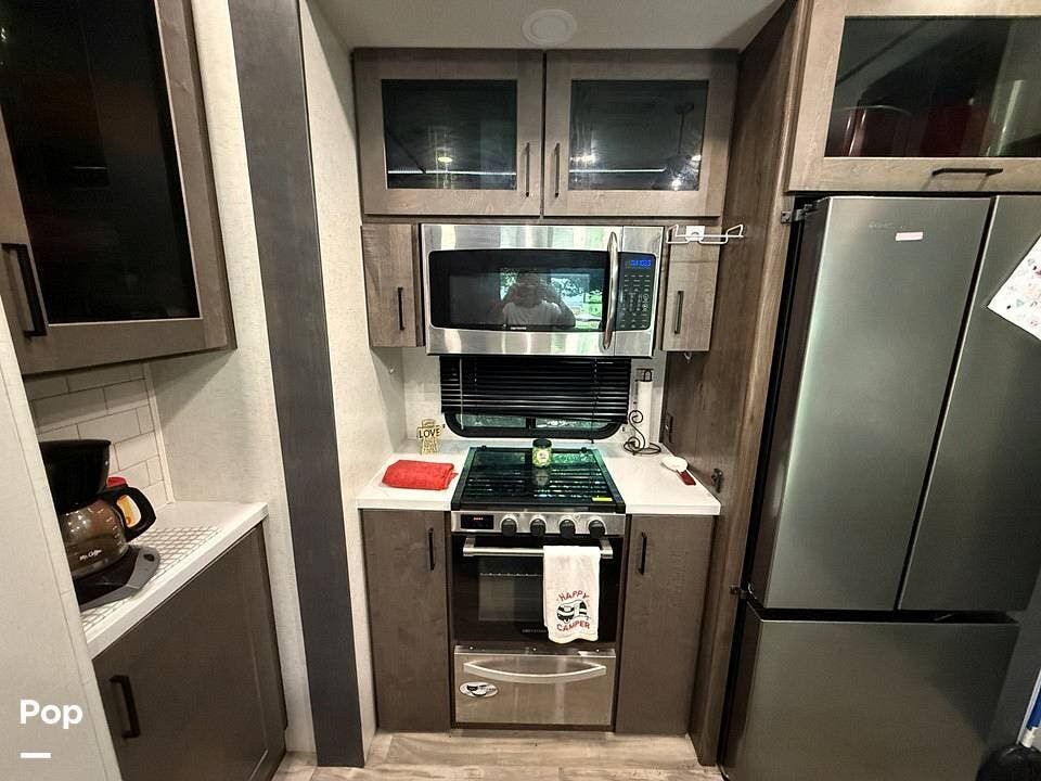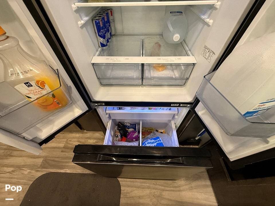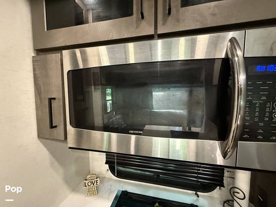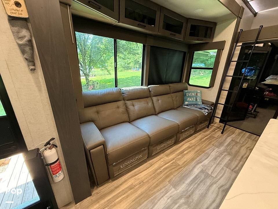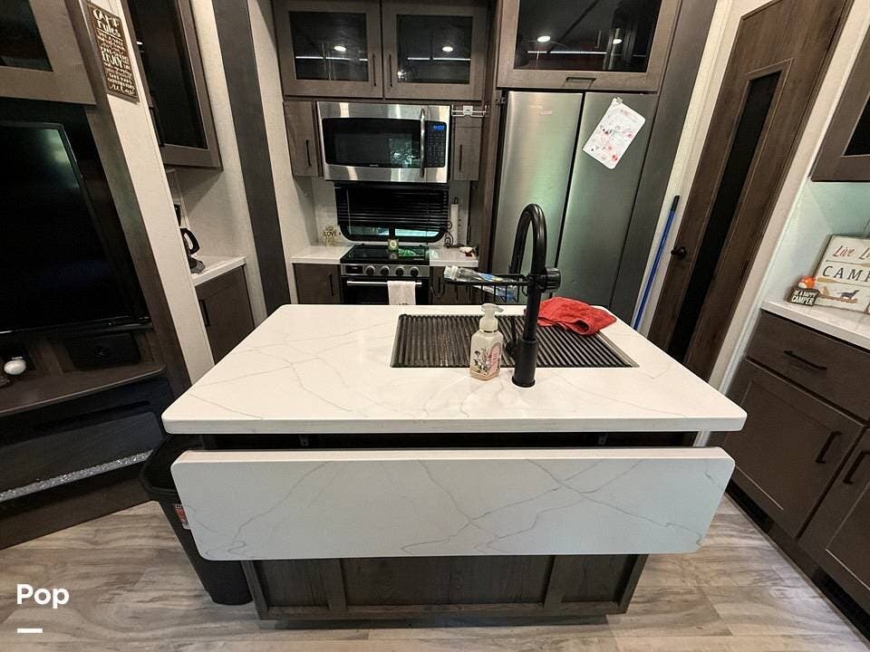 The master suite boasts a king-size bed with a brand-new mattress for superior comfort, while the main living area is centered around a large recliner lounger, a cozy fireplace, and an island kitchen with a fold-up extension, a coffee bar, a residential refrigerator, a 3-burner stove, a convection microwave oven, and an oversized pantry.
