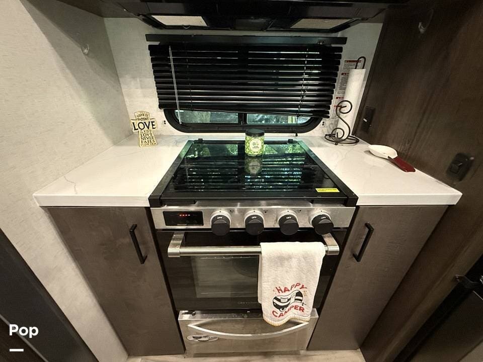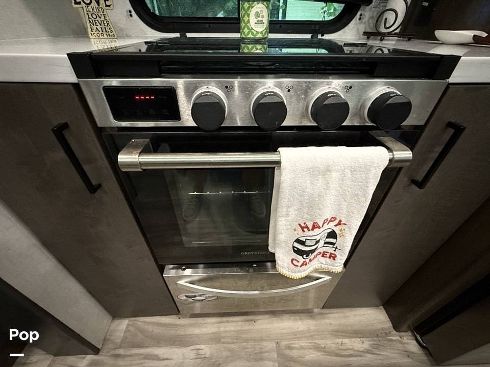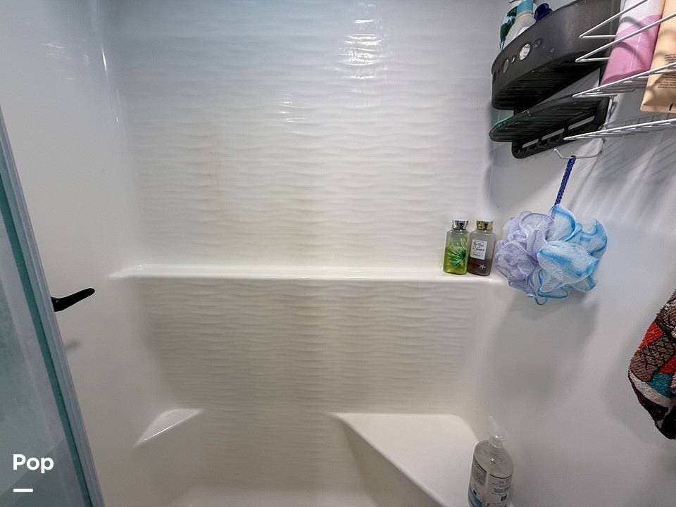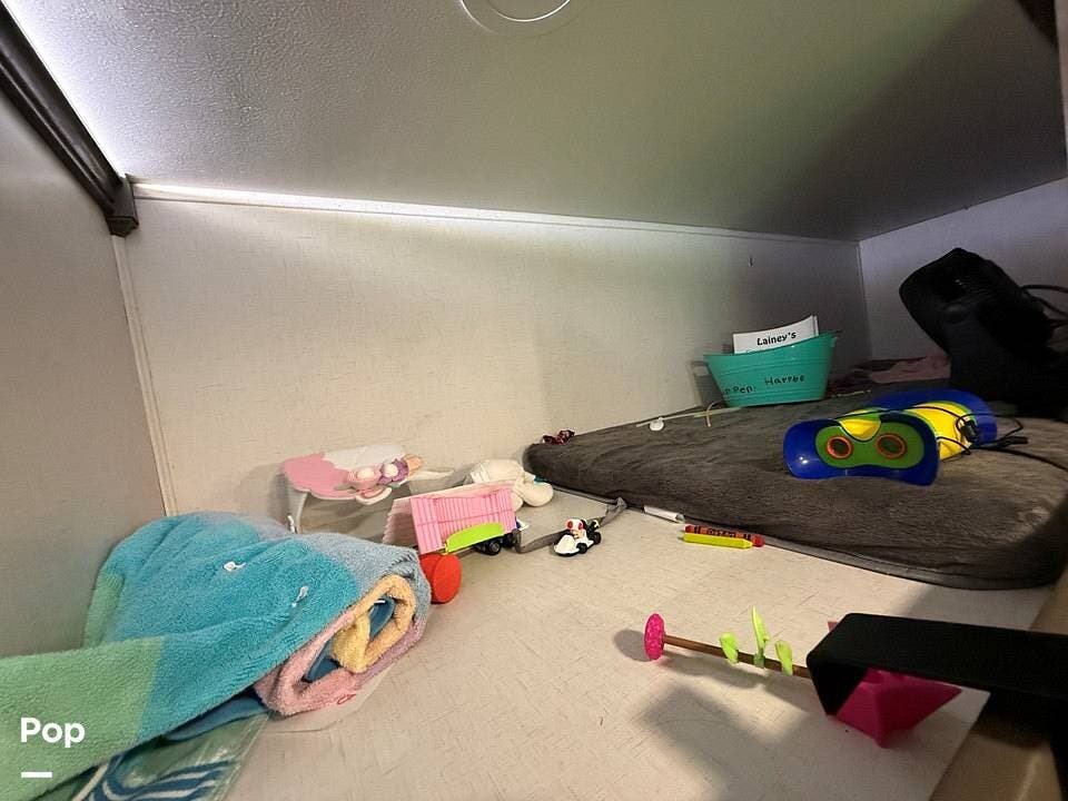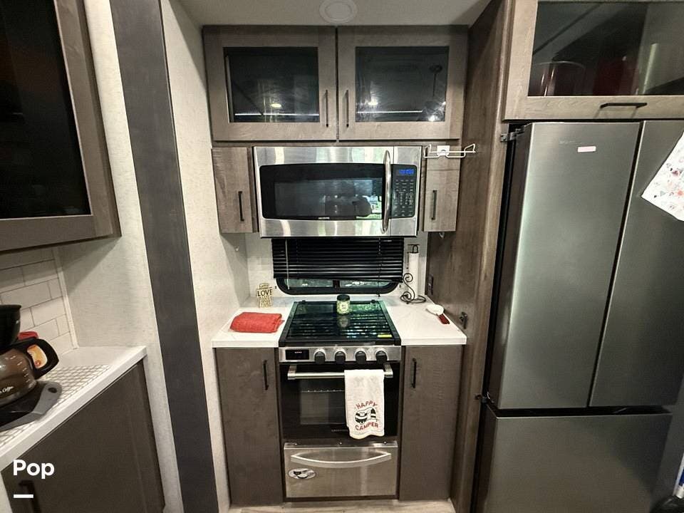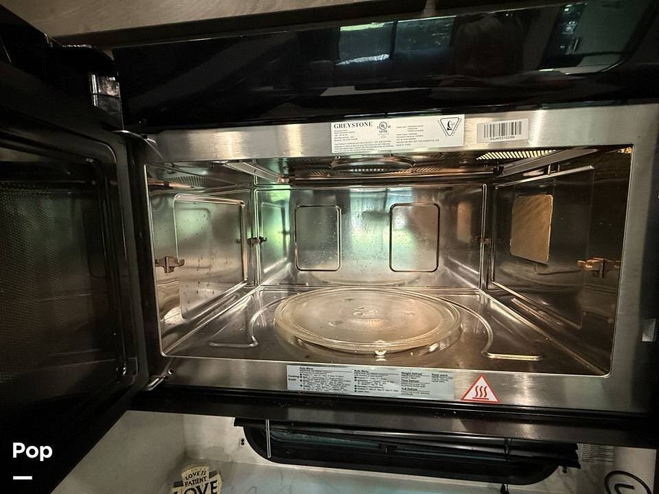 The master suite boasts a king-size bed with a brand-new mattress for superior comfort, while the main living area is centered around a large recliner lounger, a cozy fireplace, and an island kitchen with a fold-up extension, a coffee bar, a residential refrigerator, a 3-burner stove, a convection microwave oven, and an oversized pantry.