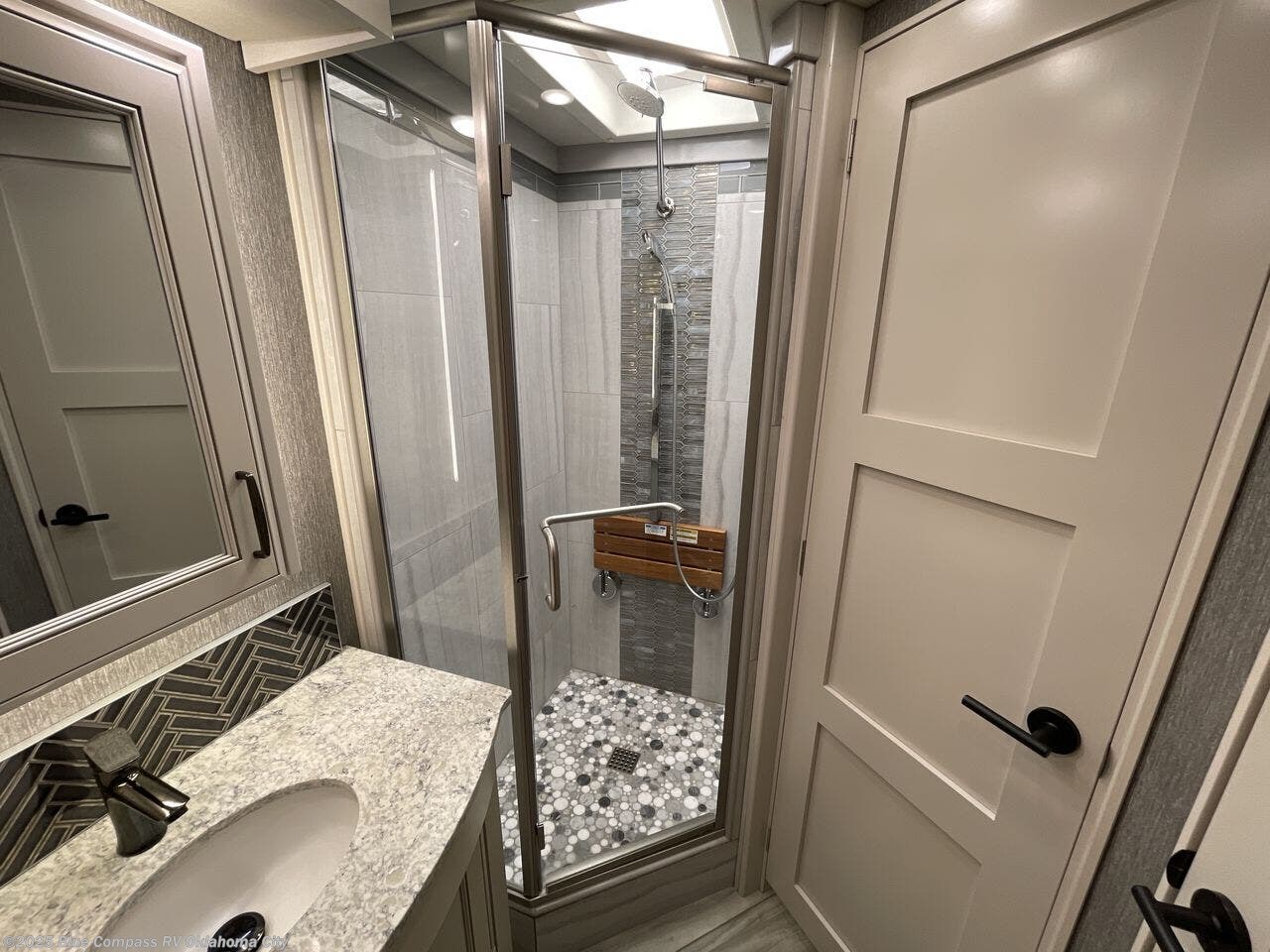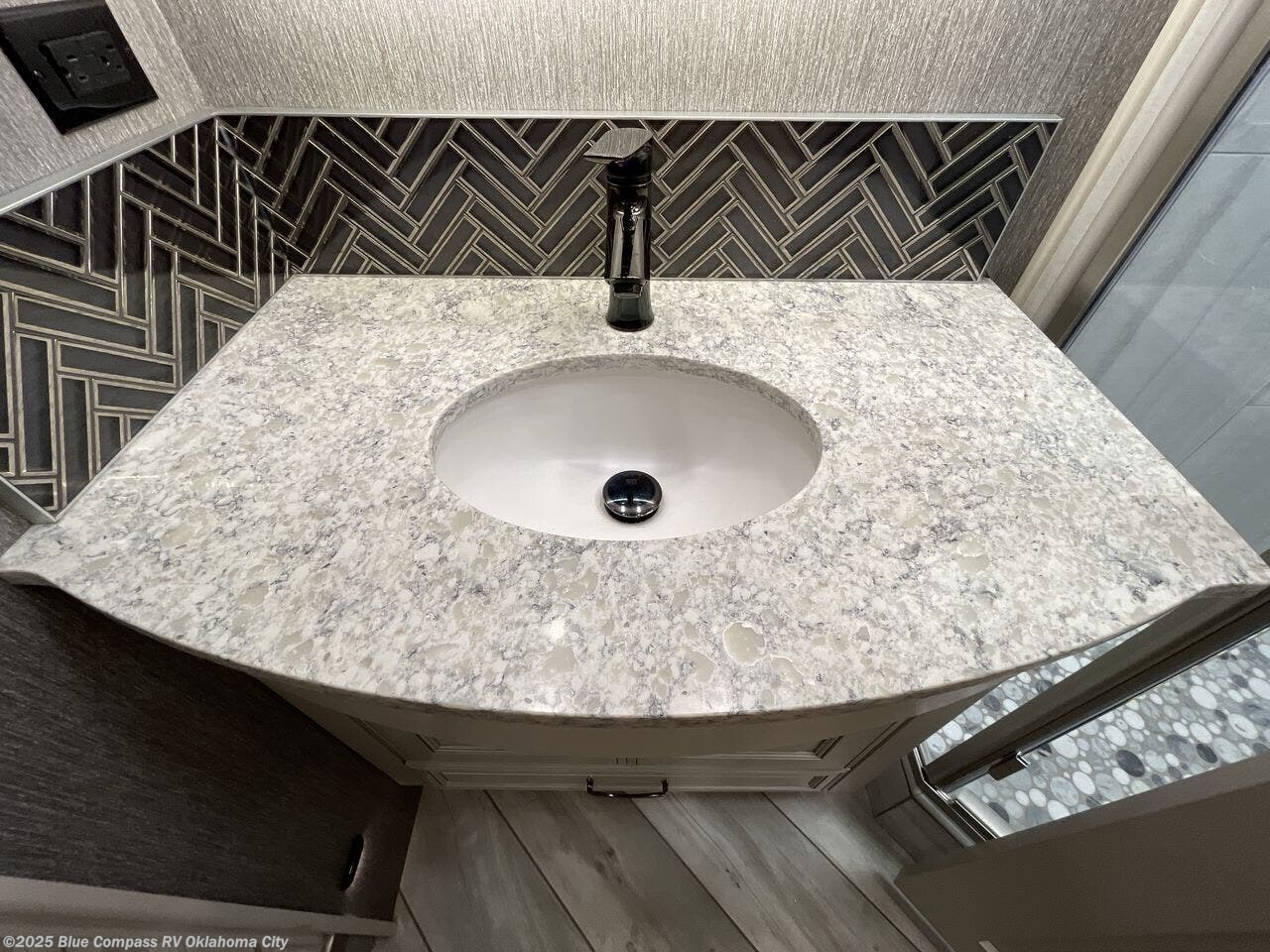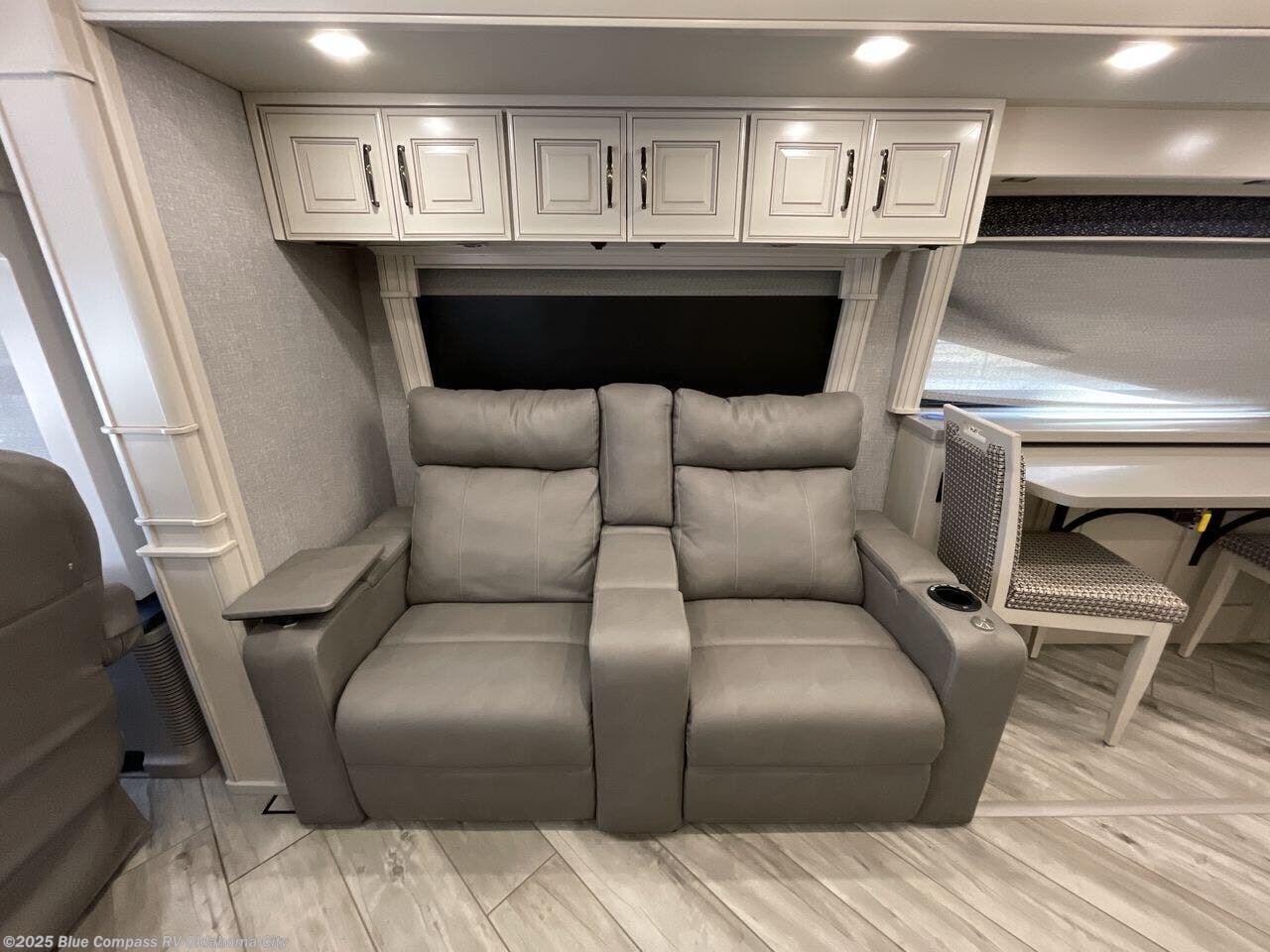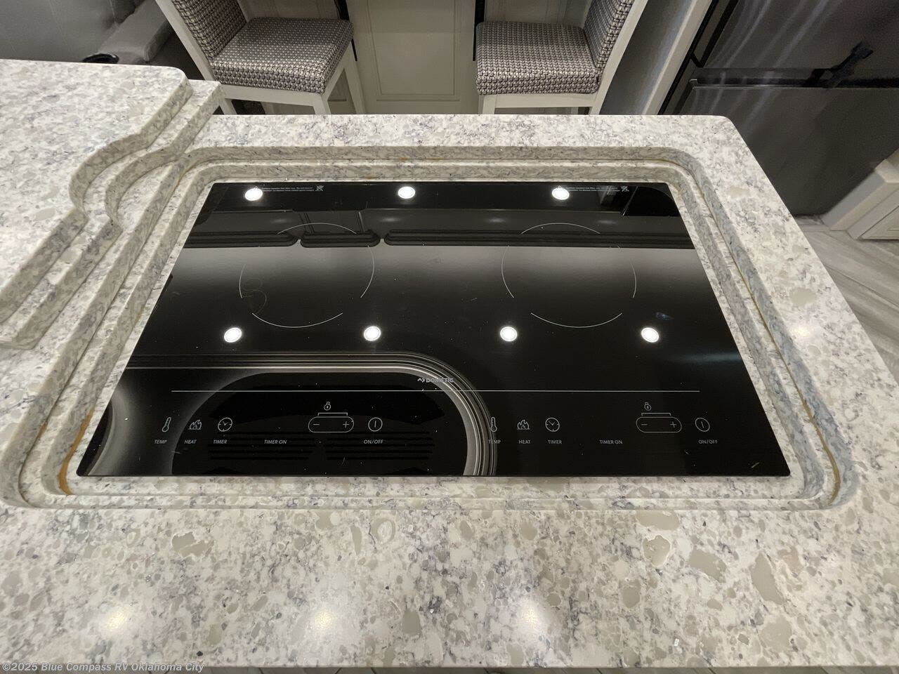 Pack your bags and fuel up this motorhome for a comfortable road trip excursion! You can rest up each night on the Encore Series king memory foam mattress in the rear private bedroom and enjoy clean clothes throughout with the stackable Samsung washer and dryer next to the wardrobe. A guest or two can even tag along and sleep on the 70" sofa with pull-out full bed. A separated bathroom makes it nice and convenient for one person to freshen up in the 39" x 34" shower with a seat while another uses the toilet with a privacy door. Your beverages can be stored in the wine chiller under the kitchen island to free up space in the residential refrigerator which also has an ice maker. Once you have prepared a delicious home cooked meal with the two burner induction cooktop, you can enjoy it at the adaptable dinette!