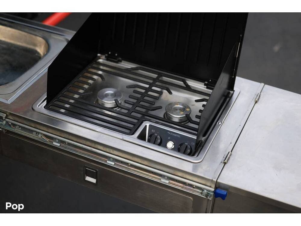 The booth-style dinette table can seat five comfortably with an excellent view of the HDTV. The table will drop down to make a sleeper.