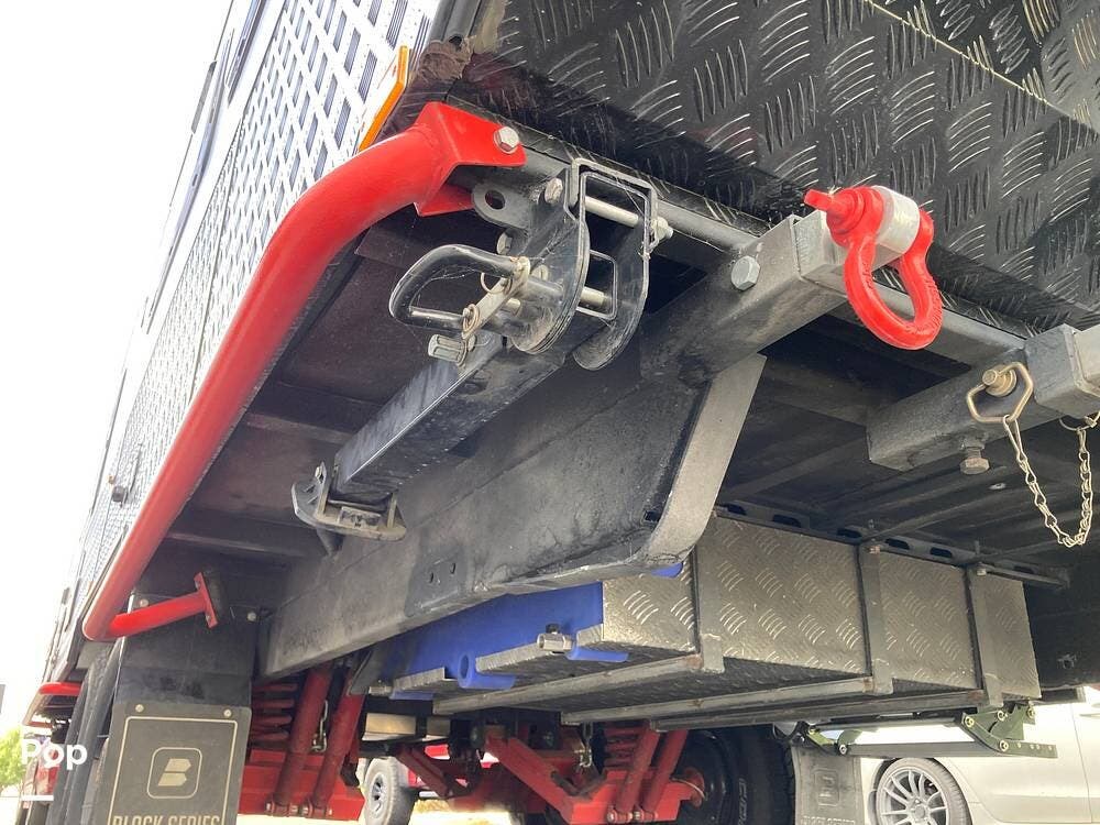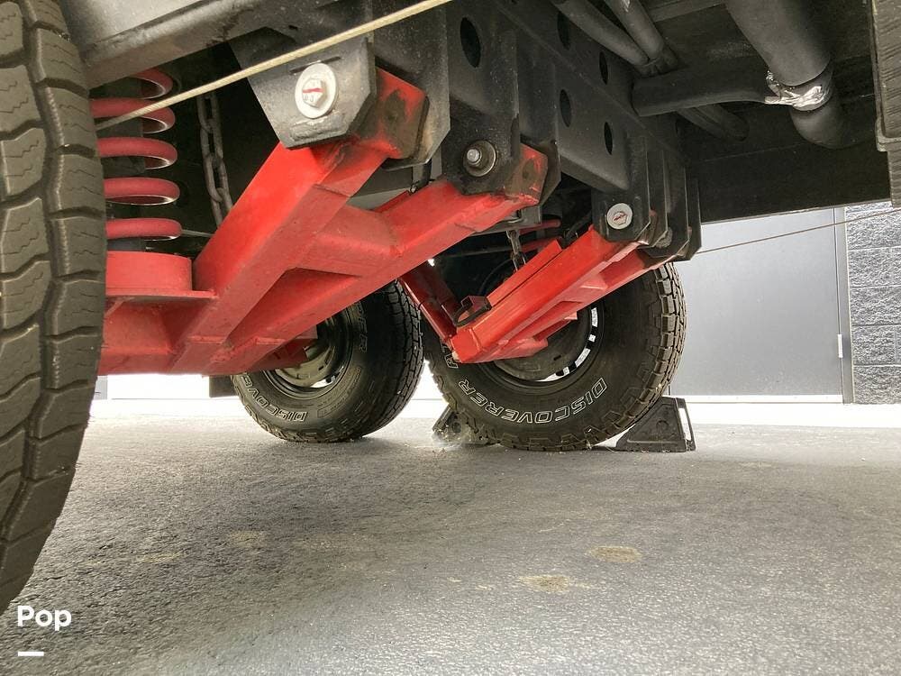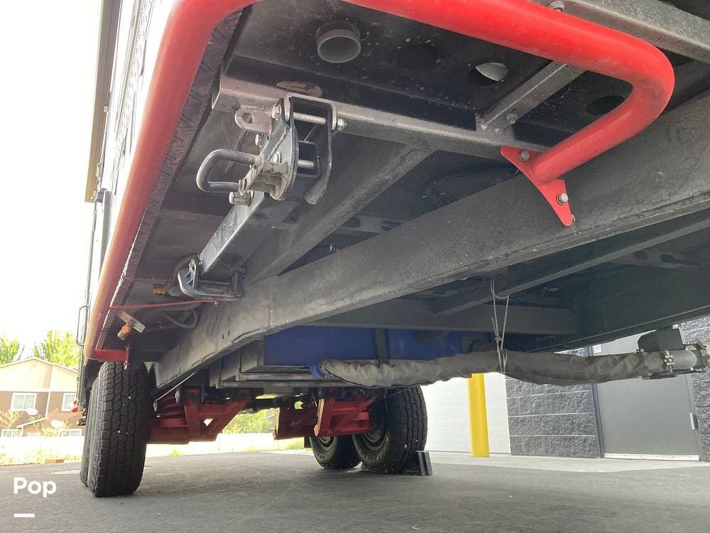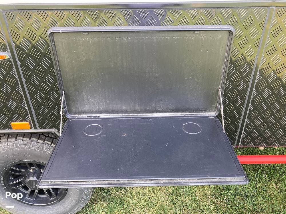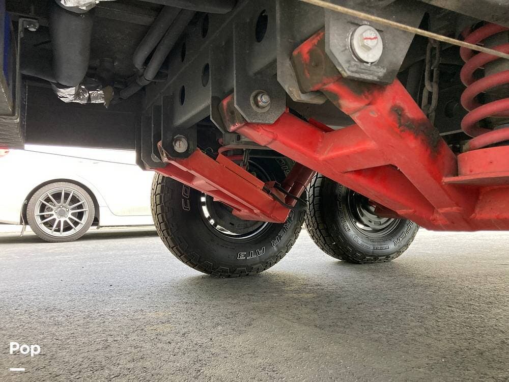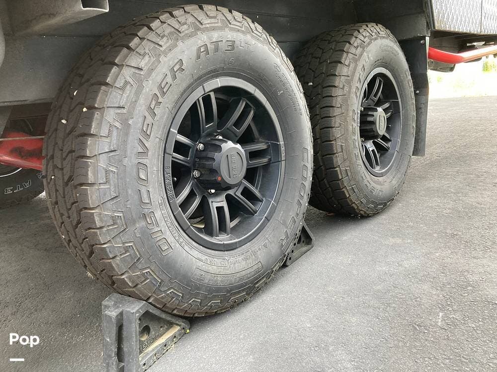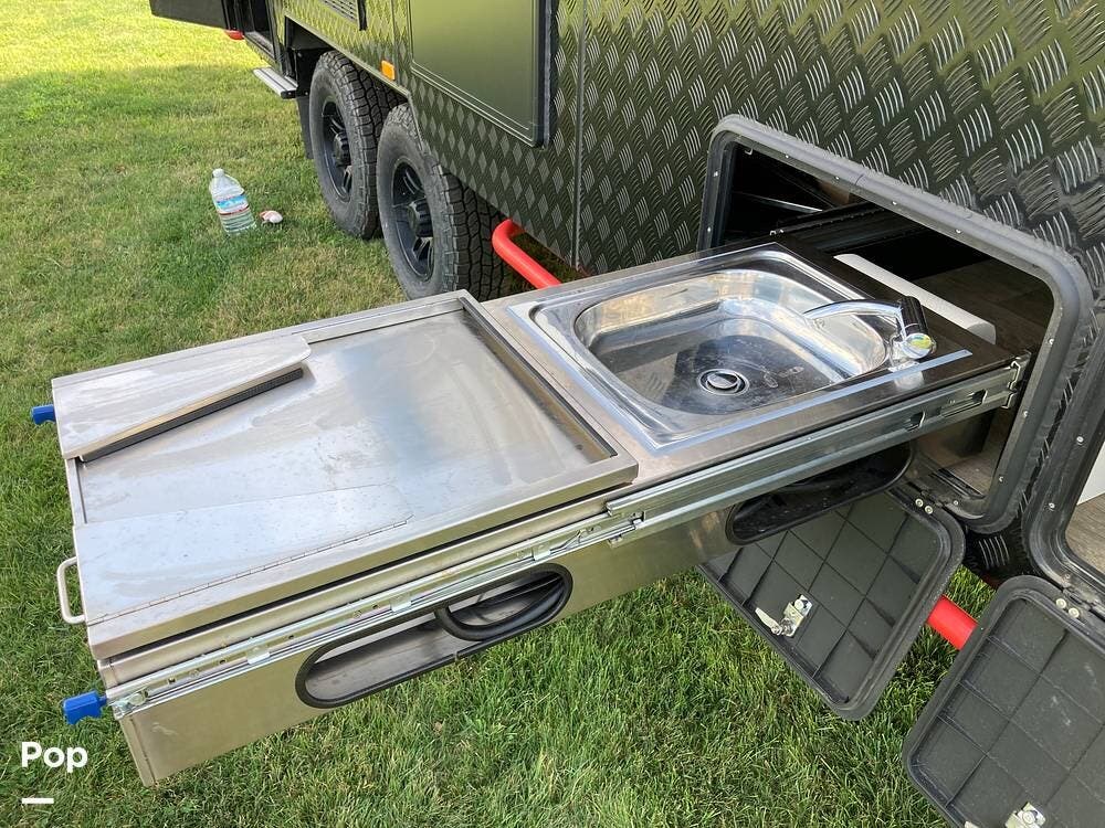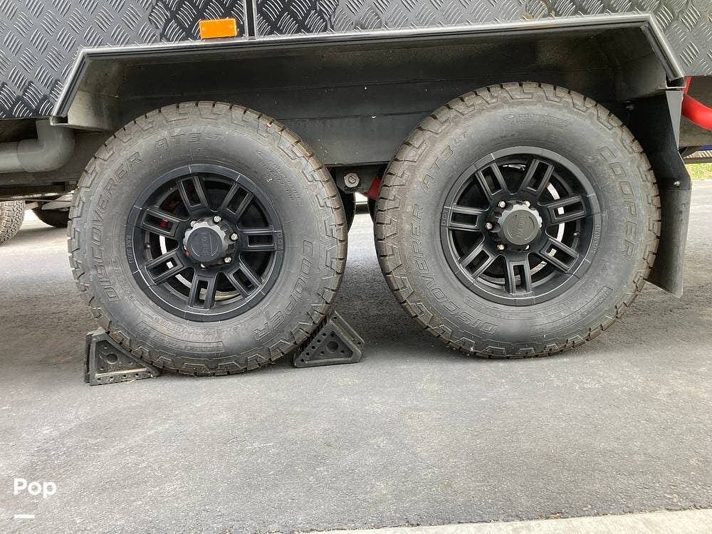 The outside has plenty of storage, slide-out cooking area, two propane tanks, two spare tires, super strong suspension, wide tires, and leveling jacks.