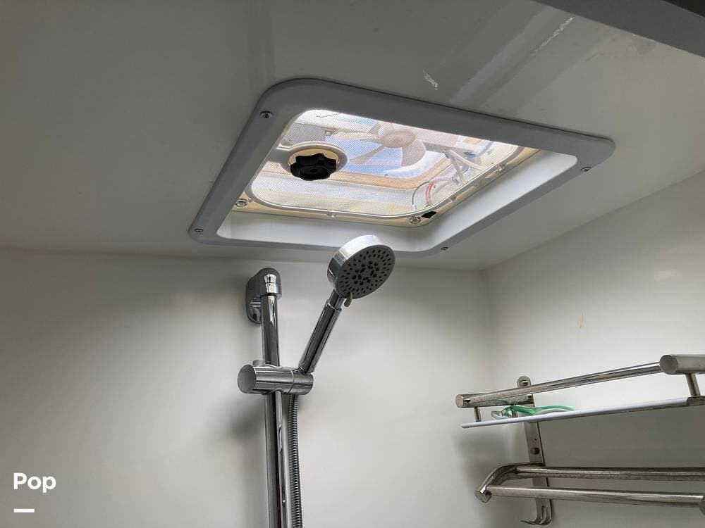 The shower has a seat, an adjustable wand, and a skylight/exhaust fan in the ceiling.