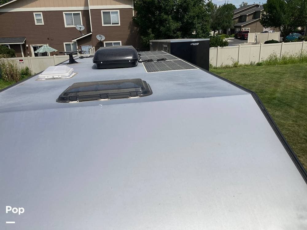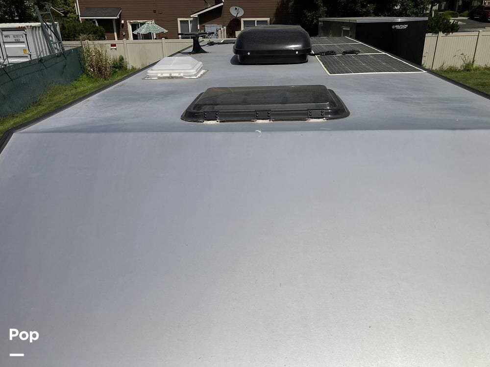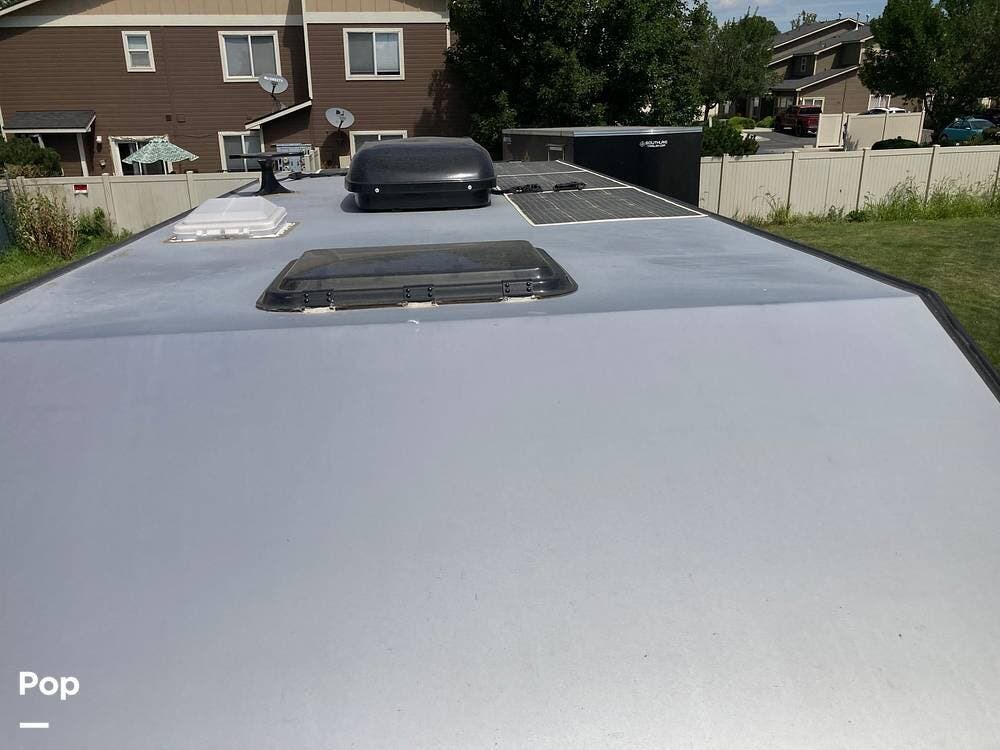 The roof is equipped with four - 150 watt solar panels that power four - 100 amp House batteries, a 13,500 BTU air conditioner, an HDTV antenna, and the two air vents.