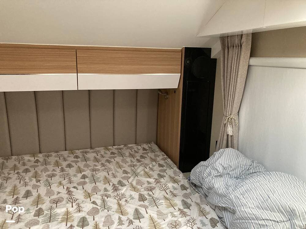 The bedroom has a queen bed, two hanging closets, an HDTV, and an opening ceiling vent with a hidden, slide-out screen and a sliding 'blackout' cover.