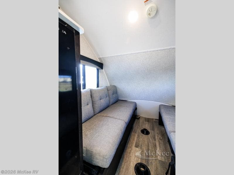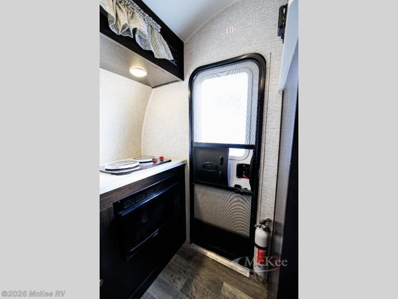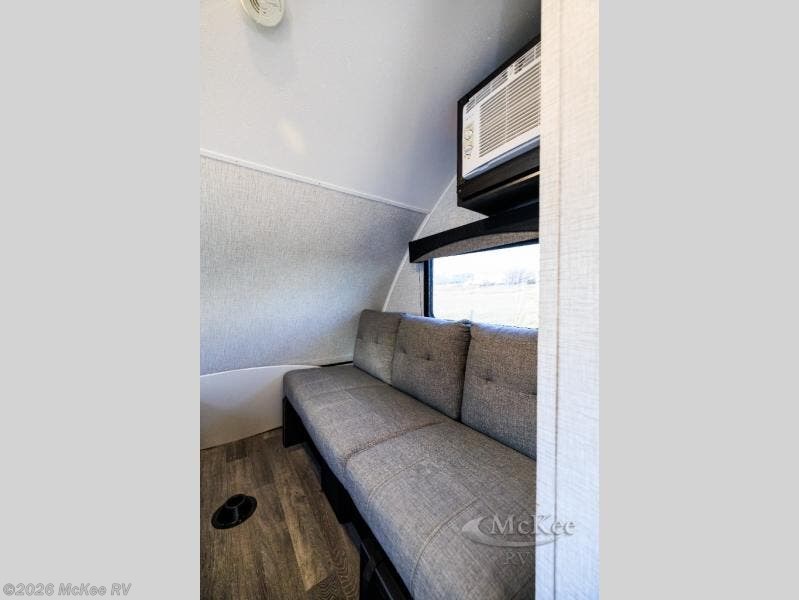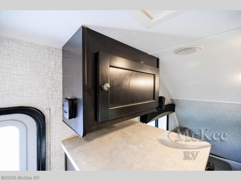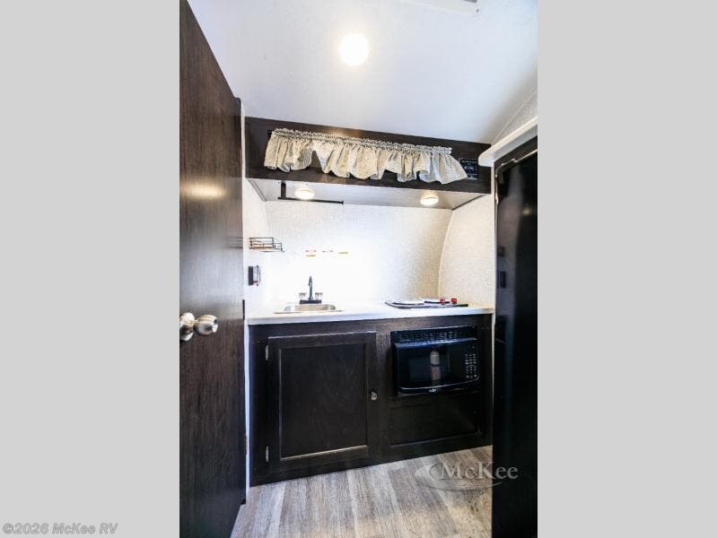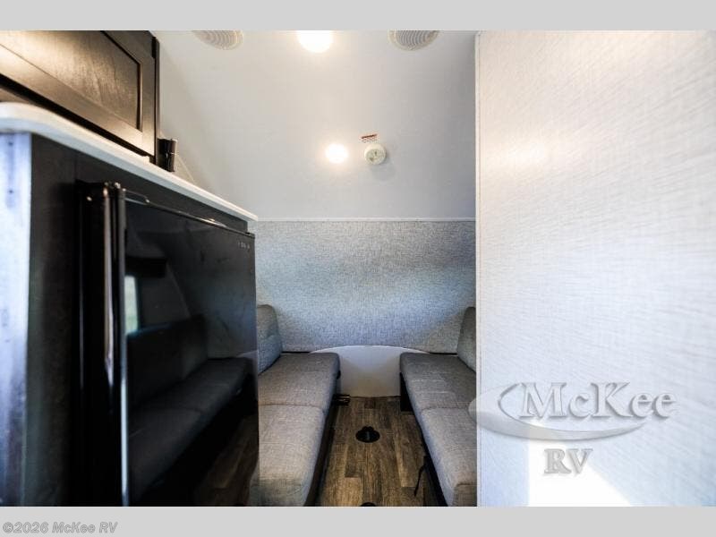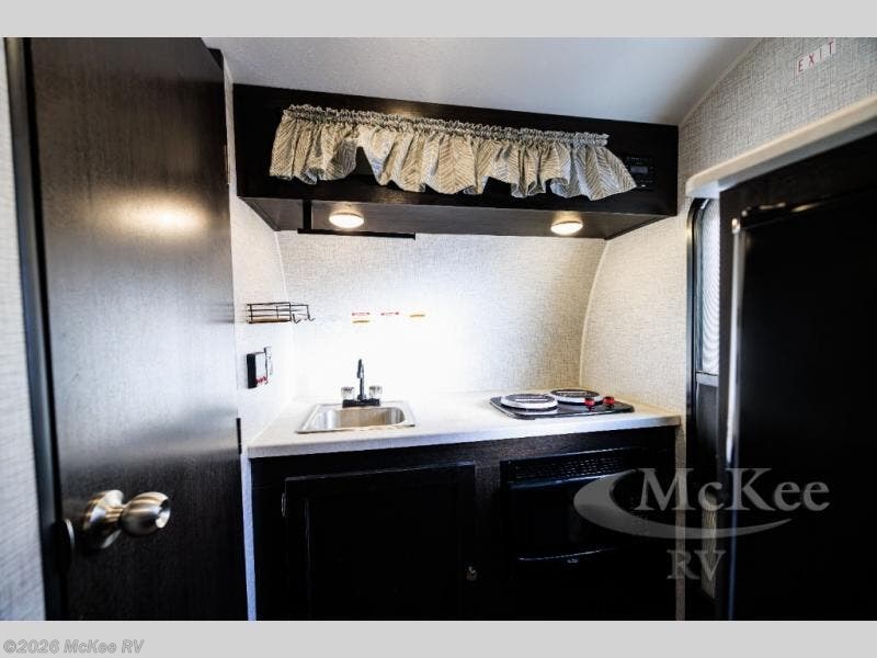 Everything you need on your adventures is found in this cute trailer for two. Once you've set up camp, head to the kitchen to prepare lunch on the two burner cooktop, then dine together on the jackknife sofas with a table in between. This model includes a full bath with a toilet and a shower with a door, and the sink is just outside the door; that's right, there's no wet bath for added comfort. You'll also find overhead cabinets for your necessities, plus a 12V refrigerator for perishables.