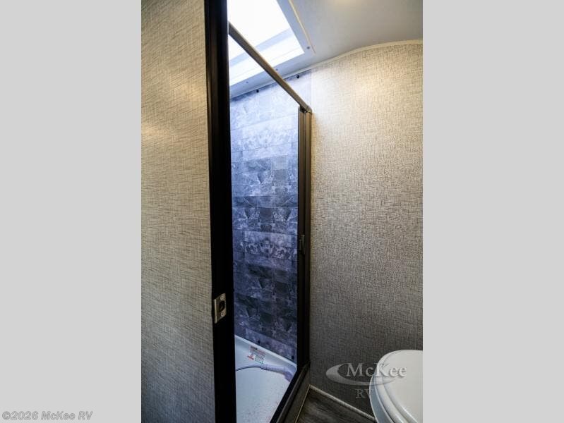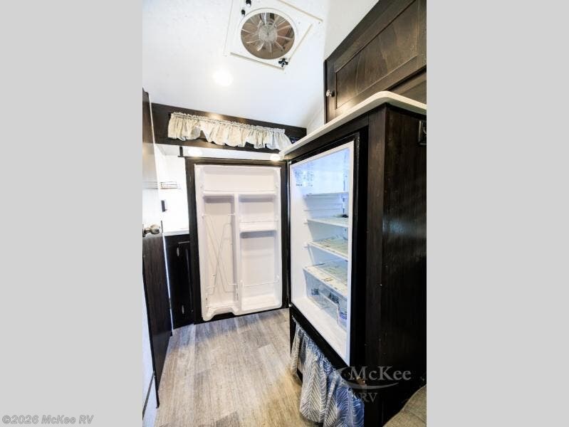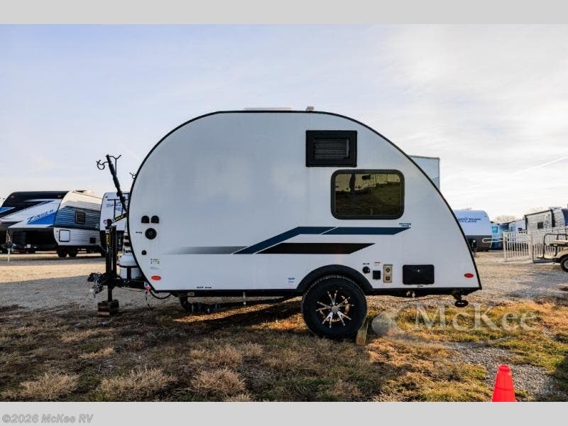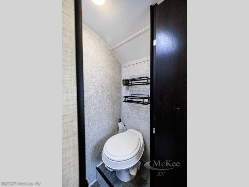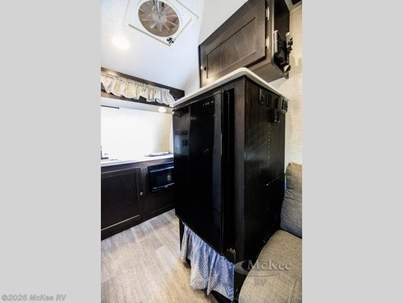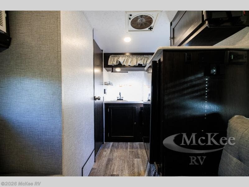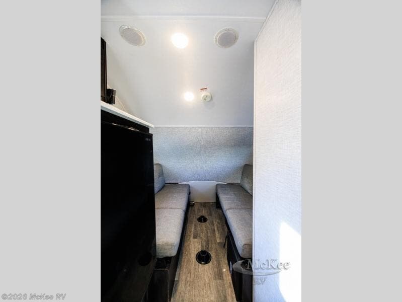 Everything you need on your adventures is found in this cute trailer for two. Once you've set up camp, head to the kitchen to prepare lunch on the two burner cooktop, then dine together on the jackknife sofas with a table in between. This model includes a full bath with a toilet and a shower with a door, and the sink is just outside the door; that's right, there's no wet bath for added comfort. You'll also find overhead cabinets for your necessities, plus a 12V refrigerator for perishables.