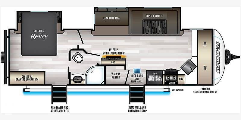 Outside, the Alpha Wolf keeps impressing. Picture yourself grilling at the outdoor kitchen under the massive 20' power awning, music playing softly through the exterior speakers. And thanks to the Juice Pack solar kit with a 50W panel, you'll have the power you need even when you're off the grid. Dual-entry doors, pass-through storage, and power stabilizer jacks make setup and takedown a breeze, allowing you to spend more time doing what you love.