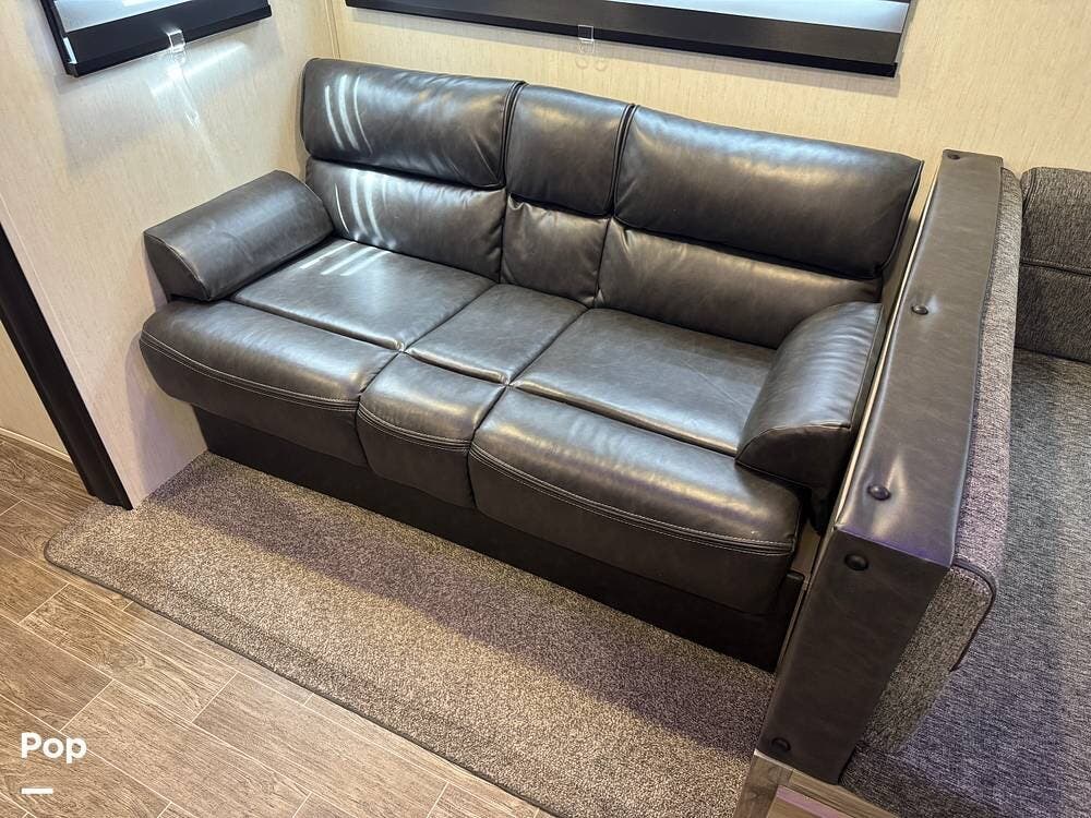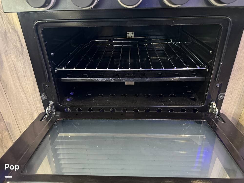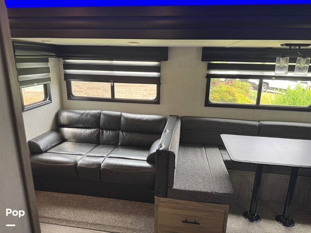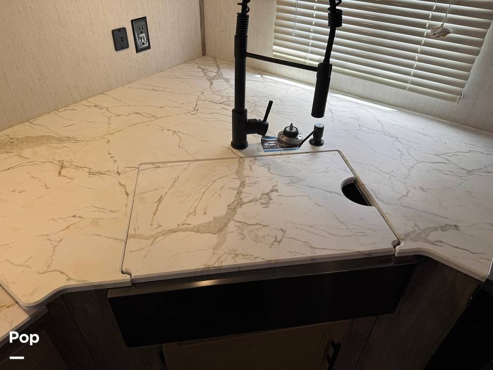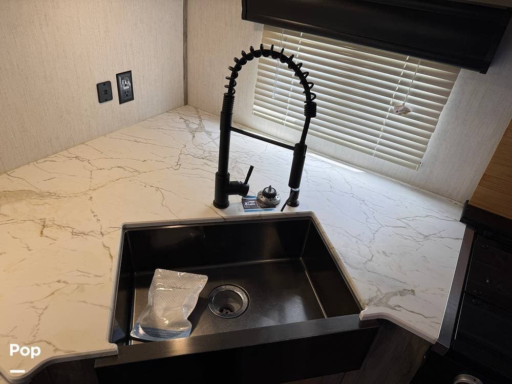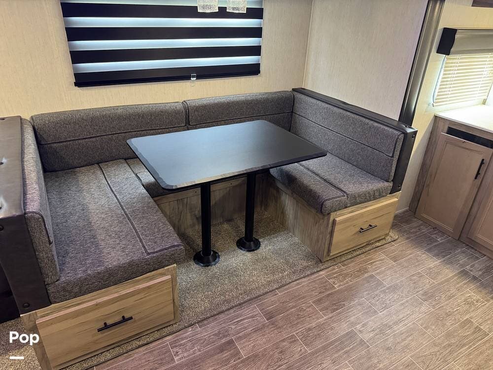 Step inside, and you'll feel like you've entered a modern apartment on wheels. The front kitchen greets you with residential touches, including a farm-style stainless steel sink and an 11-cubic-foot refrigerator. ft. refrigerator, a roomy pantry, and tons of counter space for meal prep. Cooking here isn't a chore -- it's part of the experience. Just imagine sipping your morning coffee in the oversized U-shaped dinette as the sunrise spills through the panoramic windows.