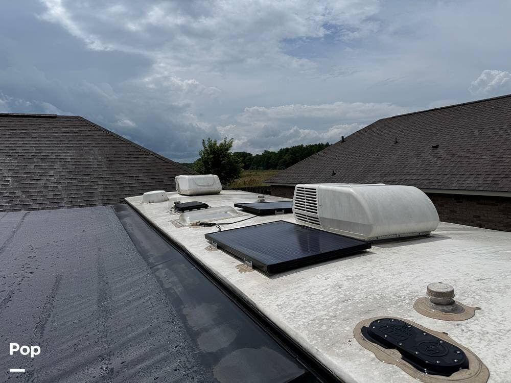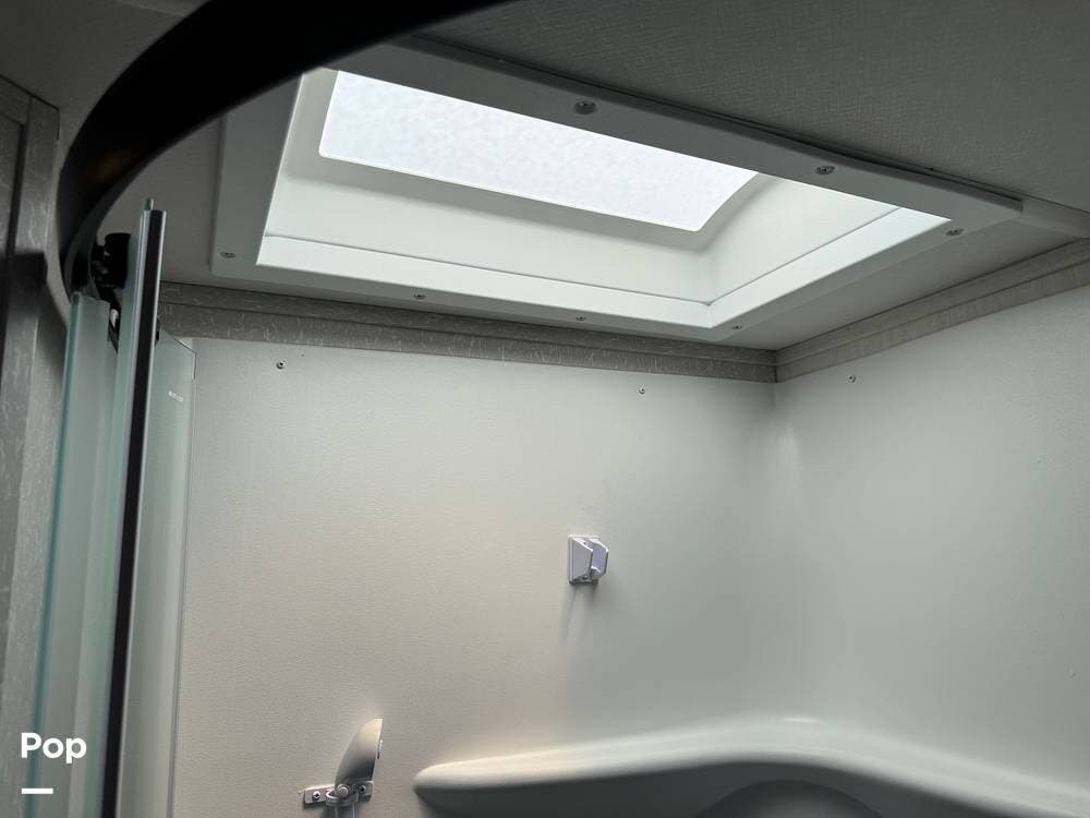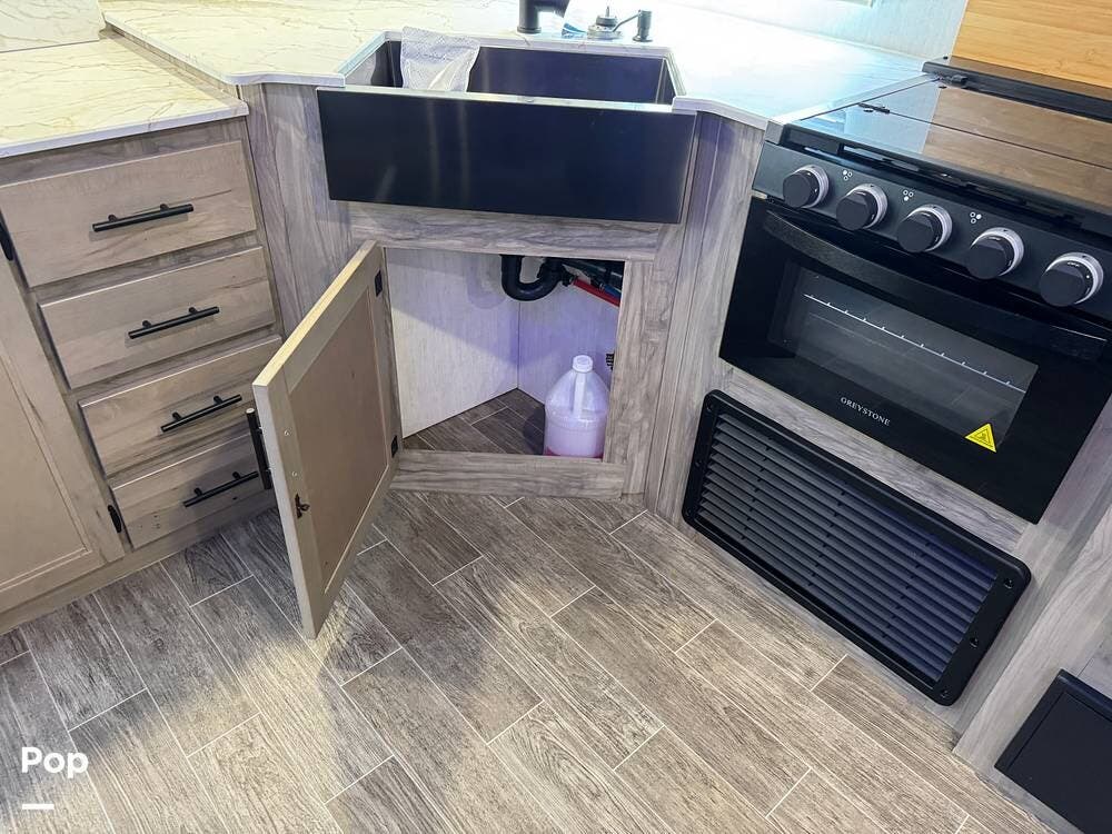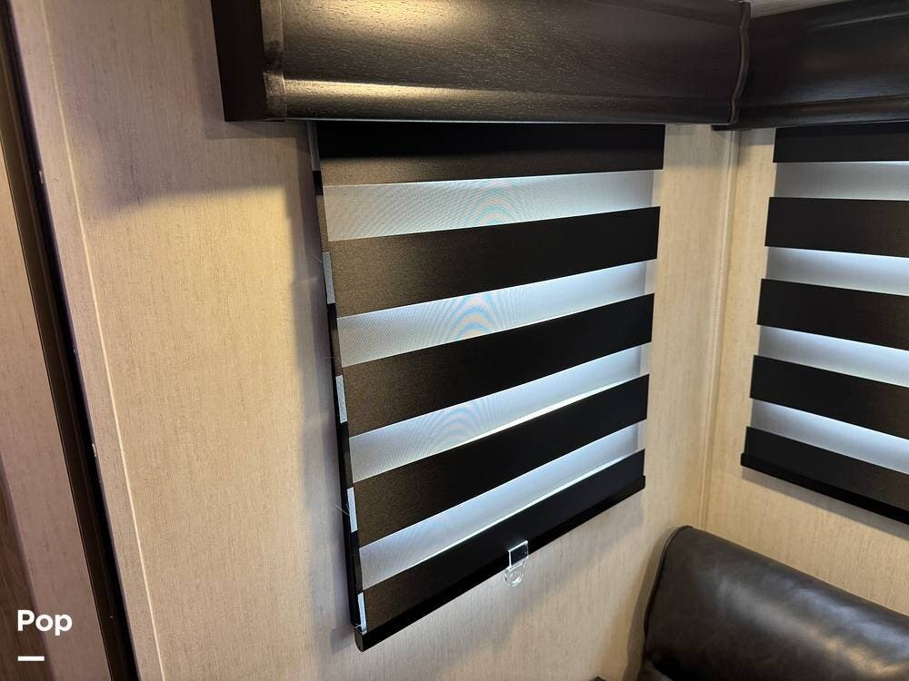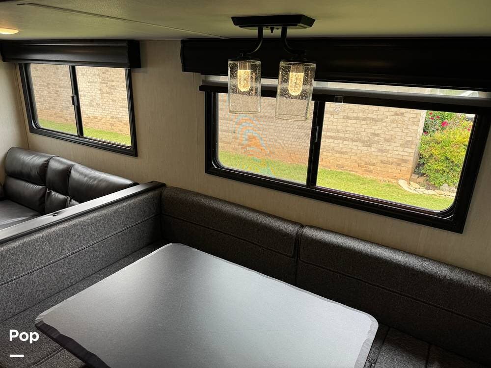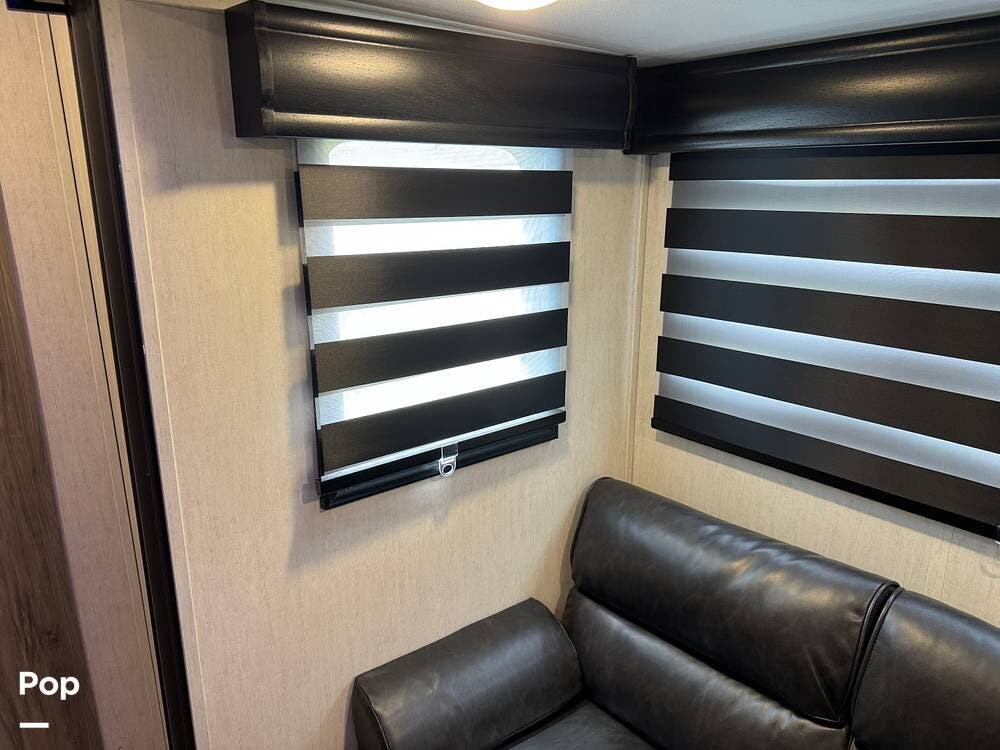 Step inside, and you'll feel like you've entered a modern apartment on wheels. The front kitchen greets you with residential touches, including a farm-style stainless steel sink and an 11-cubic-foot refrigerator. ft. refrigerator, a roomy pantry, and tons of counter space for meal prep. Cooking here isn't a chore -- it's part of the experience. Just imagine sipping your morning coffee in the oversized U-shaped dinette as the sunrise spills through the panoramic windows.