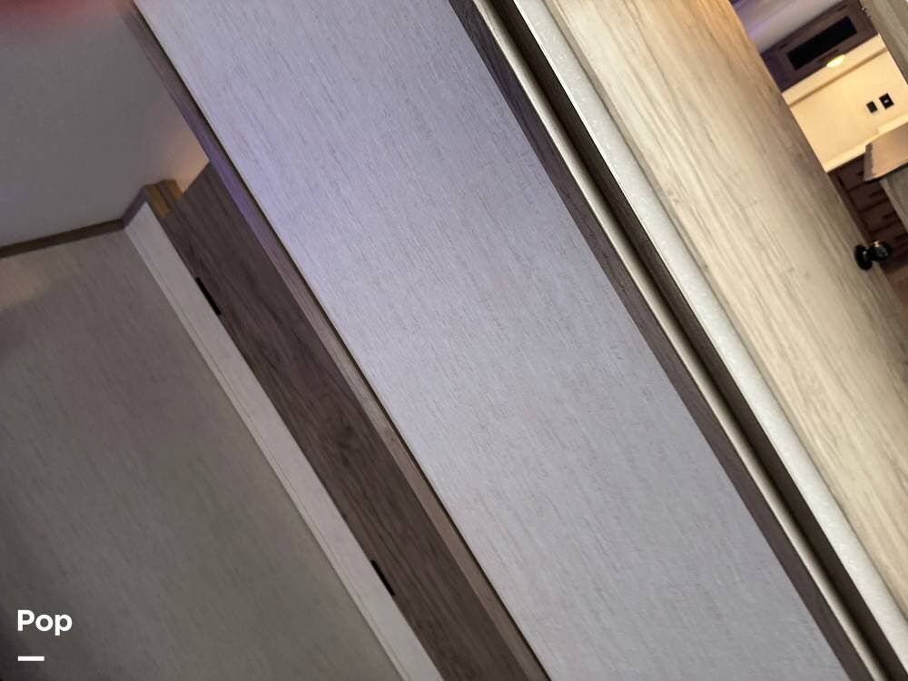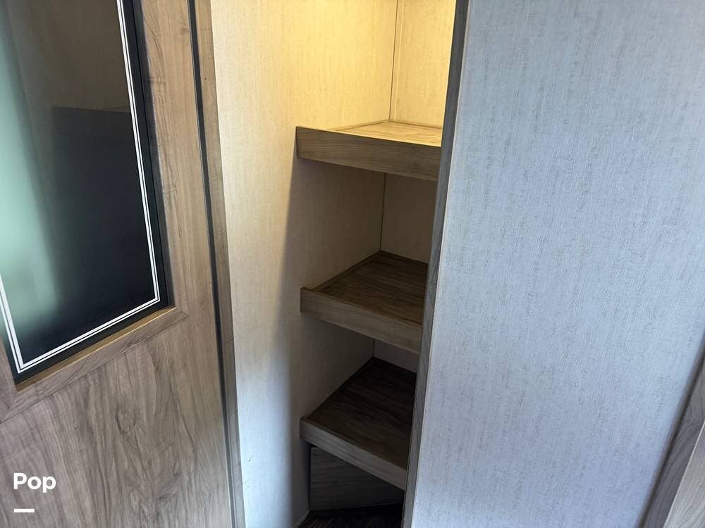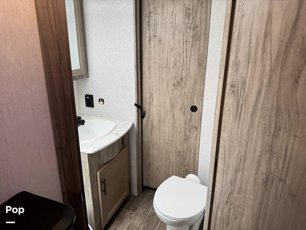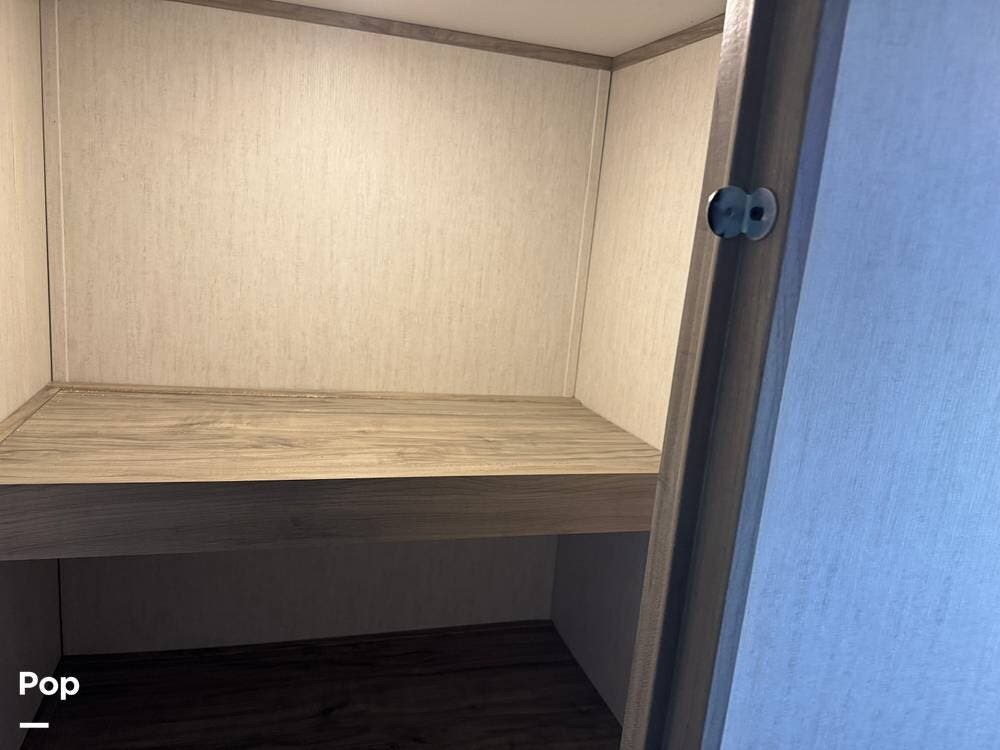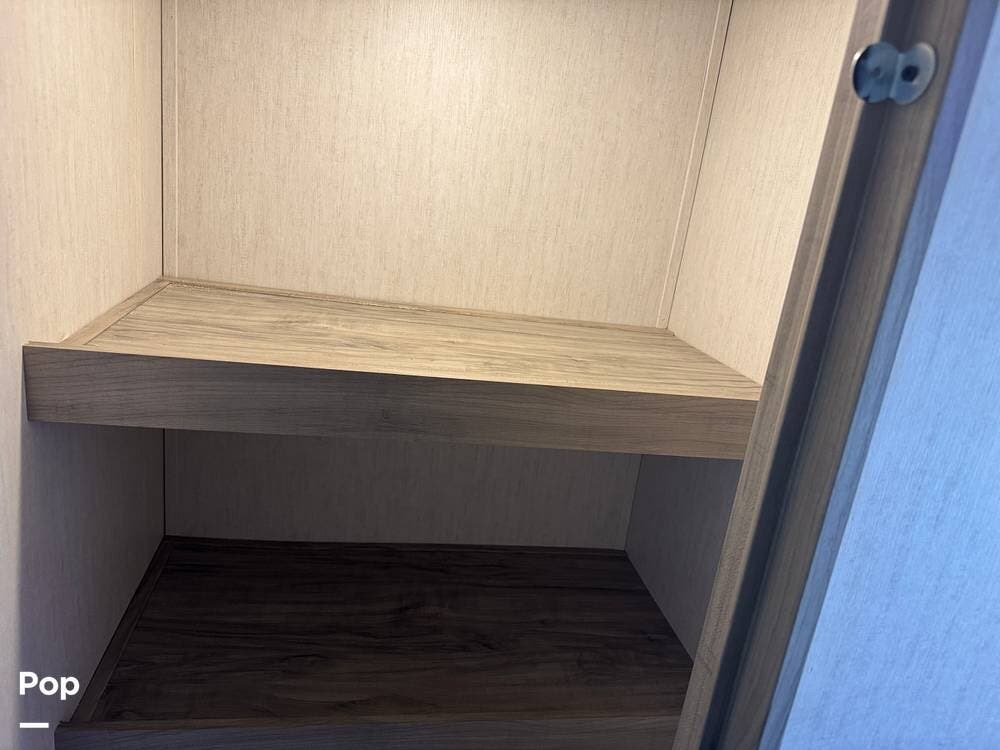 As you move toward the rear, the private master suite feels like your own retreat. The queen-size bed slides out for extra room, surrounded by dual closets and a dresser for all your clothes and gear. And here's the kicker: you get direct access to a spacious Jack-and-Jill bathroom, complete with a radius shower, dual entry doors, and modern fixtures. No more cramped campground restrooms--this one feels like home.