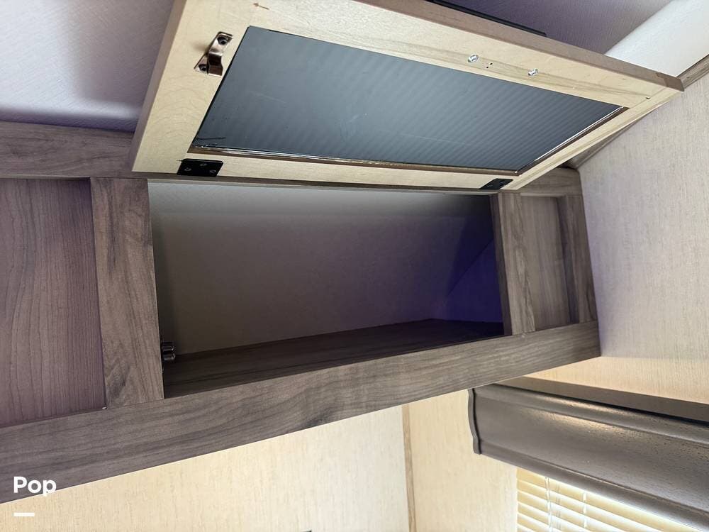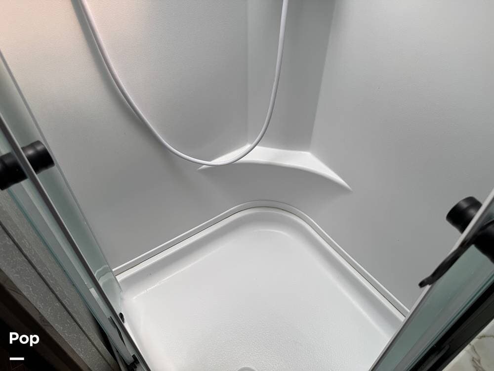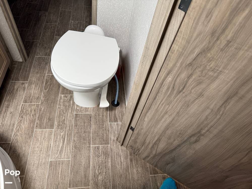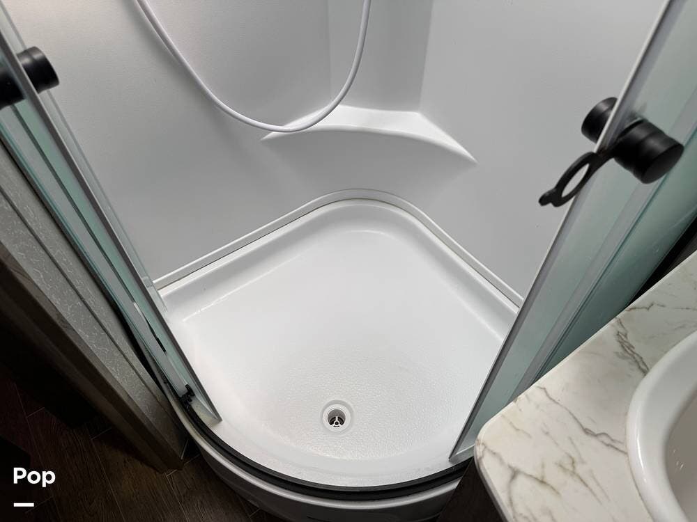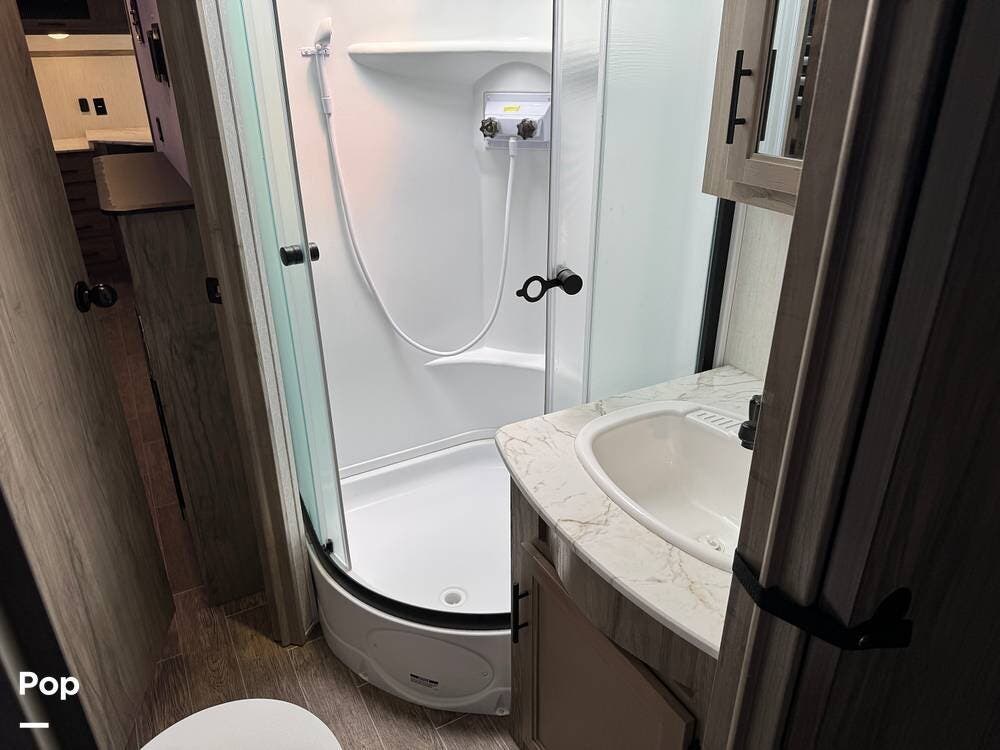 As you move toward the rear, the private master suite feels like your own retreat. The queen-size bed slides out for extra room, surrounded by dual closets and a dresser for all your clothes and gear. And here's the kicker: you get direct access to a spacious Jack-and-Jill bathroom, complete with a radius shower, dual entry doors, and modern fixtures. No more cramped campground restrooms--this one feels like home.