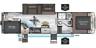 The exterior features include a propane connection, an outdoor mini fridge, large pass-thru storage, a 20' long awning, and 2 - 30 lb propane tanks.