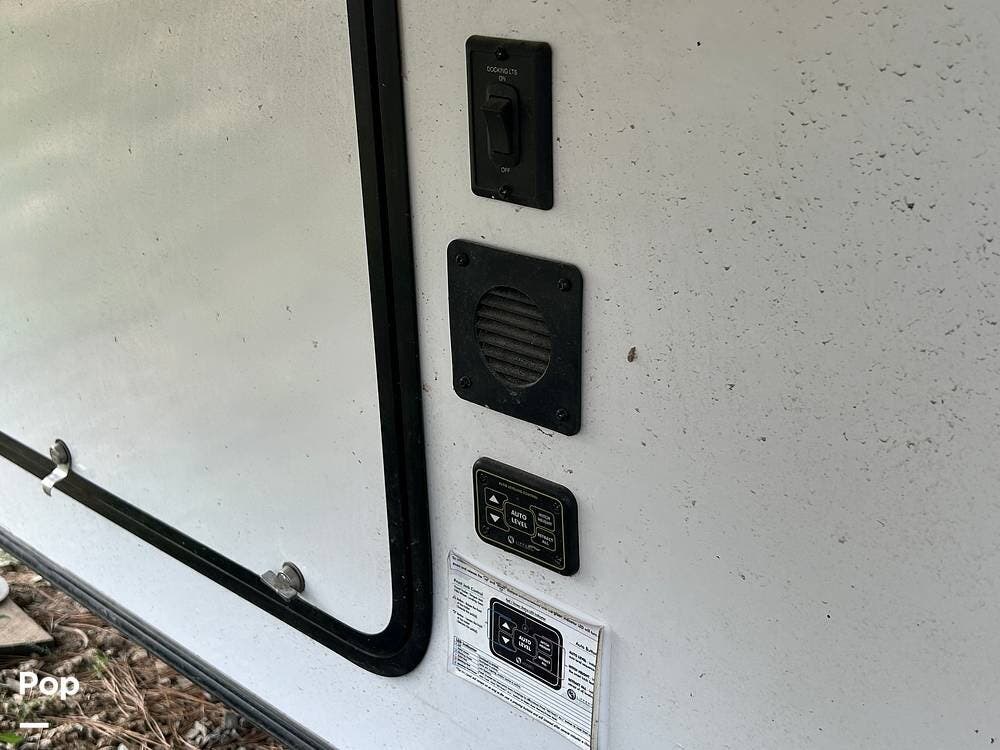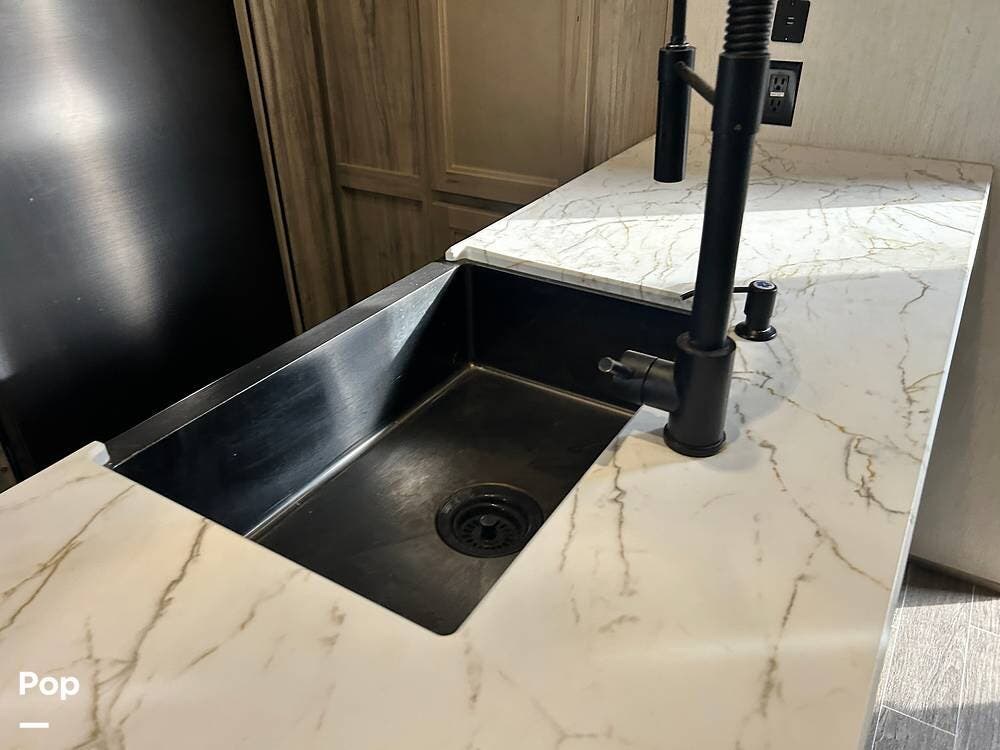 There is a huge double basement with electric leveling. In the camp side slide, there is a kitchen with a refrigerator with a freezer. It also has a cabinet, outlets, and a sink.