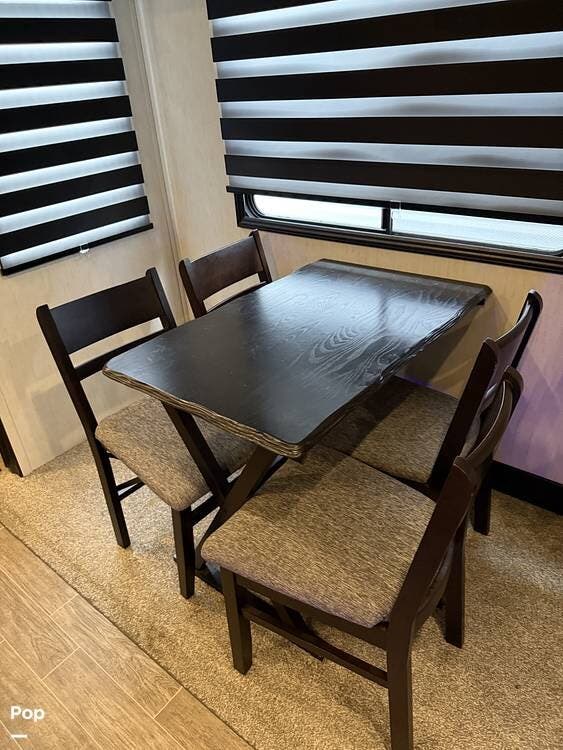 Towards the rear is a roomy kitchen that is fully equipped with a full-size refrigerator freezer. There is also a full-size table with four chairs.