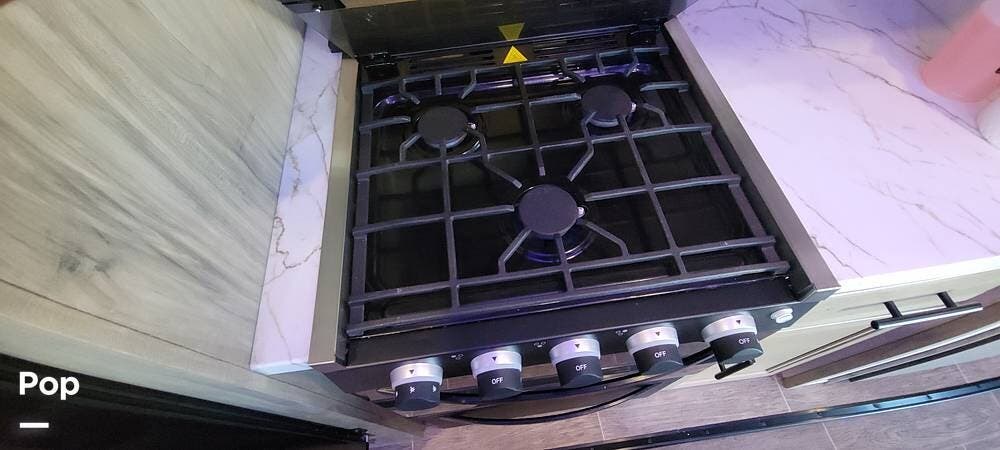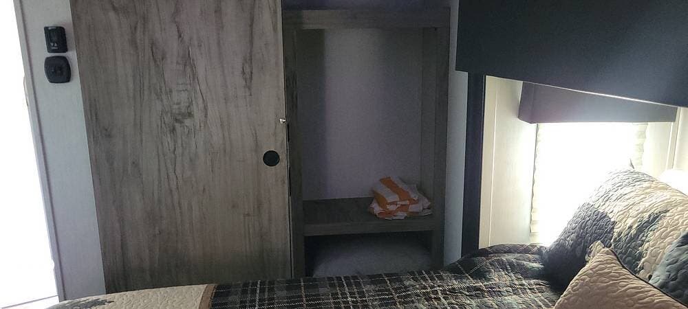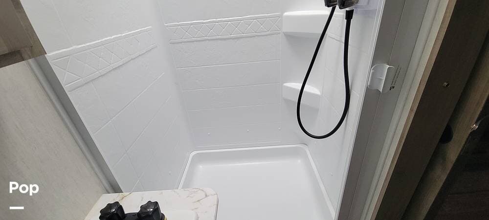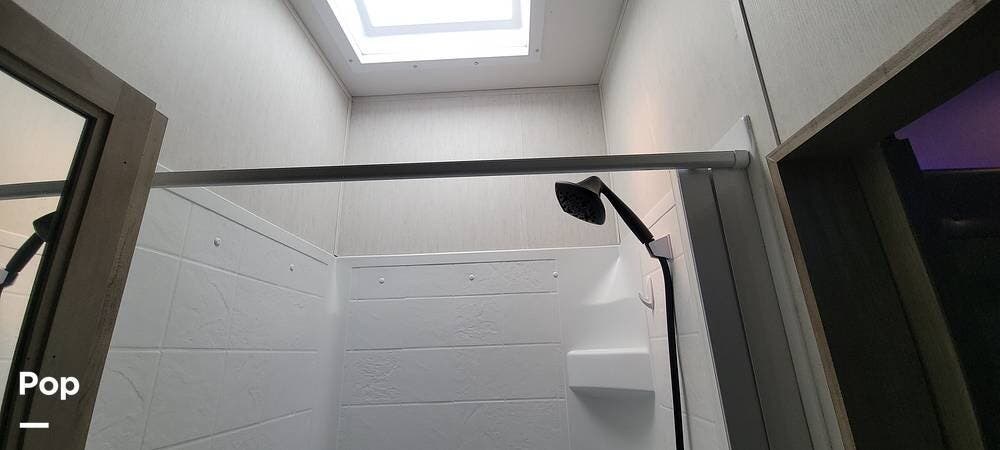 The RV features a king-size mattress, two full bathrooms, one located in the rear bedroom with increased floor space, a larger main bedroom area with full closets, and a washer and dryer prep station. With a tankless water heater, you will never run out of hot water, even with two baths.