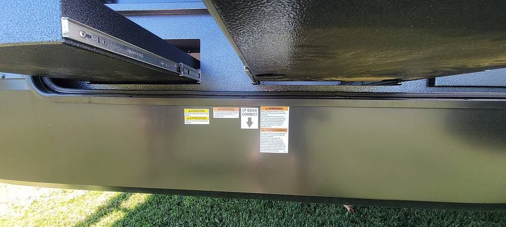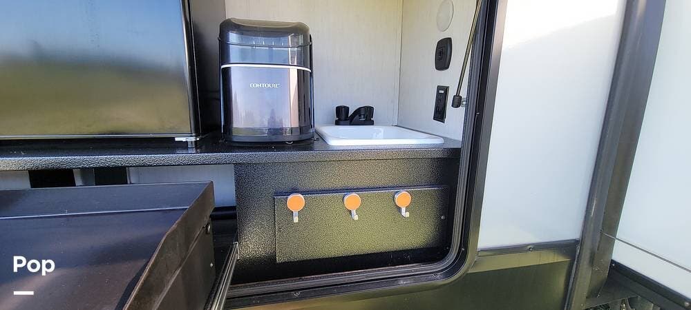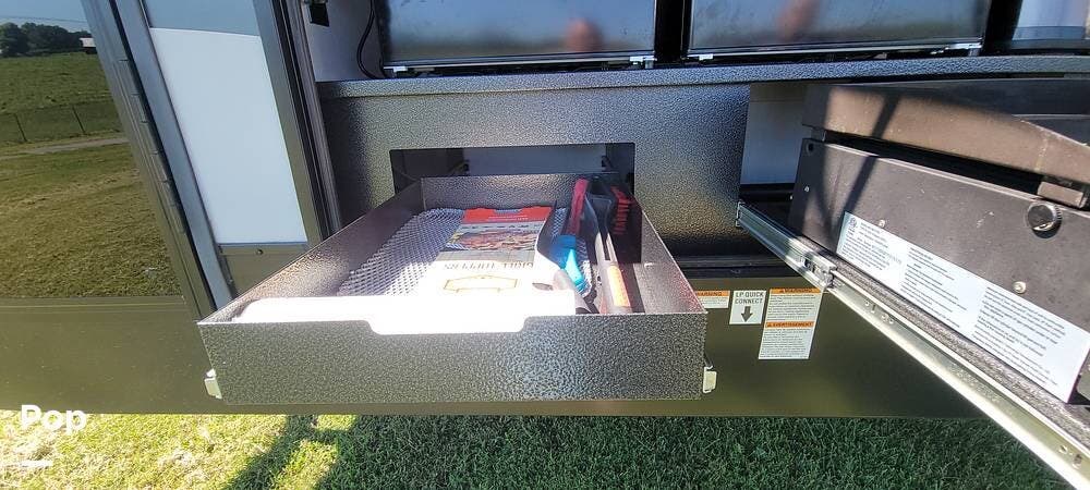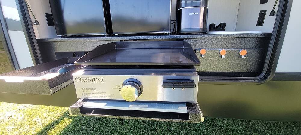 The RV has a substantial outdoor kitchen with two mini fridges/freezers and a griddle. Lots of basement space and pass-through stowage.