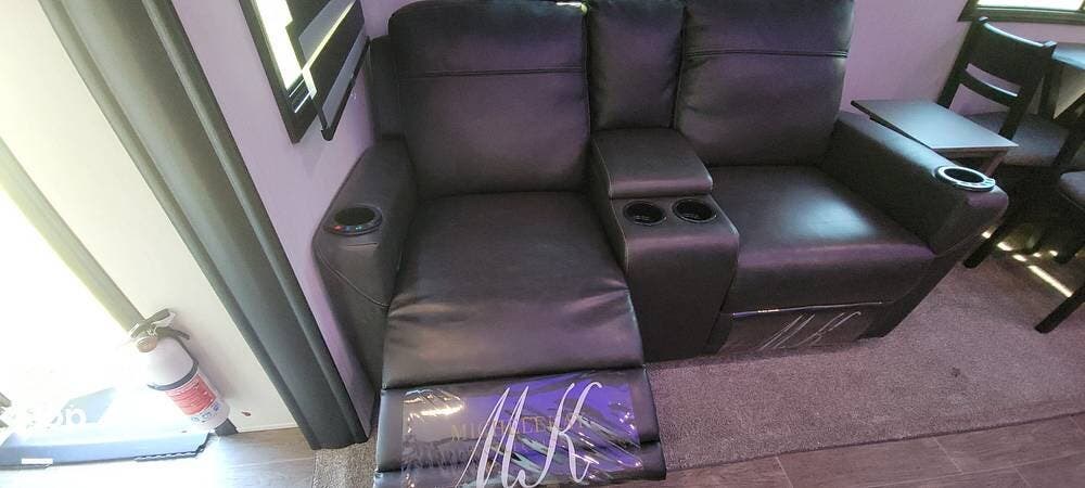 Additionally, it features a fireplace and two reclining, heated massage chairs. It has a dining table with chairs, and USB charging ports throughout.