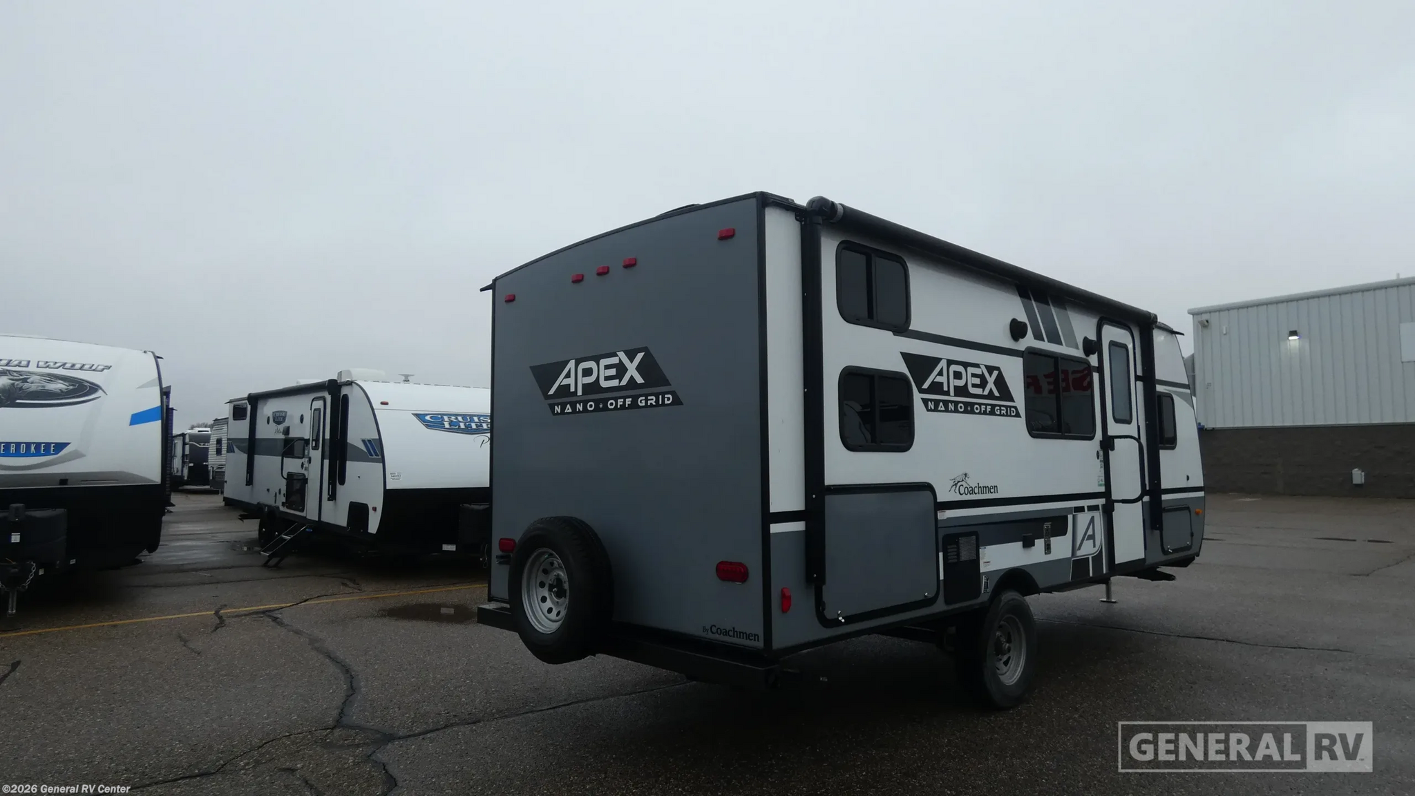 You will have more walking around space with a booth dinette slide in this travel trailer! The chef will love cooking indoors with the two burner cooktop, microwave, and 6 cu. ft. gas/electric refrigerator, as well as outdoors with the exterior camp kitchen. Start each morning feeling clean and refreshed after sleeping on the front queen bed with a headboard and showering in the tub/shower inside the rear corner bathroom, plus the bathroom has a wardrobe to keep your towels close. The kids will love sleeping on the rear corner set of 30" x 74" bunk beds too! You will find comfort, convenience, and a sturdy construction with each of these Coachmen RV Apex Nano travel trailers! They are held together with an aluma-cage construction, vacuum-bonded Azdel fiberglass walls, an I-beam chassis, and a roof membrane with Dicor Crossflex, plus the powder coated frame is corrosion resistant. The Dexter E-Z lube axles and nitrogen filled radial tires will help you arrive safely. The mandatory Nano package comes with many features to make camp life better like magnetic baggage door catches, outside speakers, a digital TV antenna with cable hook-ups and WiFi capability, and a hot/cold outside shower to keep the dirt outside where it belongs. Come find the perfect model that fits your needs today!