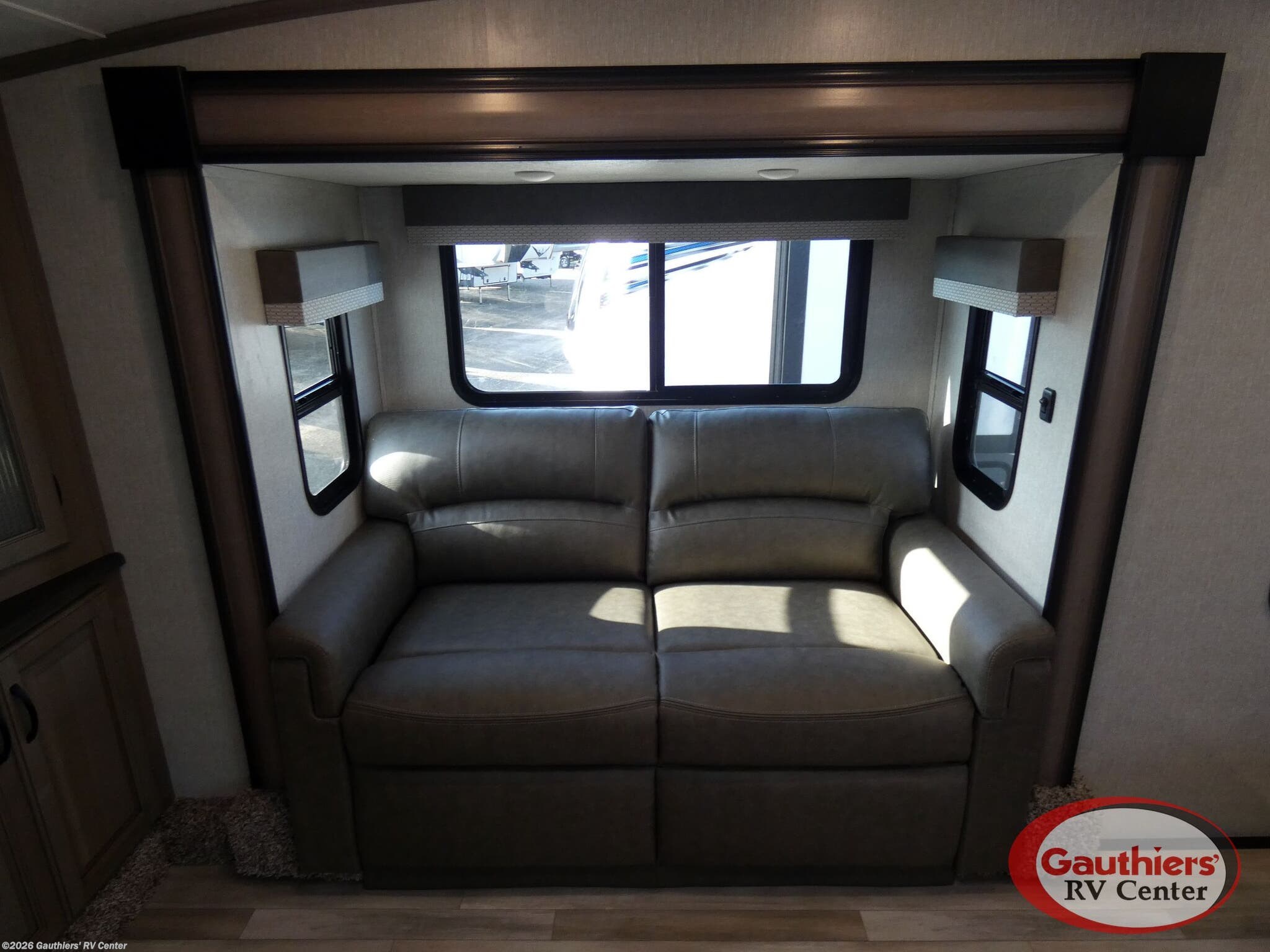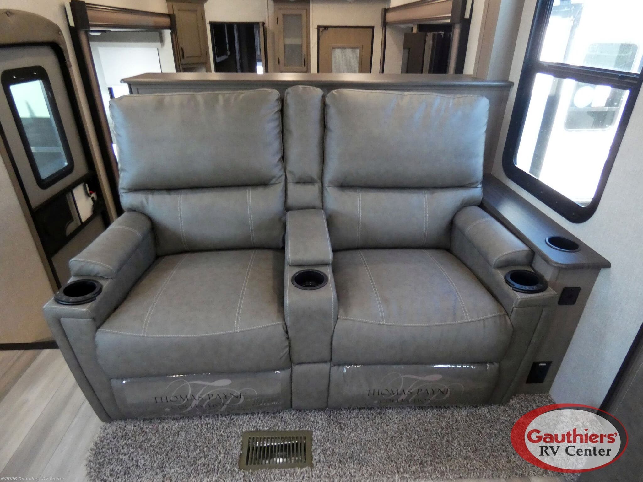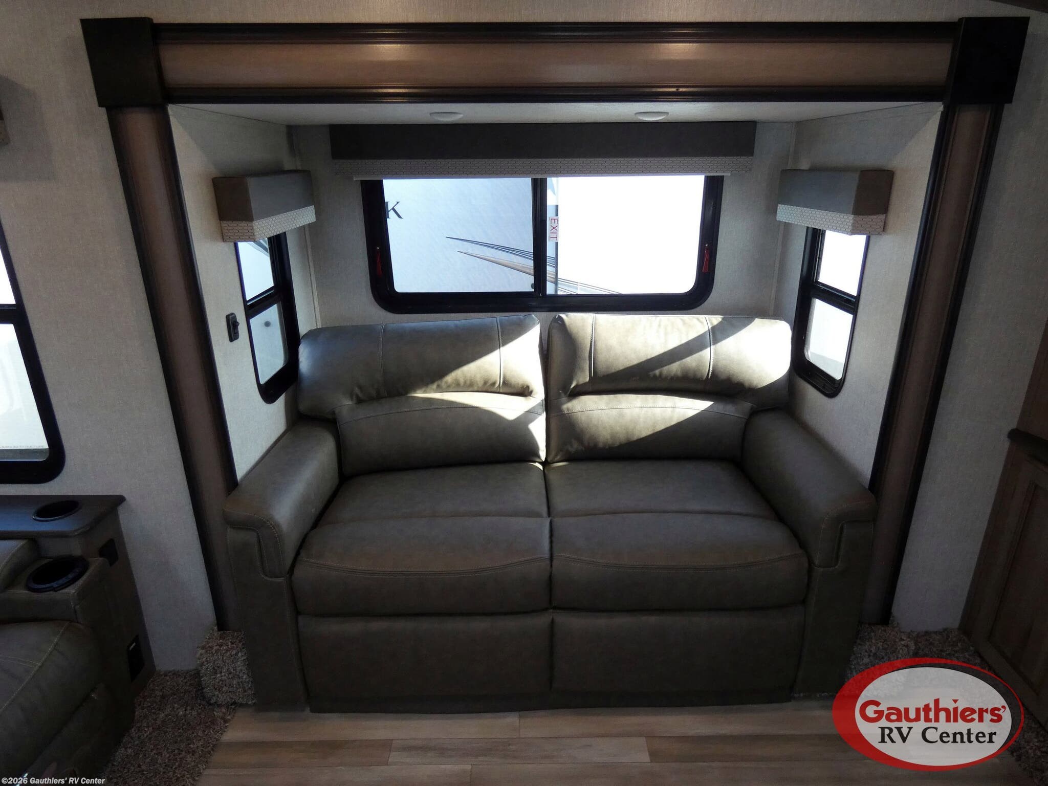 FIVE SLIDE FRONT LIVING FIFTH WHEEL W/ 6 POINT AUTO LEVELING, POWER AWNING, THEATER SEATING, KING SIZE BED, WASHER-DRYER PREP, AND 12 VOLT 10 CU FT REFRIGERATOR.