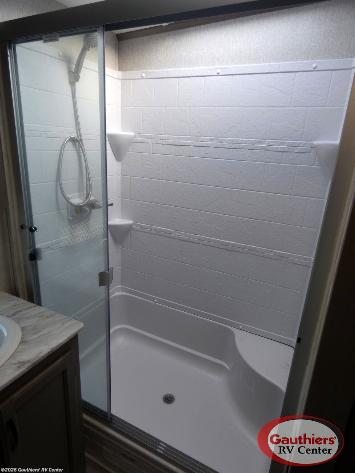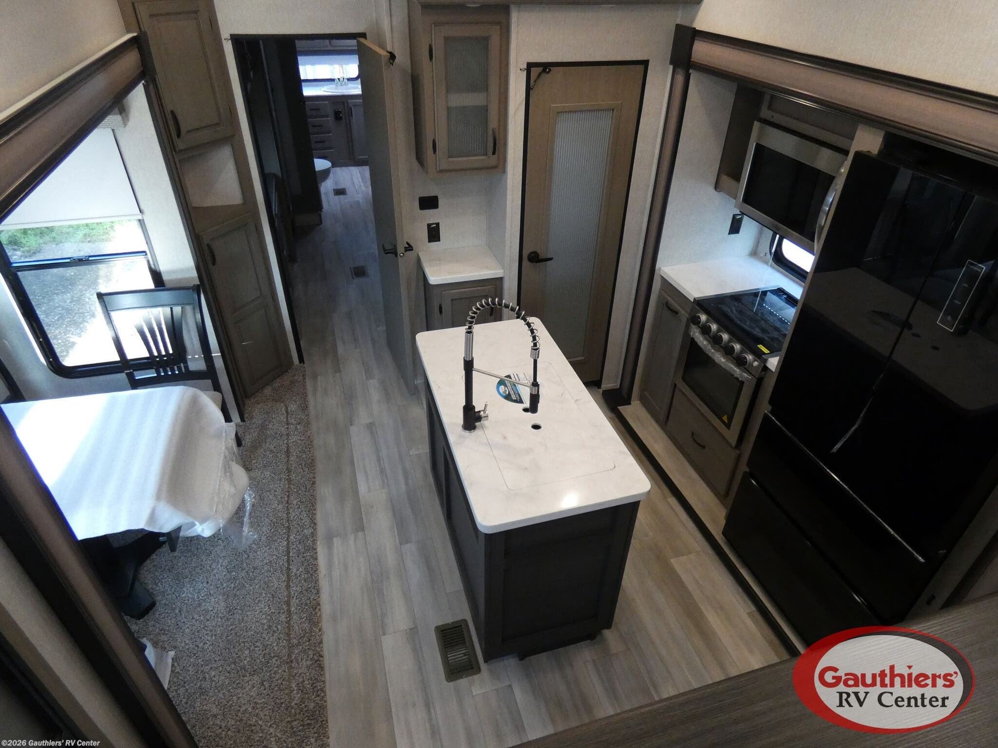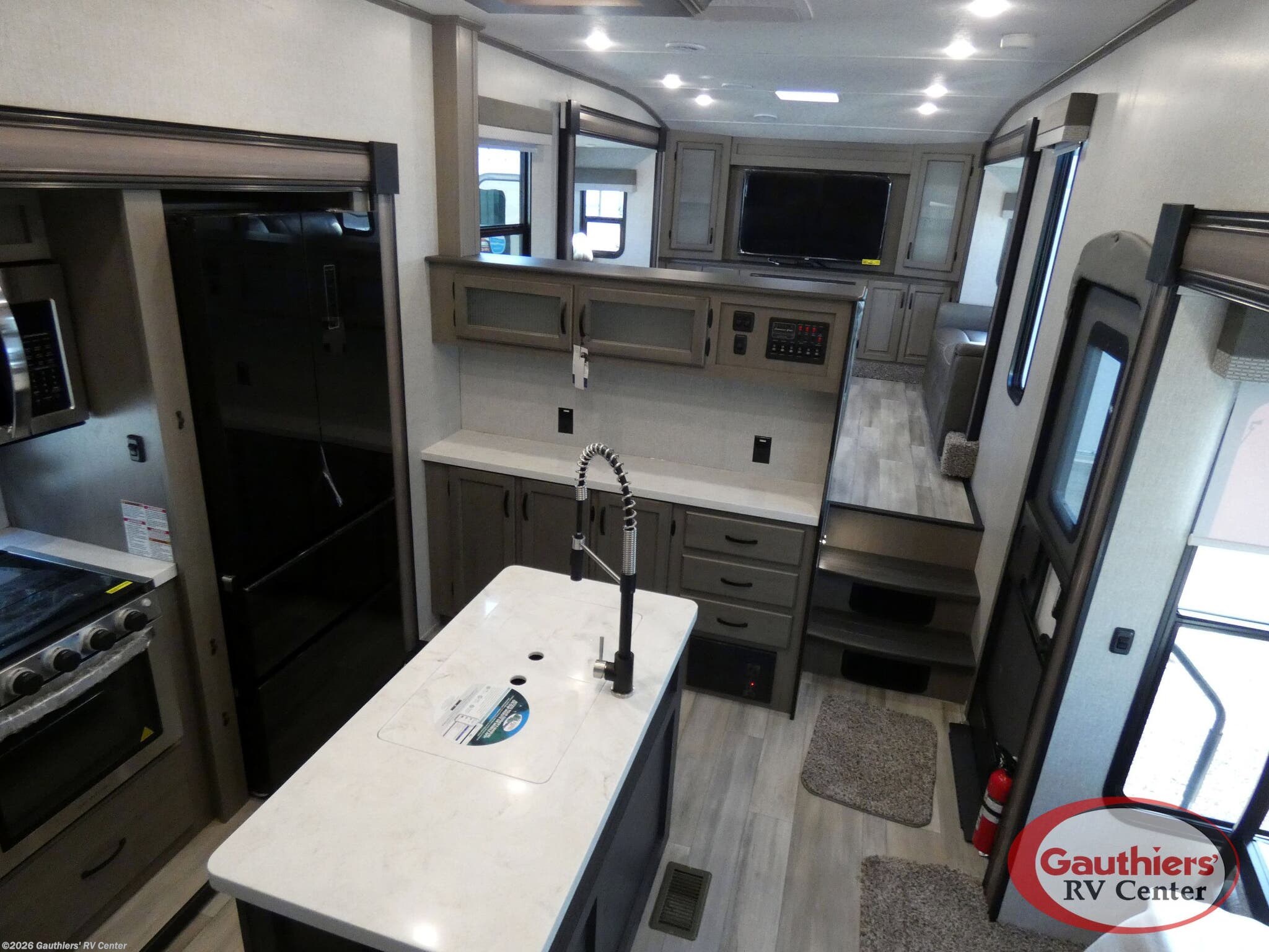 FIVE SLIDE FRONT LIVING FIFTH WHEEL W/ 6 POINT AUTO LEVELING, POWER AWNING, THEATER SEATING, KING SIZE BED, WASHER-DRYER PREP, AND 12 VOLT 10 CU FT REFRIGERATOR.