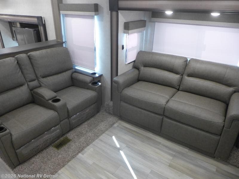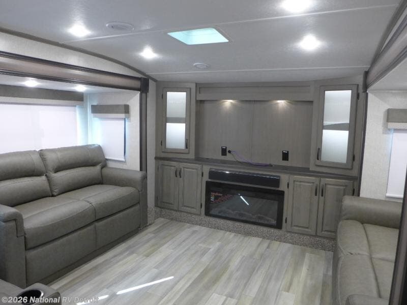 Camping or full-timing in this spacious fifth wheel will make the whole family happy. Your crew will love to visit in the front living area that included two tri-fold hide-a-bed sofas, theatre seating with a side table, plus an entertainment center for an optional 50" LED TV. The kitchen is any chef's dream with its kitchen island, residential pantry, plus a second pantry, and stainless steel appliances. And the free-standing table will allow you to dine just like you do at home. Head to the master suite to find a queen bed slide out with a king bed option, two dressers, plus a full rear bath with dual bath sinks! This model also includes an outdoor small refrigerator for cold drinks or snacks for the little ones!