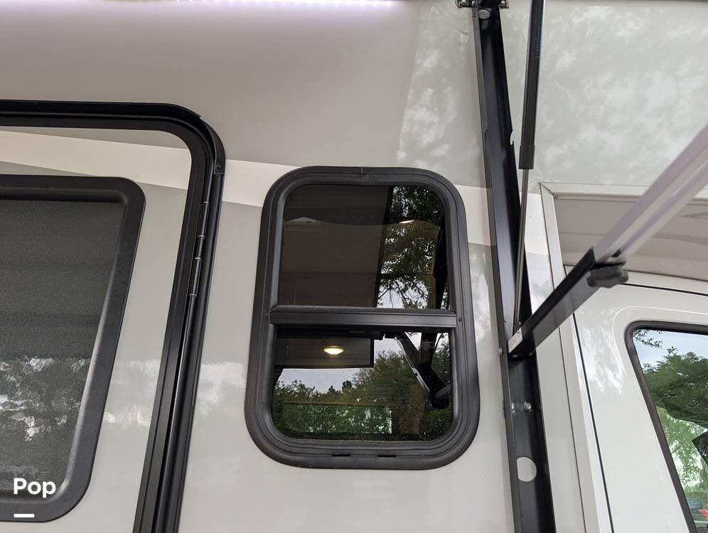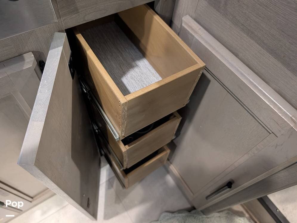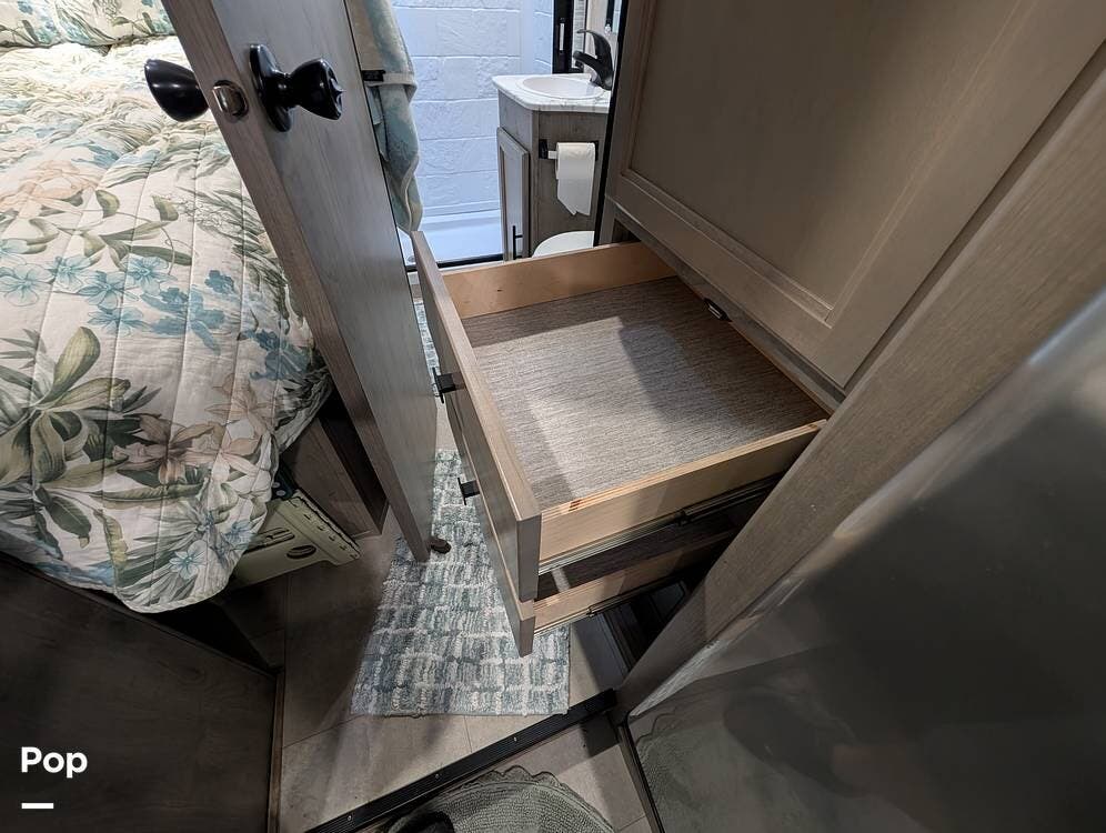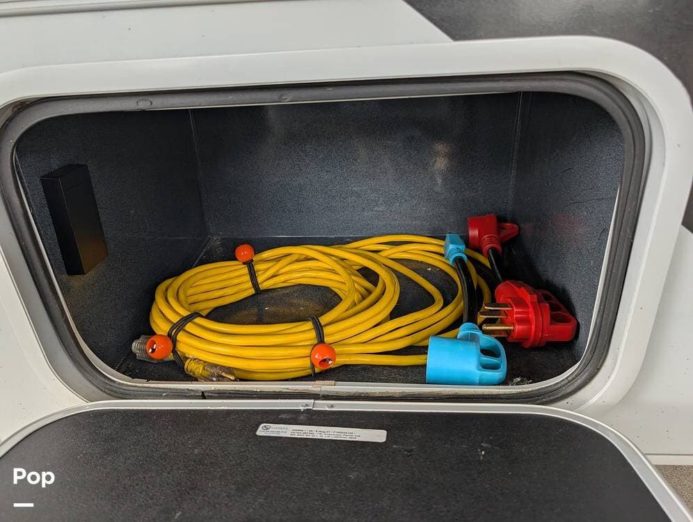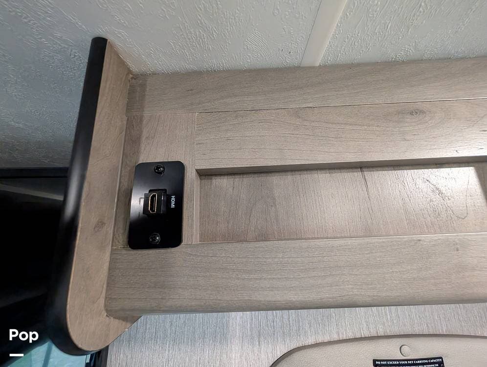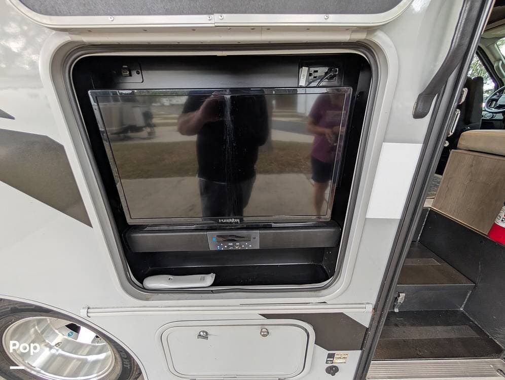 On the exterior, you'll find a power awning, an exterior TV for outdoor entertainment, and ample storage for all your travel gear.