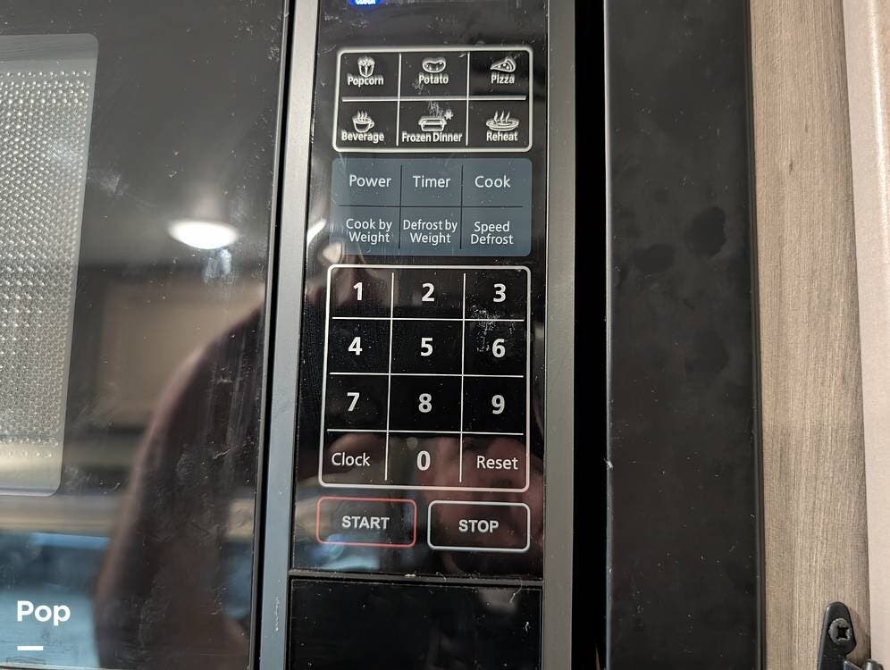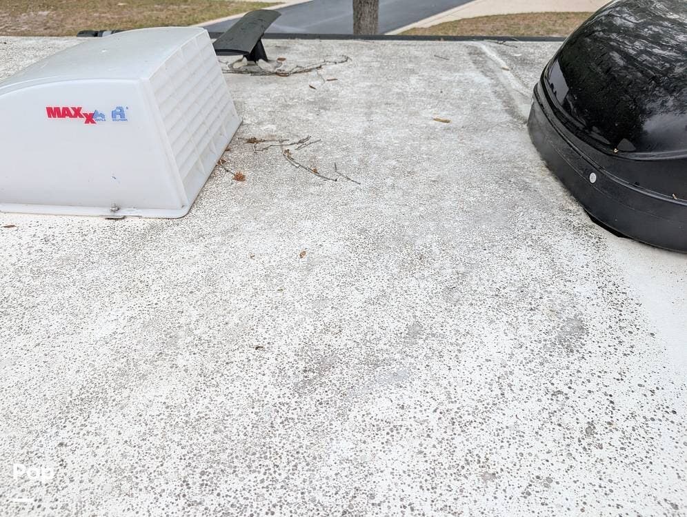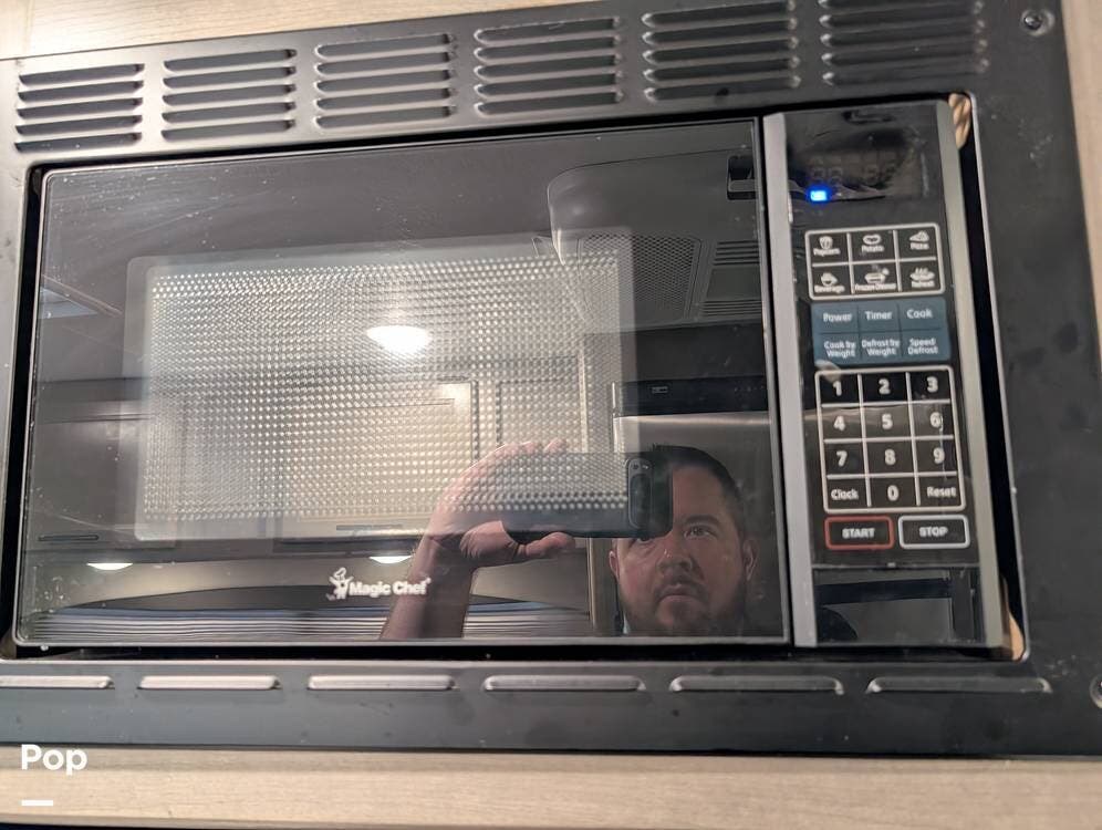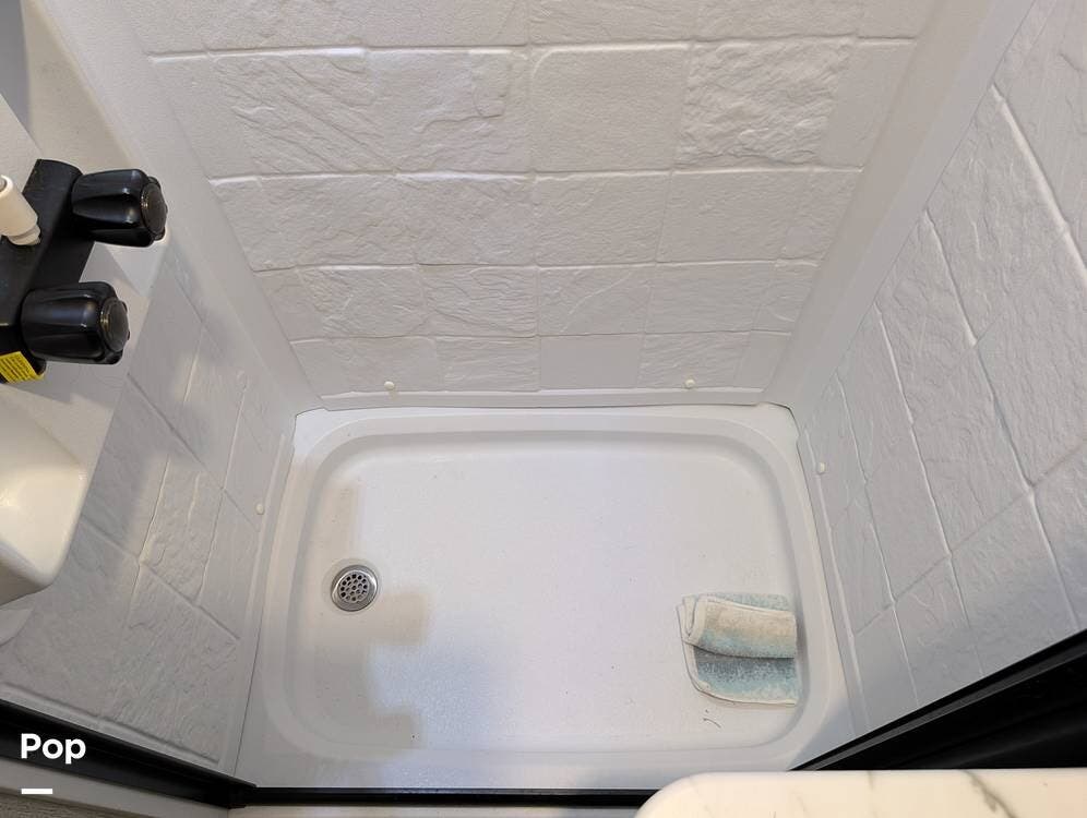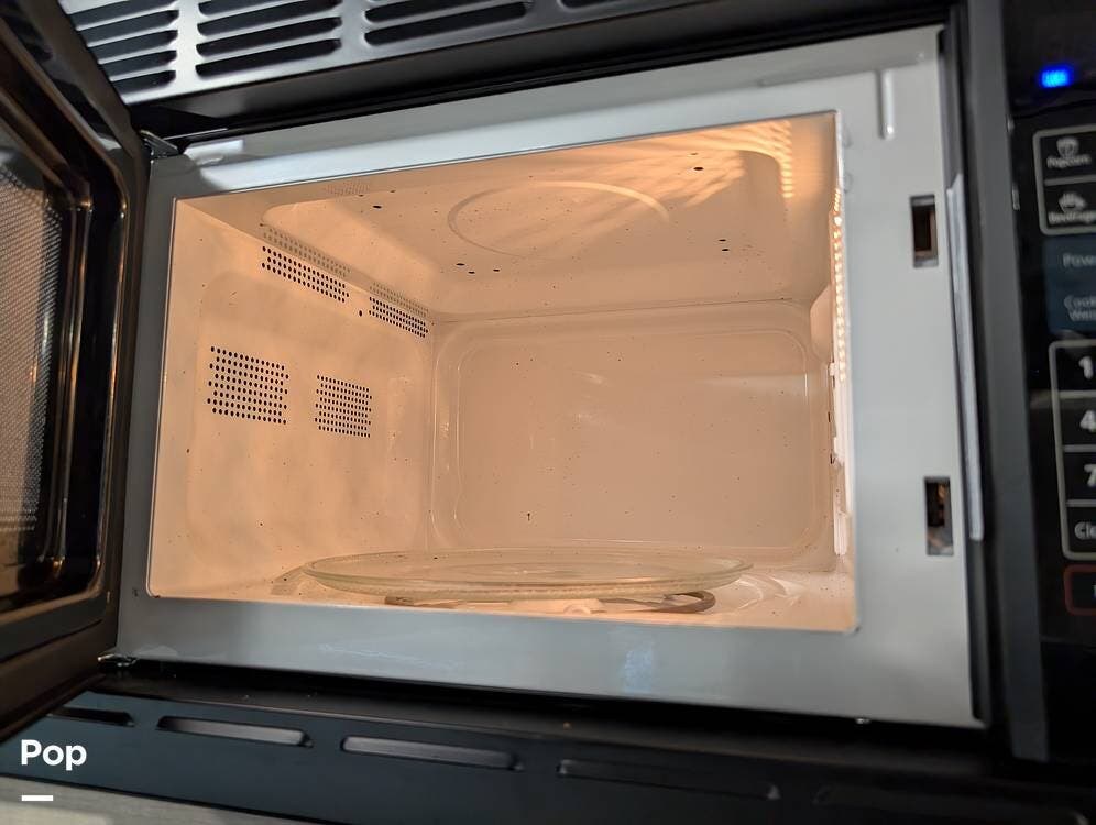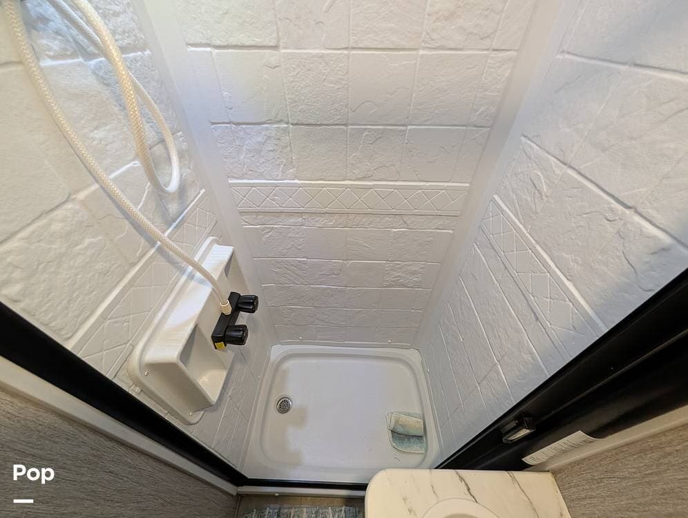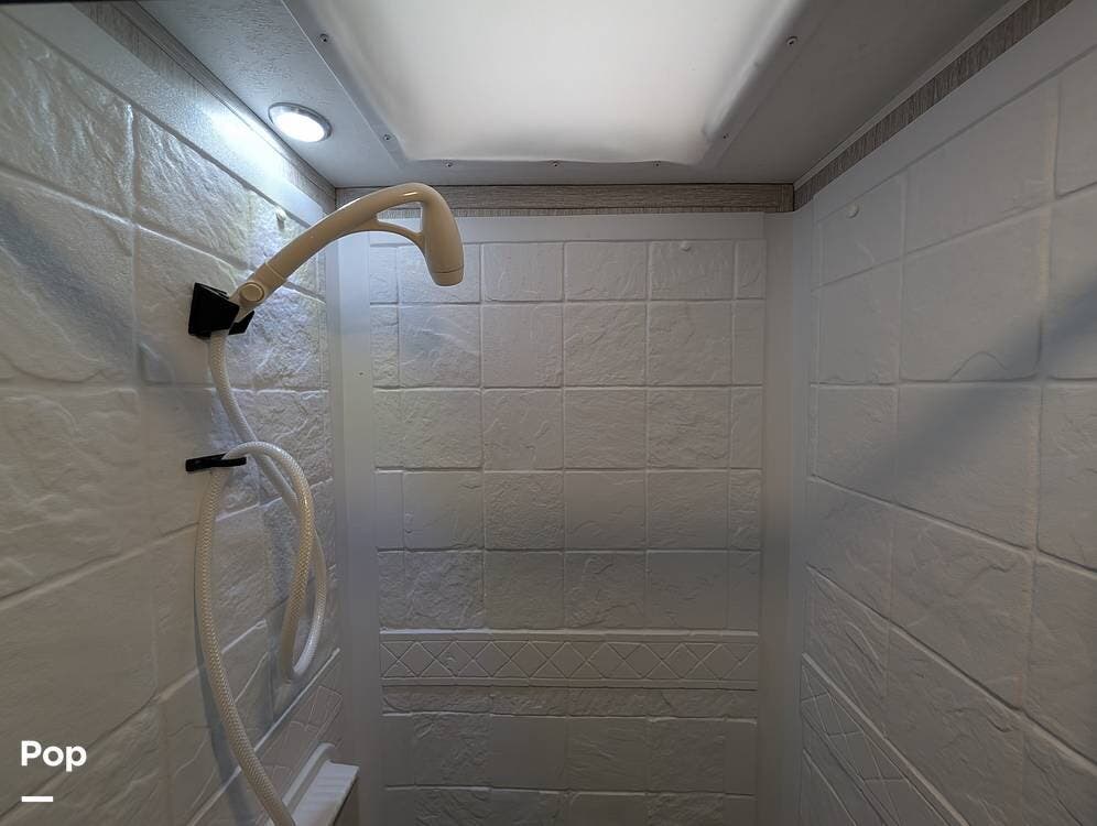 The kitchen is well equipped with a 12-volt refrigerator/freezer, microwave, stove, and ample cabinetry, making it easy to prepare meals on the road. The bathroom includes a spacious shower, along with a new oval porcelain toilet and new bathroom fan.