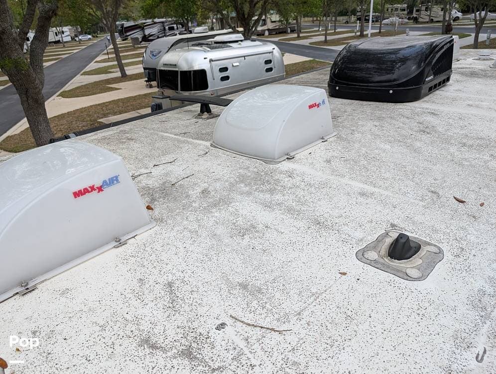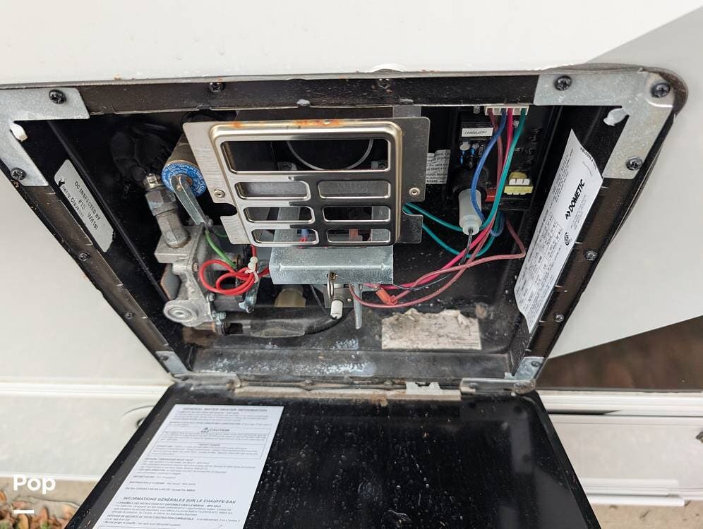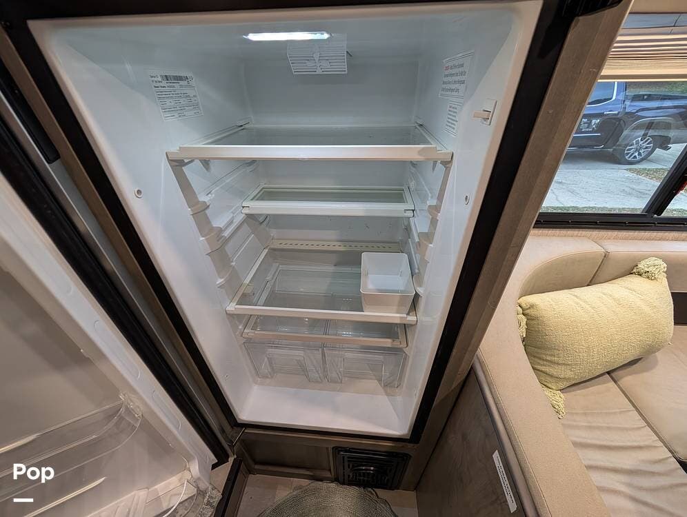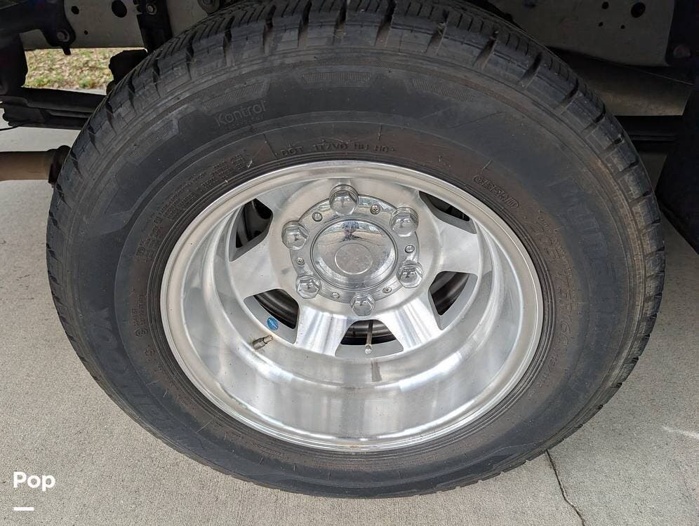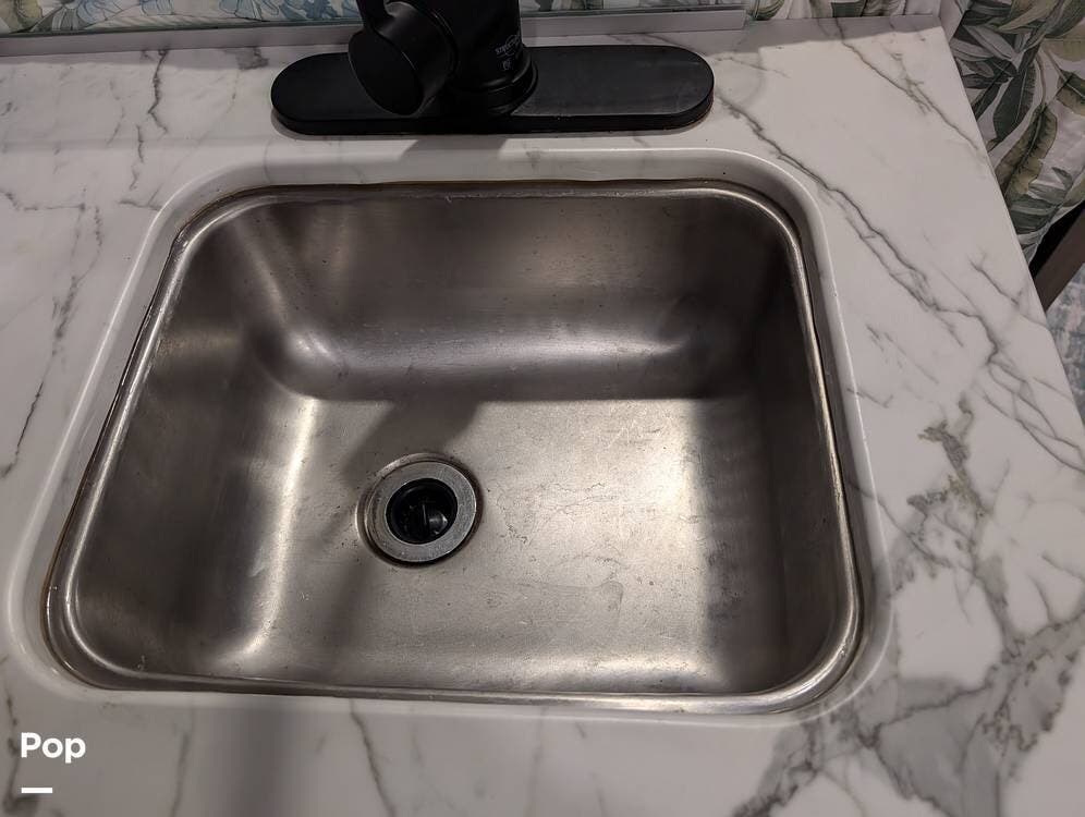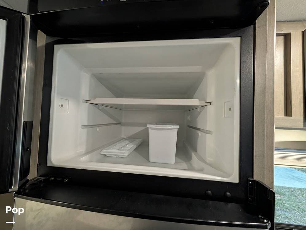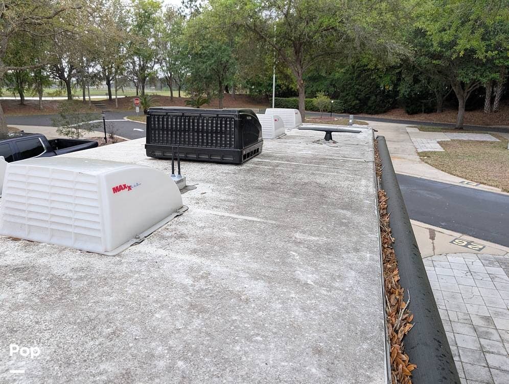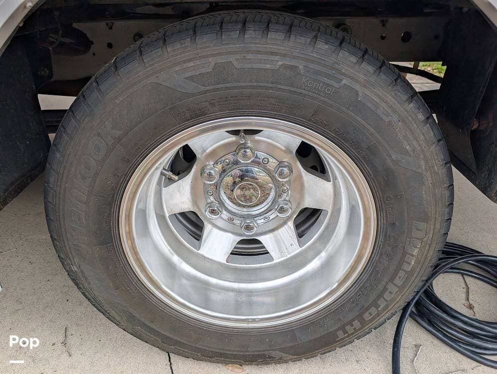 The kitchen is well equipped with a 12-volt refrigerator/freezer, microwave, stove, and ample cabinetry, making it easy to prepare meals on the road. The bathroom includes a spacious shower, along with a new oval porcelain toilet and new bathroom fan.