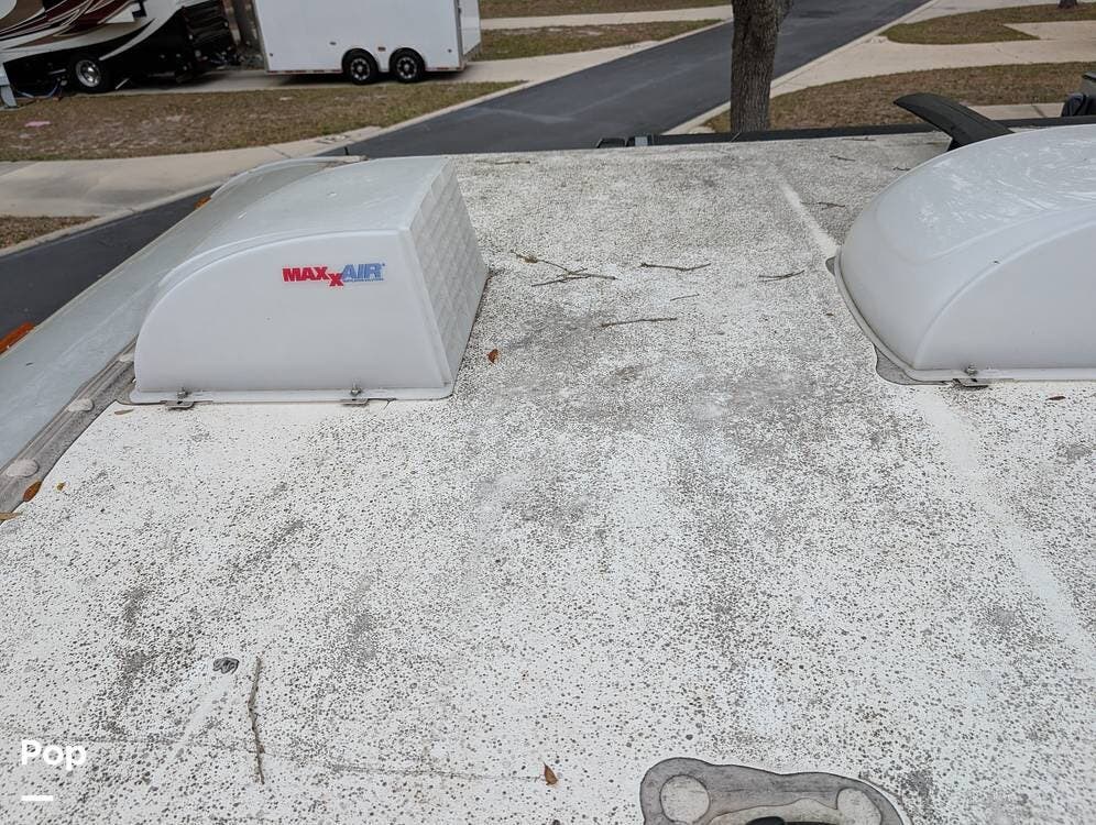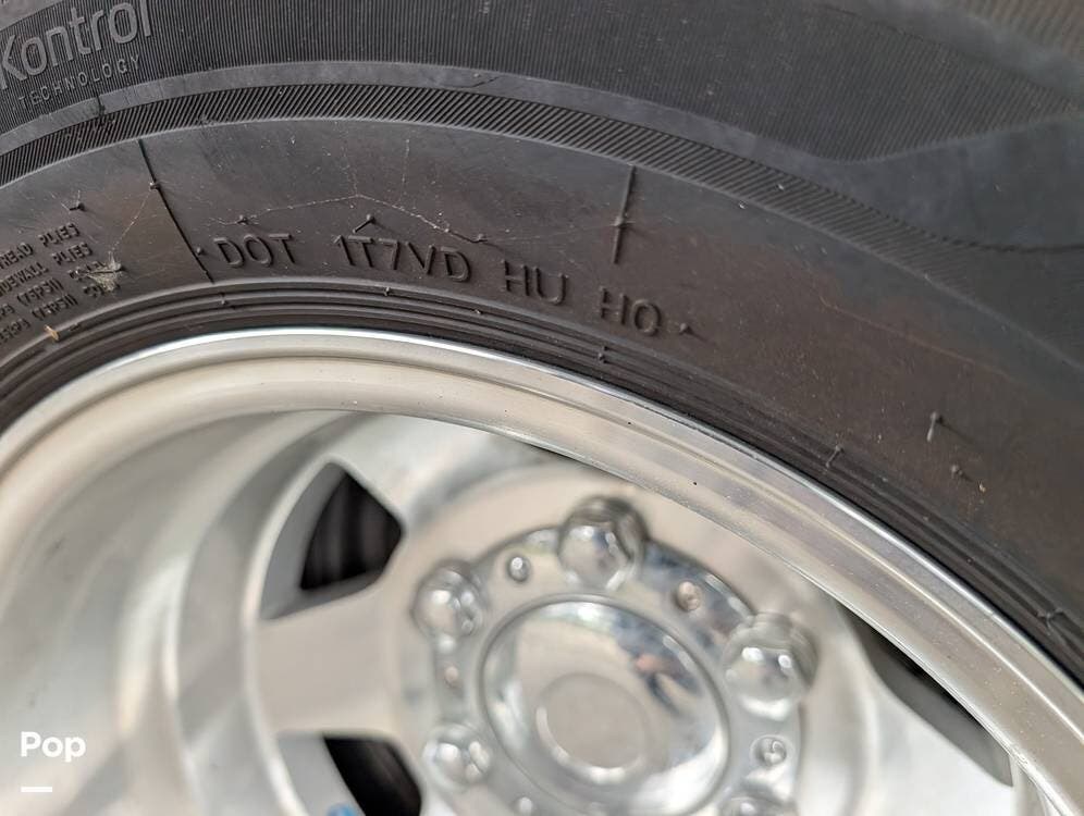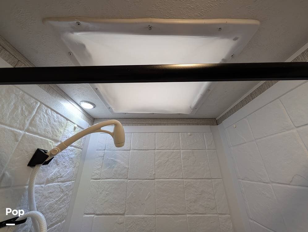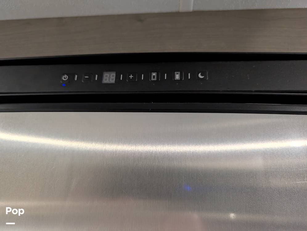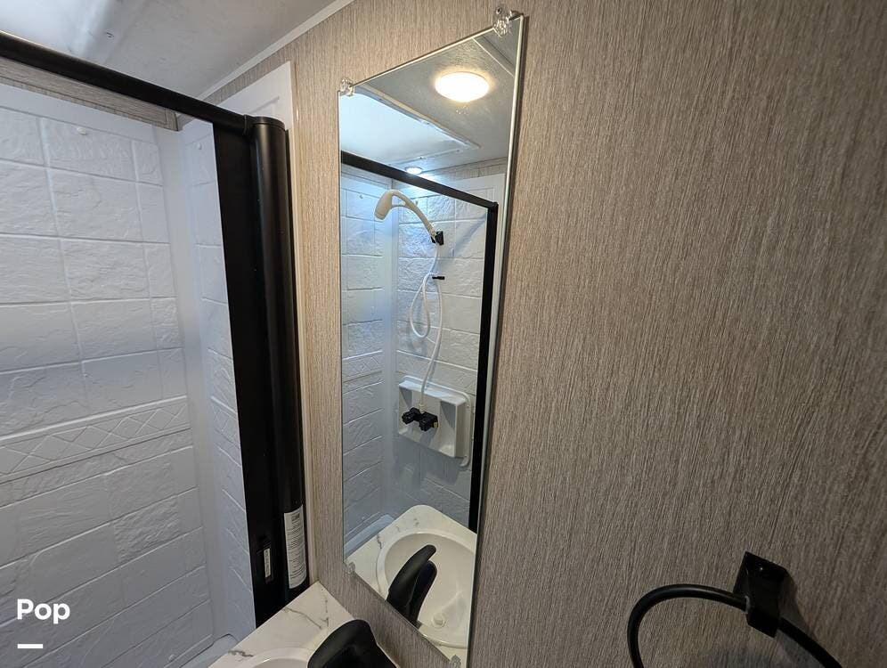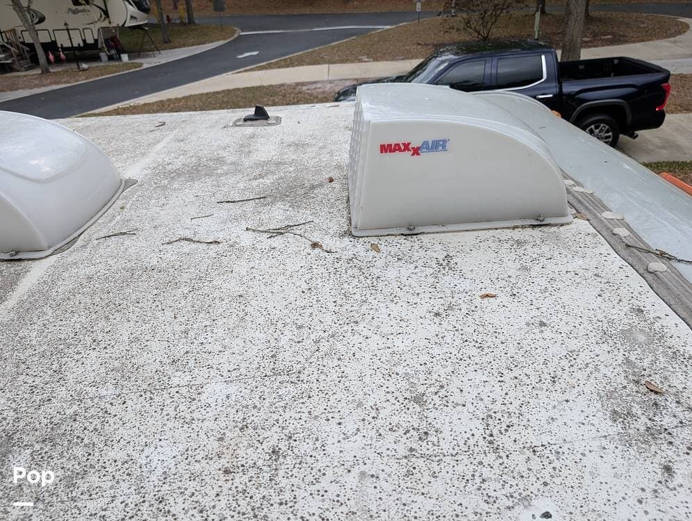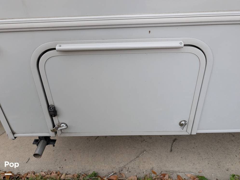 The kitchen is well equipped with a 12-volt refrigerator/freezer, microwave, stove, and ample cabinetry, making it easy to prepare meals on the road. The bathroom includes a spacious shower, along with a new oval porcelain toilet and new bathroom fan.